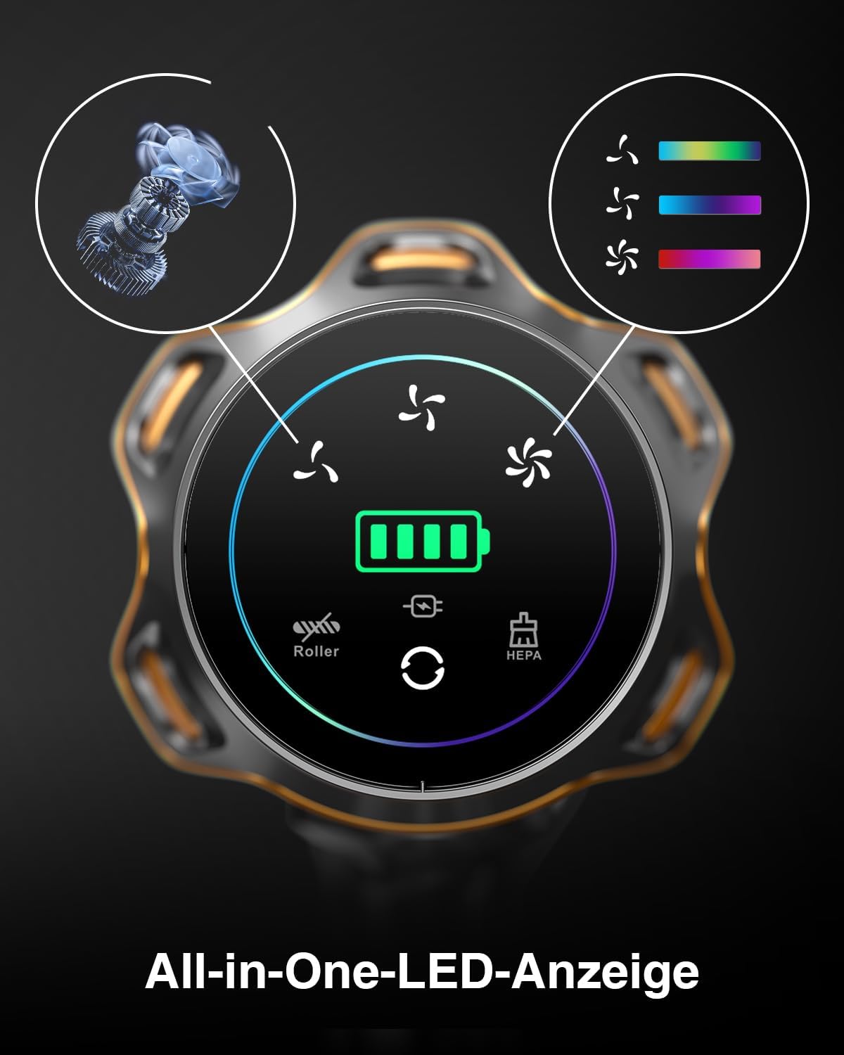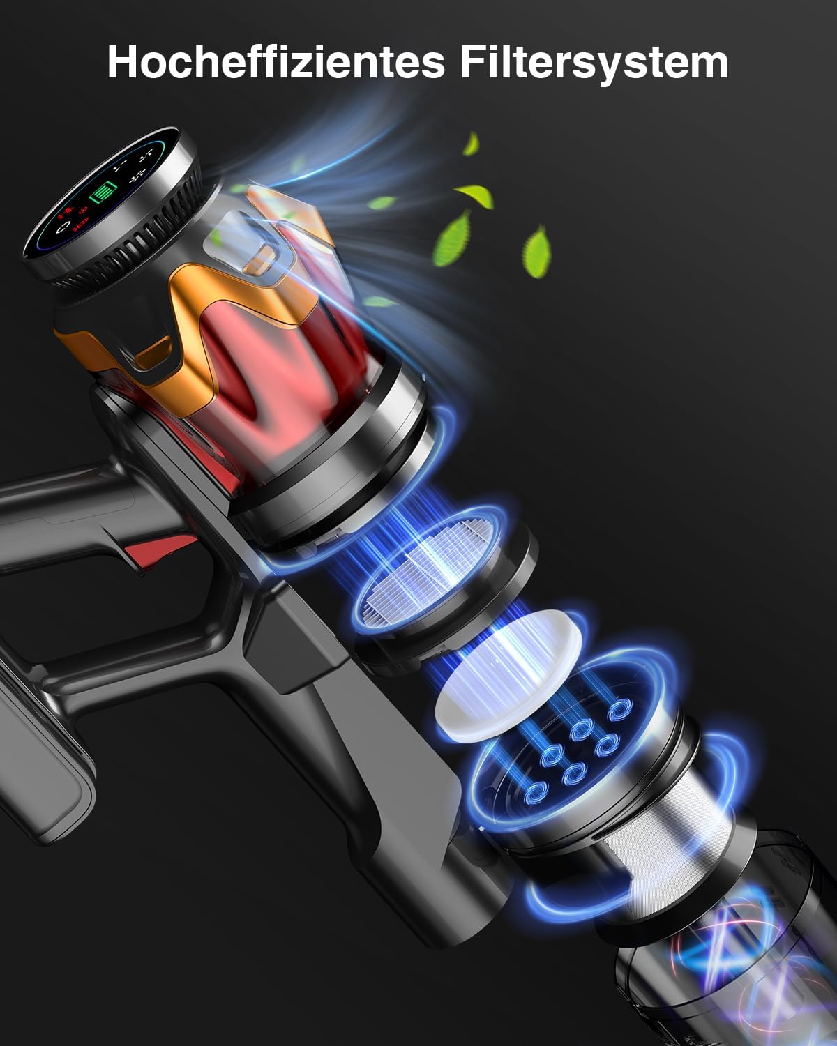 - 【99,99 % Hocheffiziente Filtration】 Der Kabelloser Staubsauger verfügt über 8 Schichten Präzisionsfiltration und eine Multi-Vortex-Struktur, um eine effiziente Zyklontrennung zu erreichen, 99,99 % der großen Partikel und winzigen Staubpartikel unter 0,3 μm strikt zu blockieren und eine Sekundärverschmutzung durch Rückfluss zu