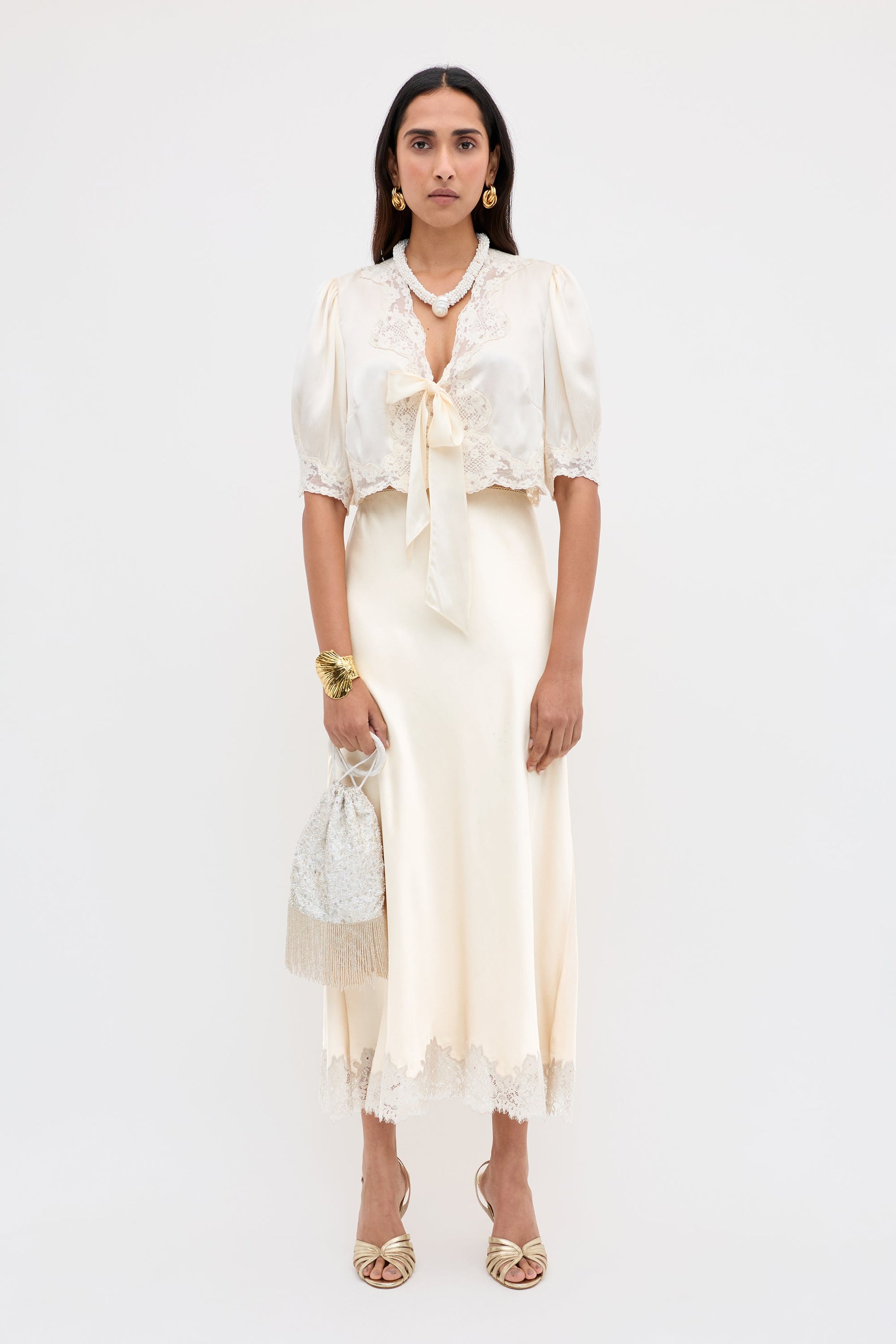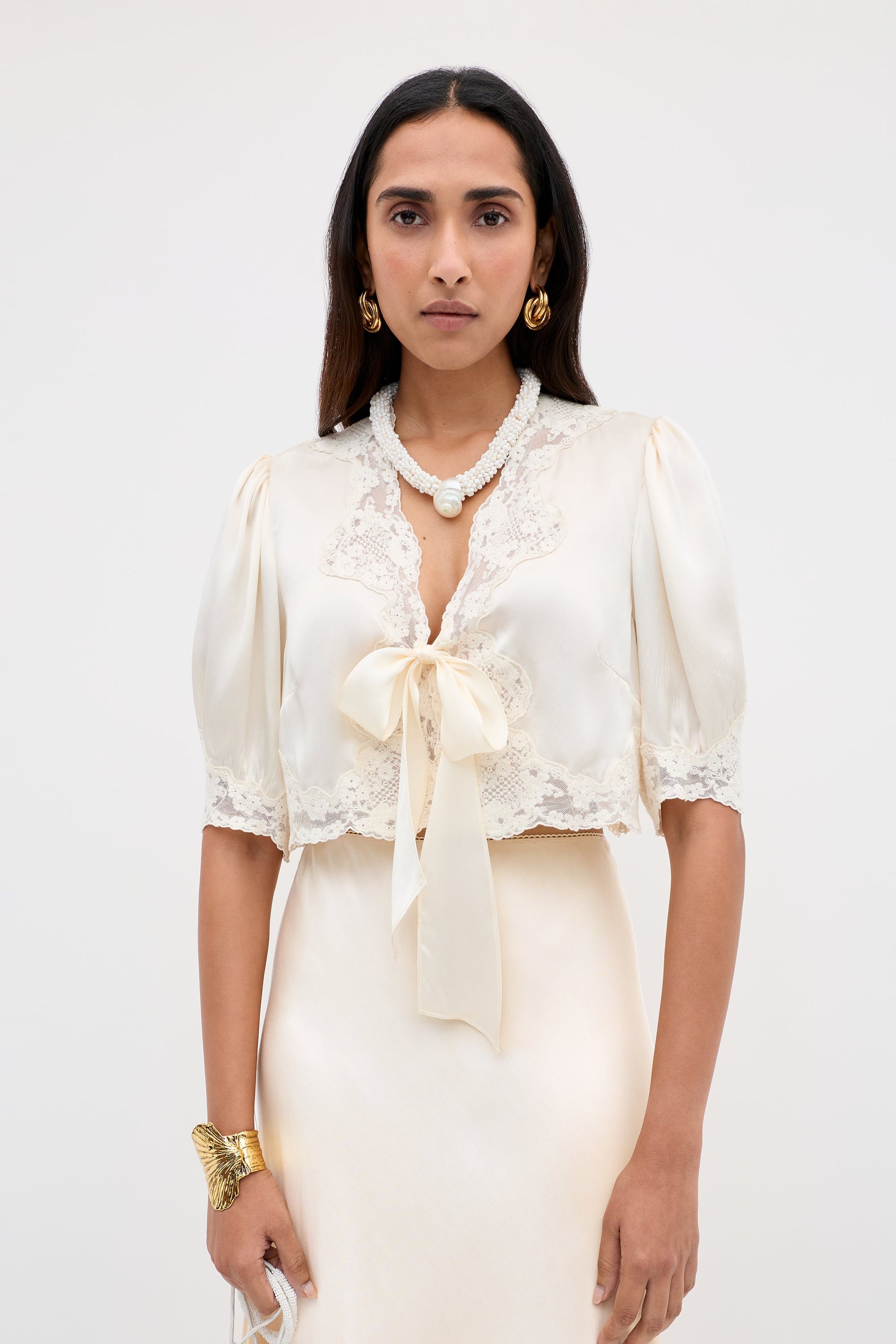 The thick lace on this Amara top is inspired by our Amara dress, though we've lengthened the sleeve and added pretty bows. The champagne silk-satin makes it a gorgeous layer for brides.