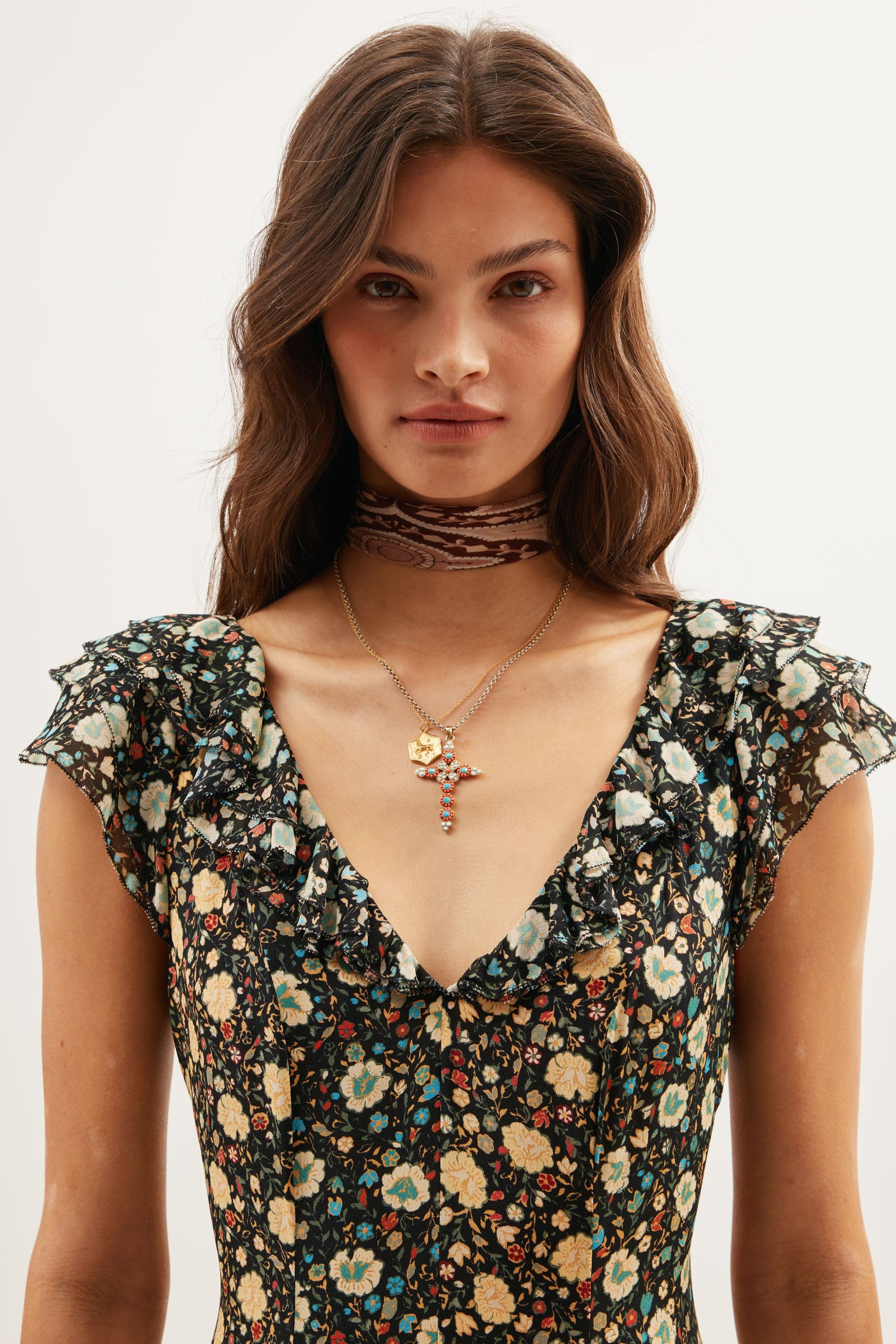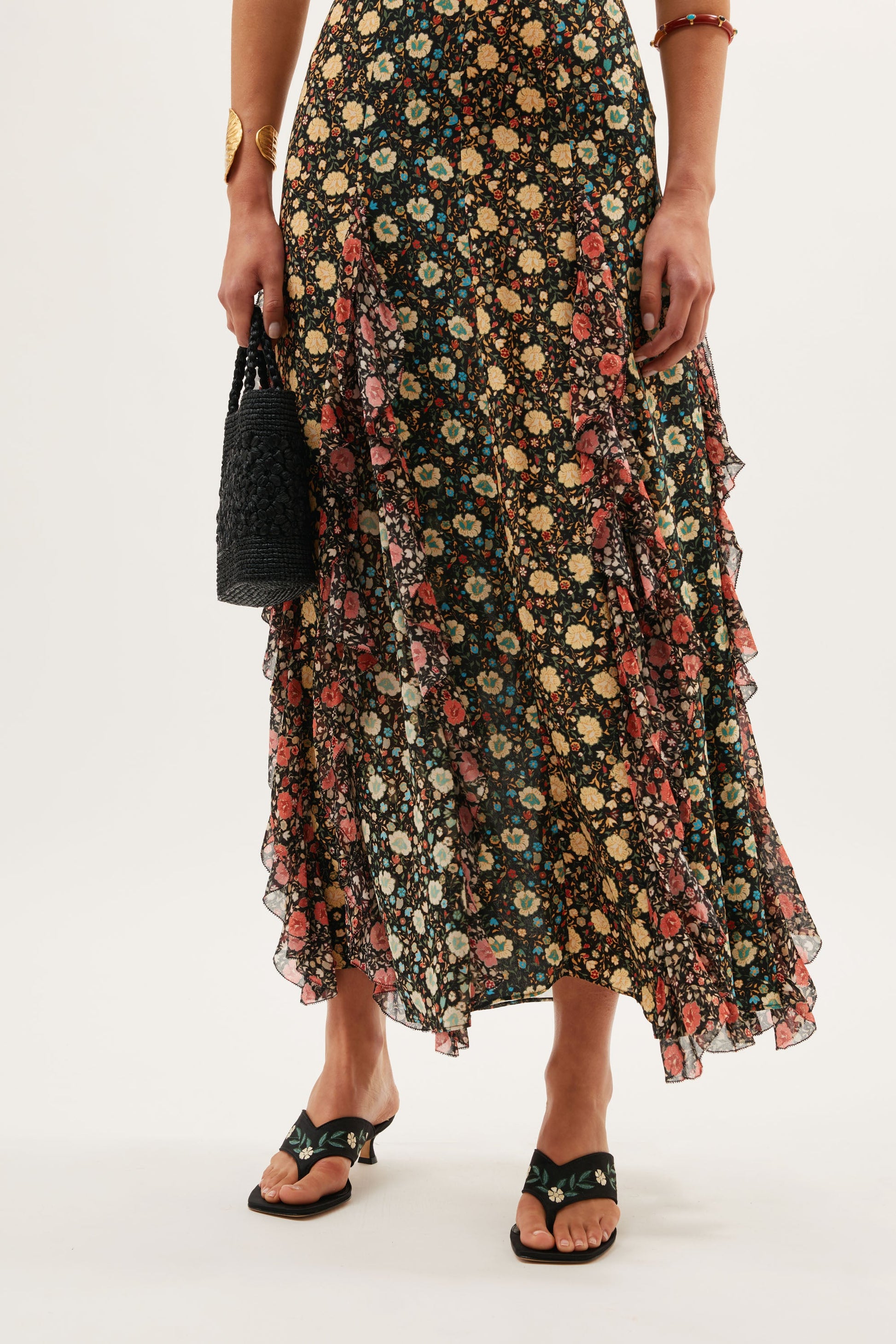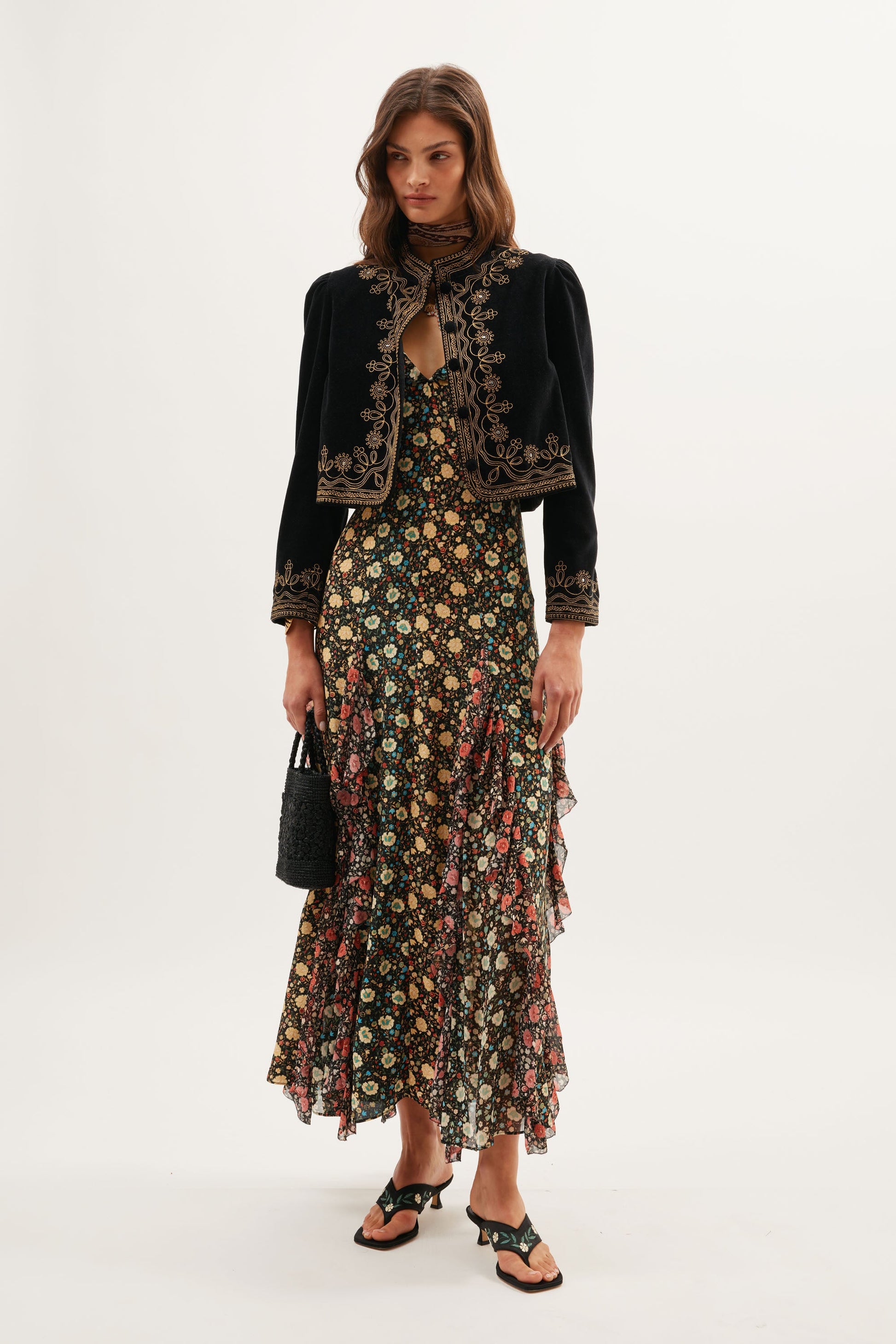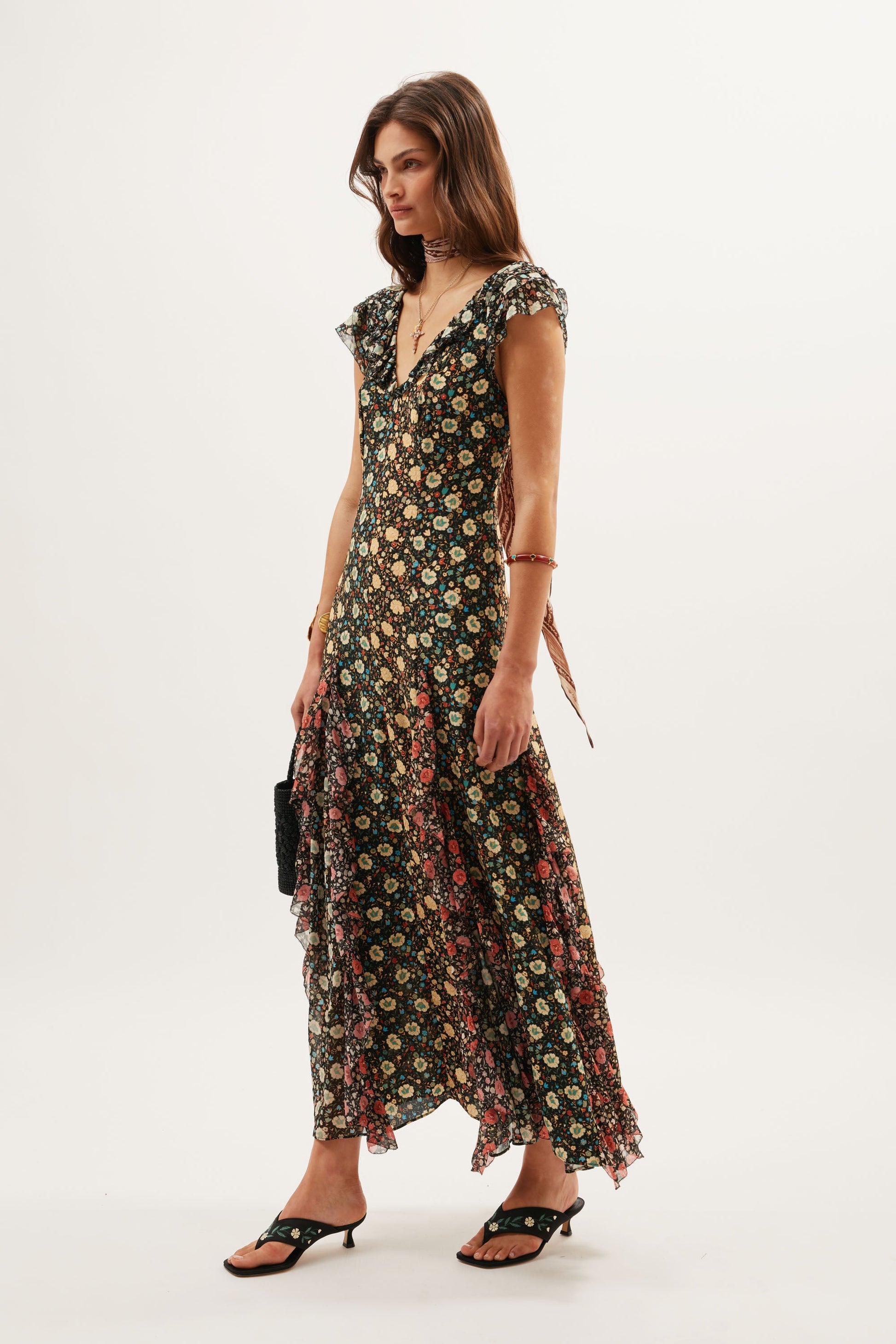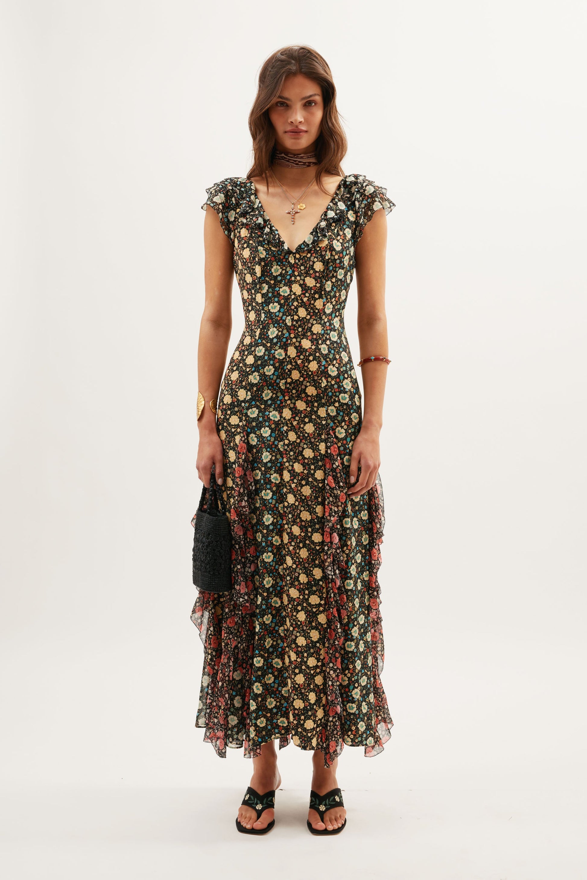 This Ambika dress is a favourite new shape. The fabric is panelled through the waist for a close fit then flares out at the ruffled skirt for movement that is made for dancing.