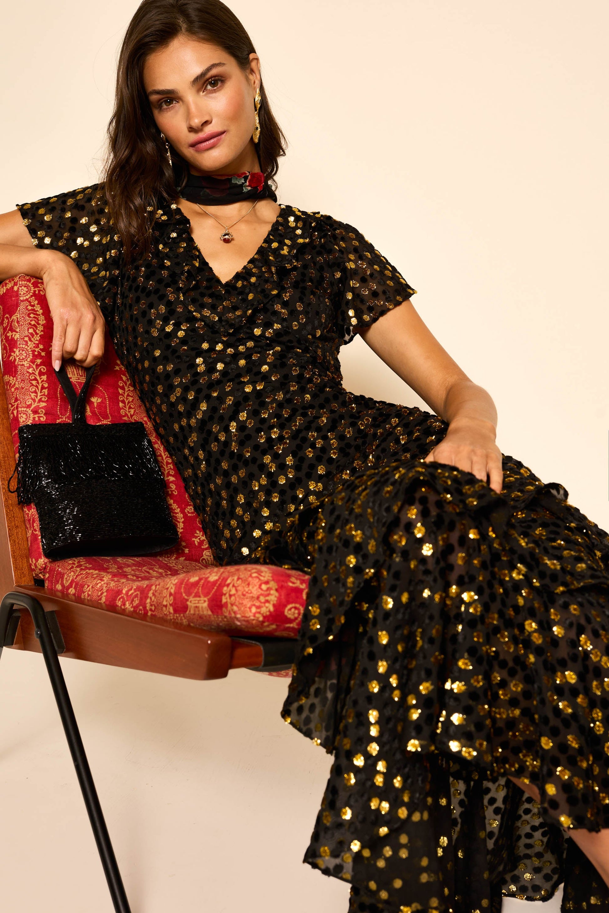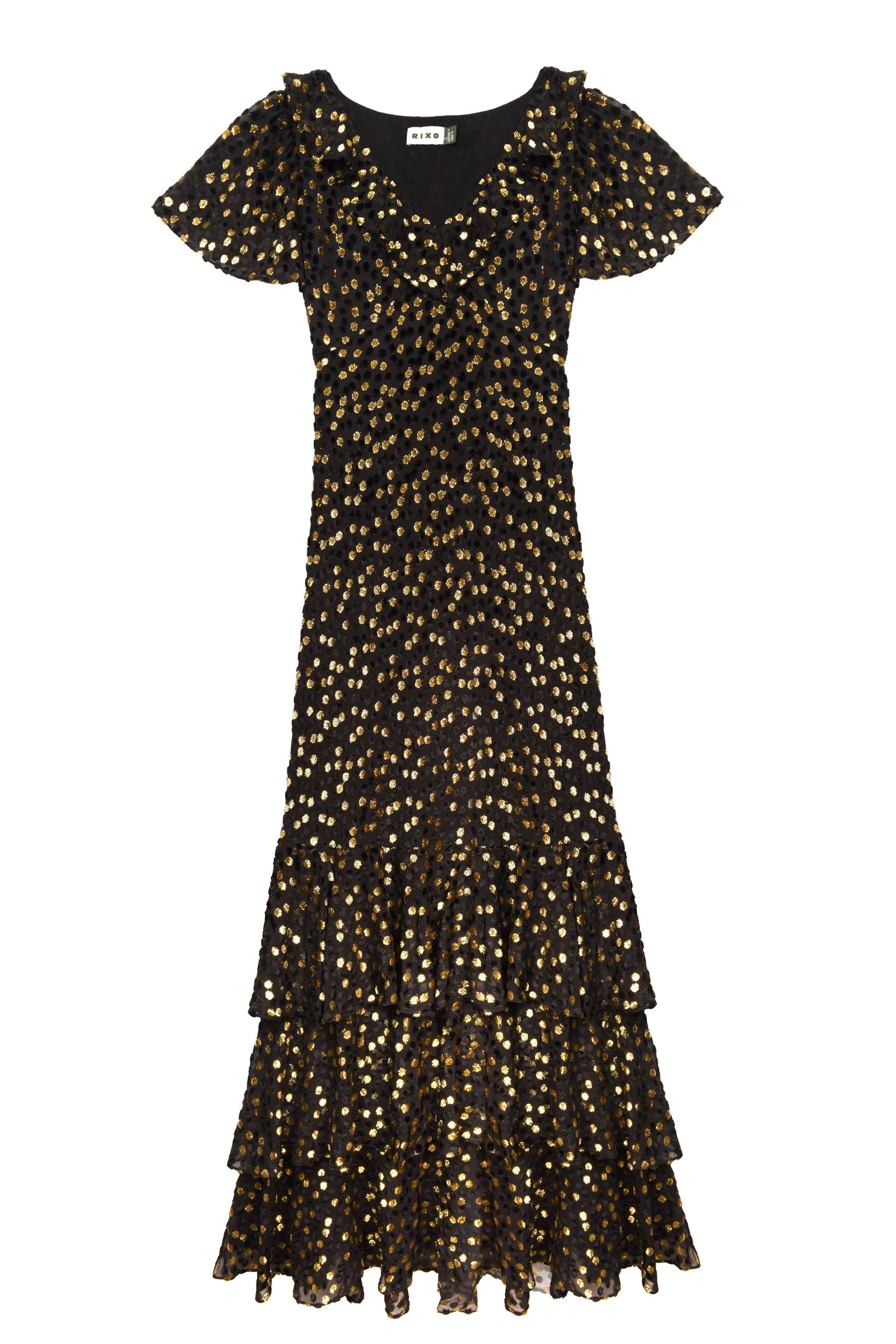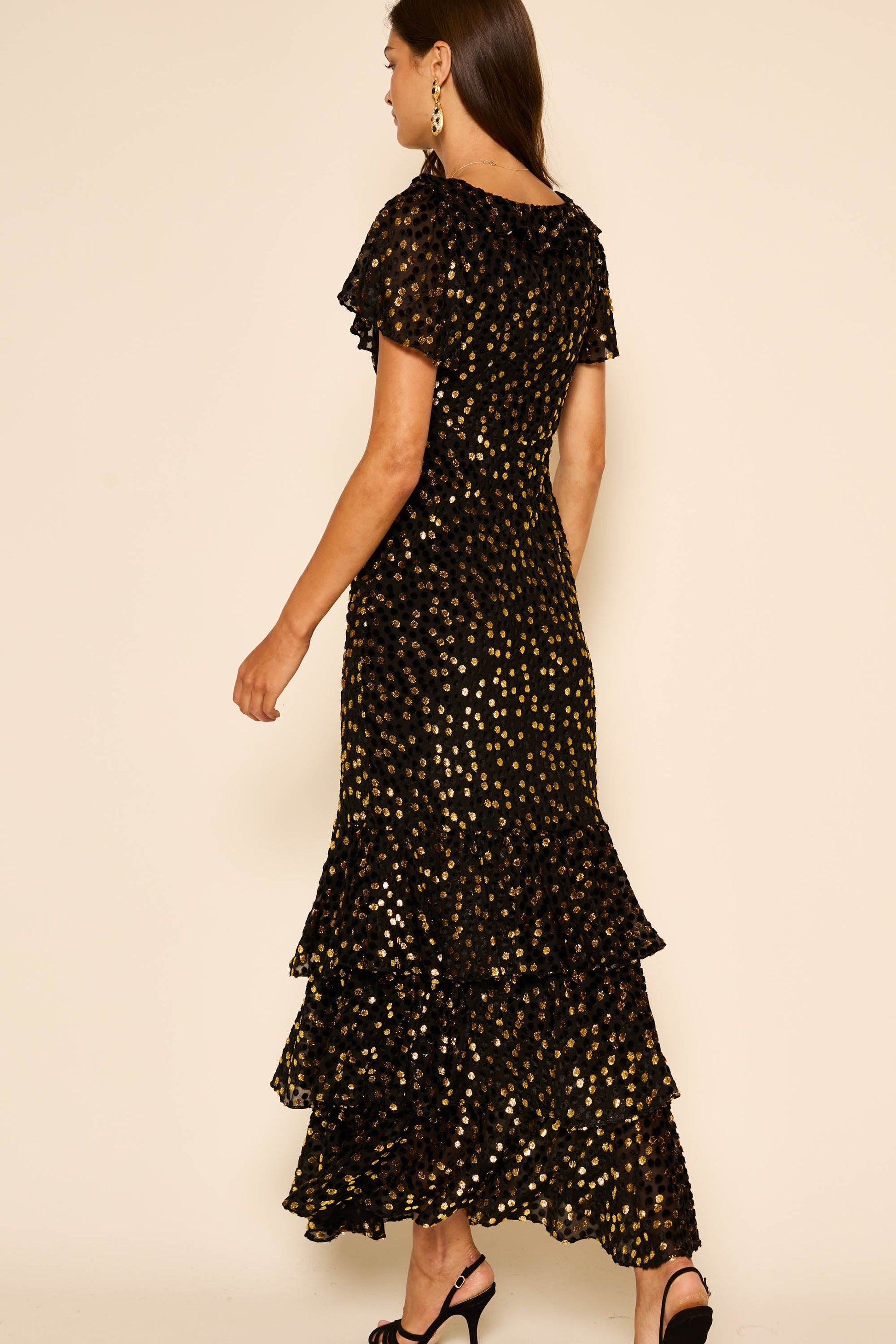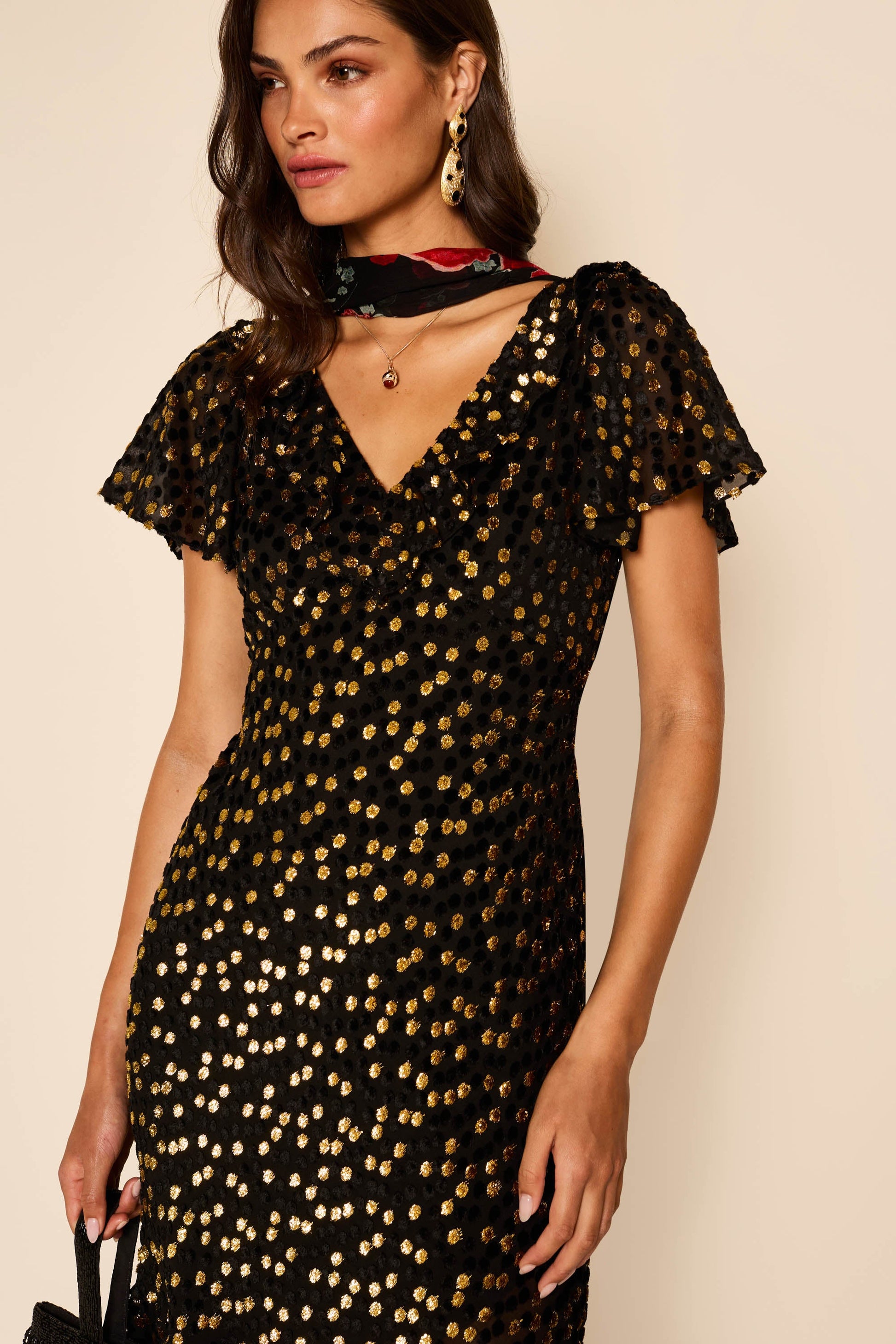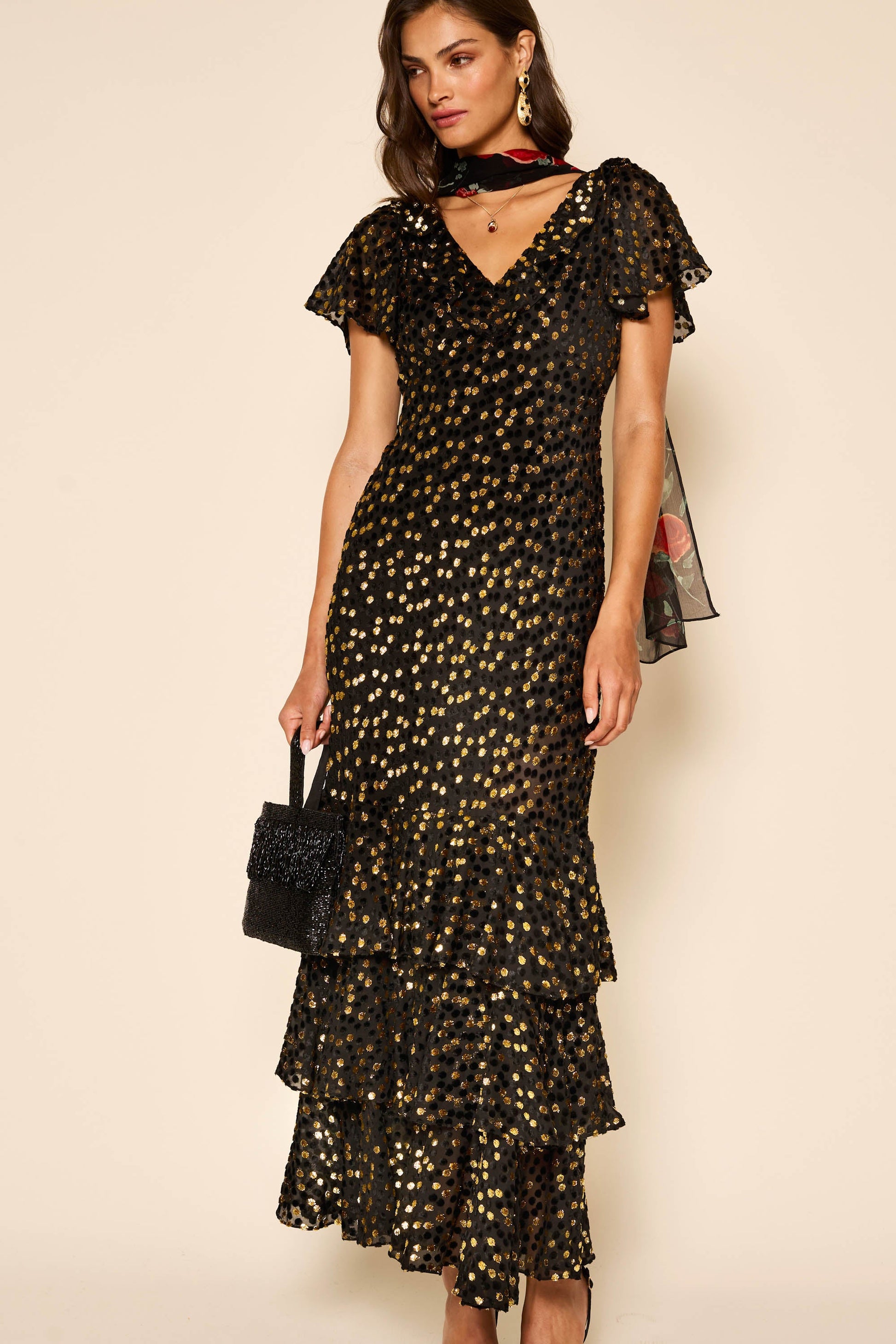 Amelle is the perfect 1930s-inspired gown, cut on the bias so the velvet Lurex skims over the hips. The fluted sleeves and V-neckline are ideal if you don't want anything too revealing.
