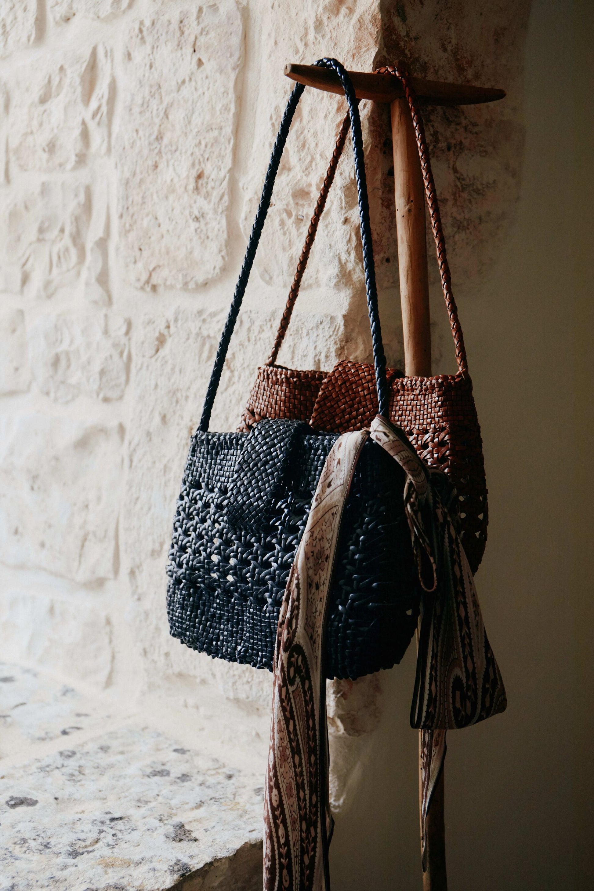We looked to vintage woven bags for inspiration for our collaboration with Dragon Diffusion. This Amoria bag is the perfect everyday size, big enough for your phone and purse. Try knotting a scarf to the handle.