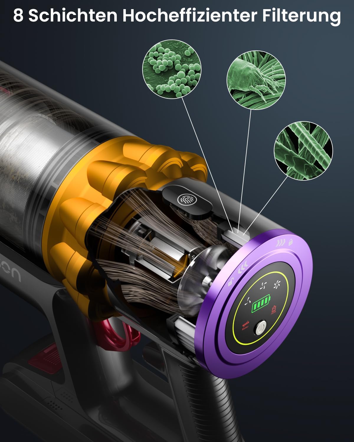 - 【45000PA Supersaugleistung】 Der staubsauger akku Stars 5 verwendet eine spezielle Geräuschreduzierungstechnologie (Geräusch <62 dB), die Ihre Familie und Haustiere vor harten Geräuschen schützen kann, selbst wenn der 550-W-Motor mit hoher Geschwindigkeit arbeitet. Mit der leistungsstarken Saugleistung von bis zu 45000pa können große Ablagerungen und hartnäckige Flecken auf dem Boden, Tierhaare und Flusen auf dem Teppich sowie Staub und Ablagerungen in Ecken, dunklen Stellen, Wänden und hohen Stellen, die schwer zu reinigen sind, mühelos entfernt werden .