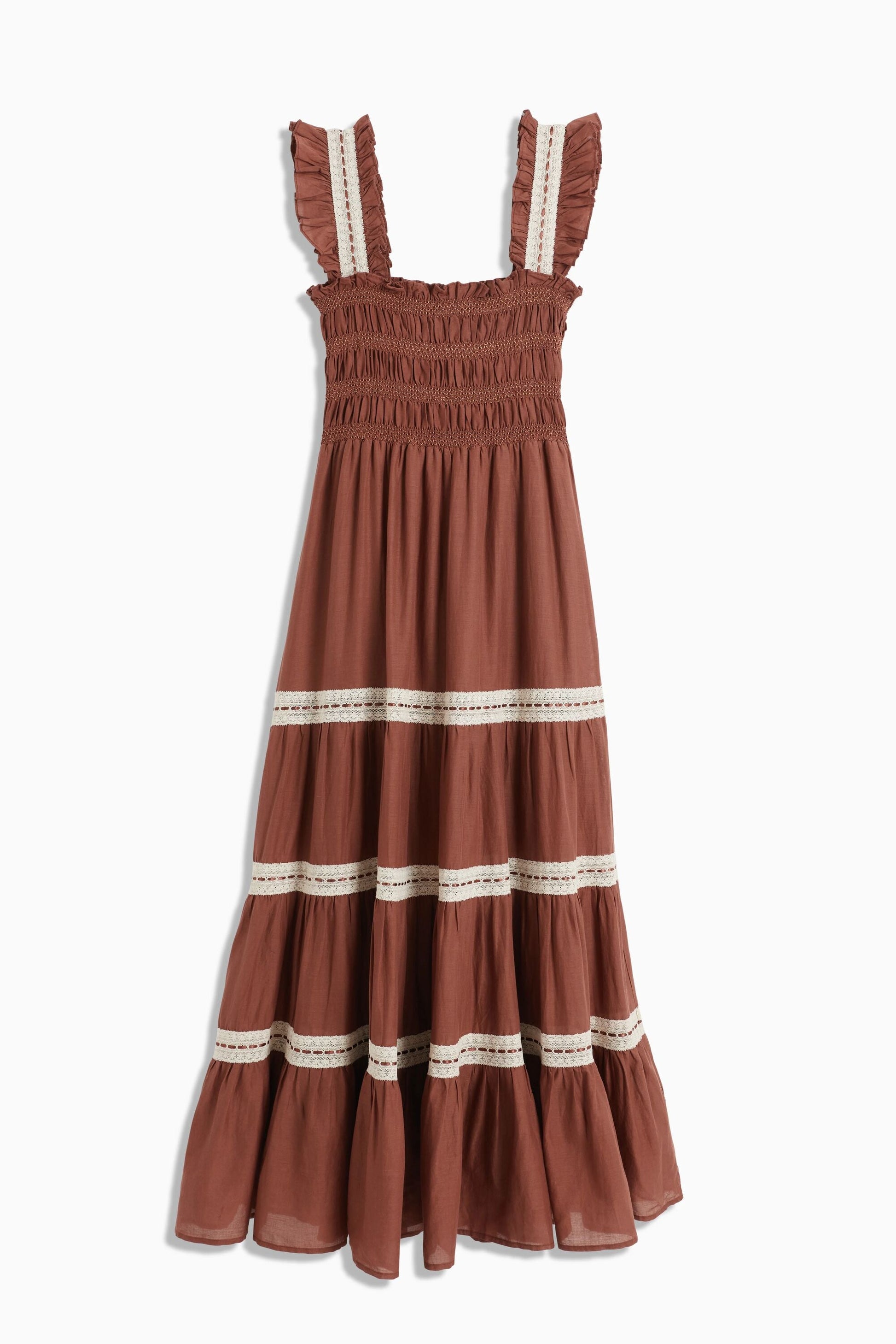 Our beloved Aubrie dress — now available in vintage-inspired brown. Our take on a 1970s nightdress, this breezy, lace crochet-detailed midi can be styled for evening sojourns or worn effortlessly in the day. Wear yours with our Milani Raffia Bag.