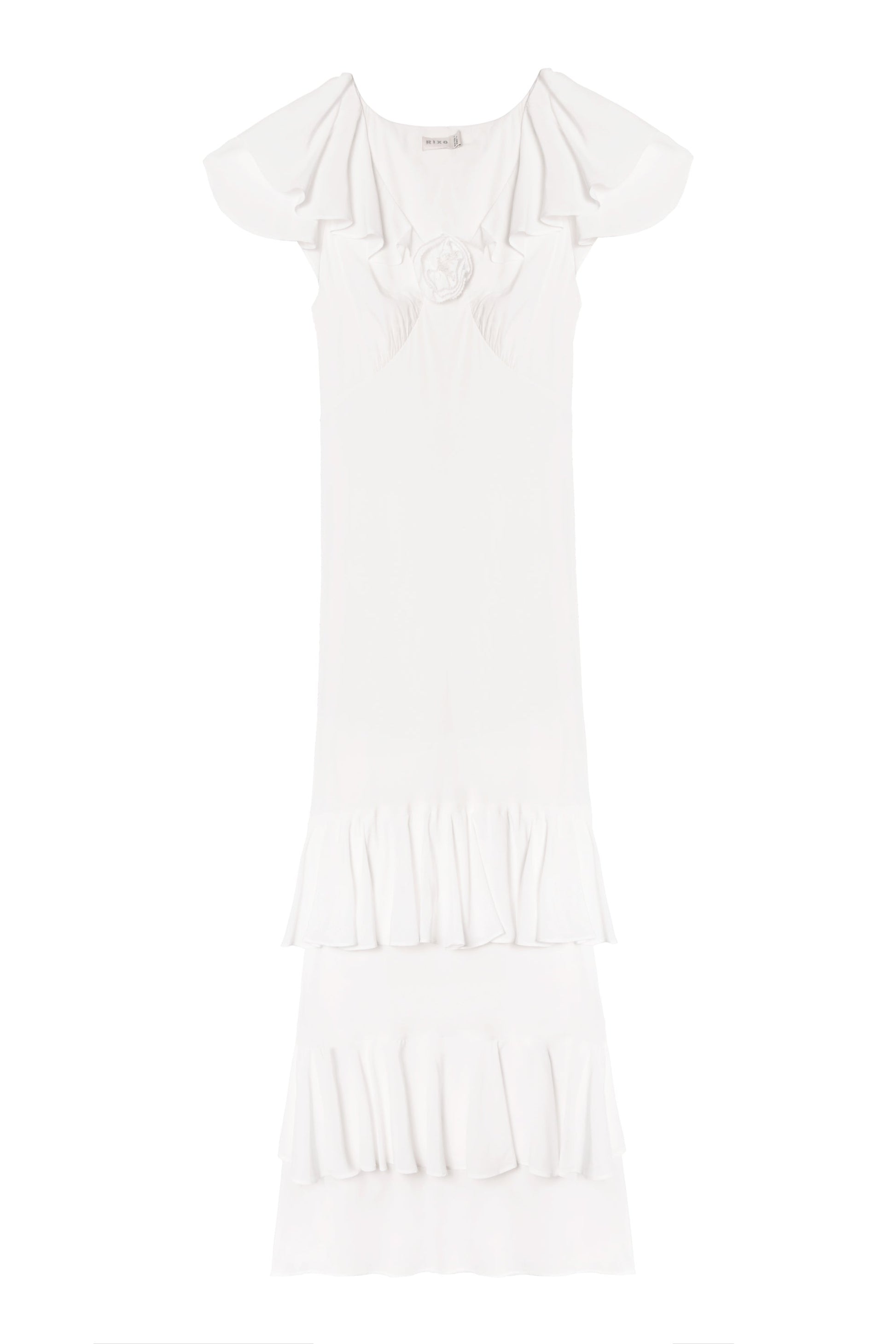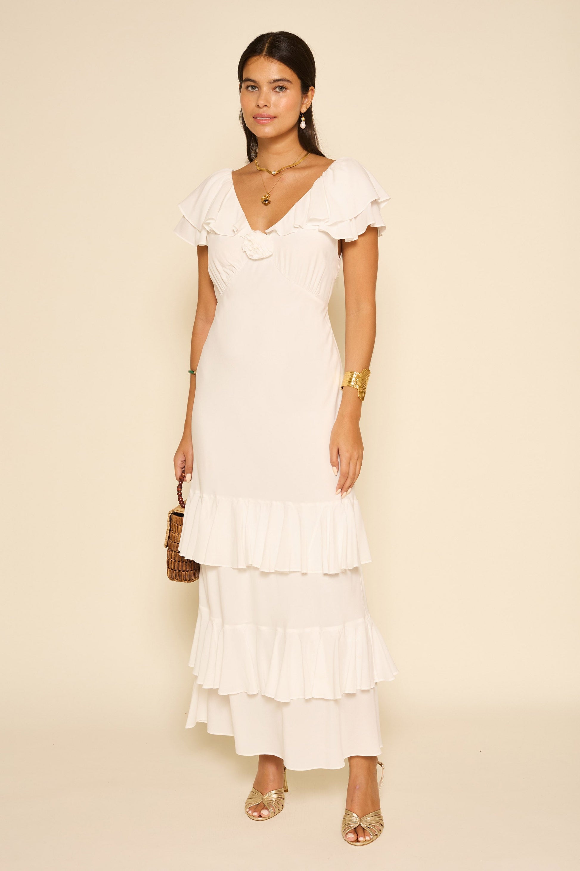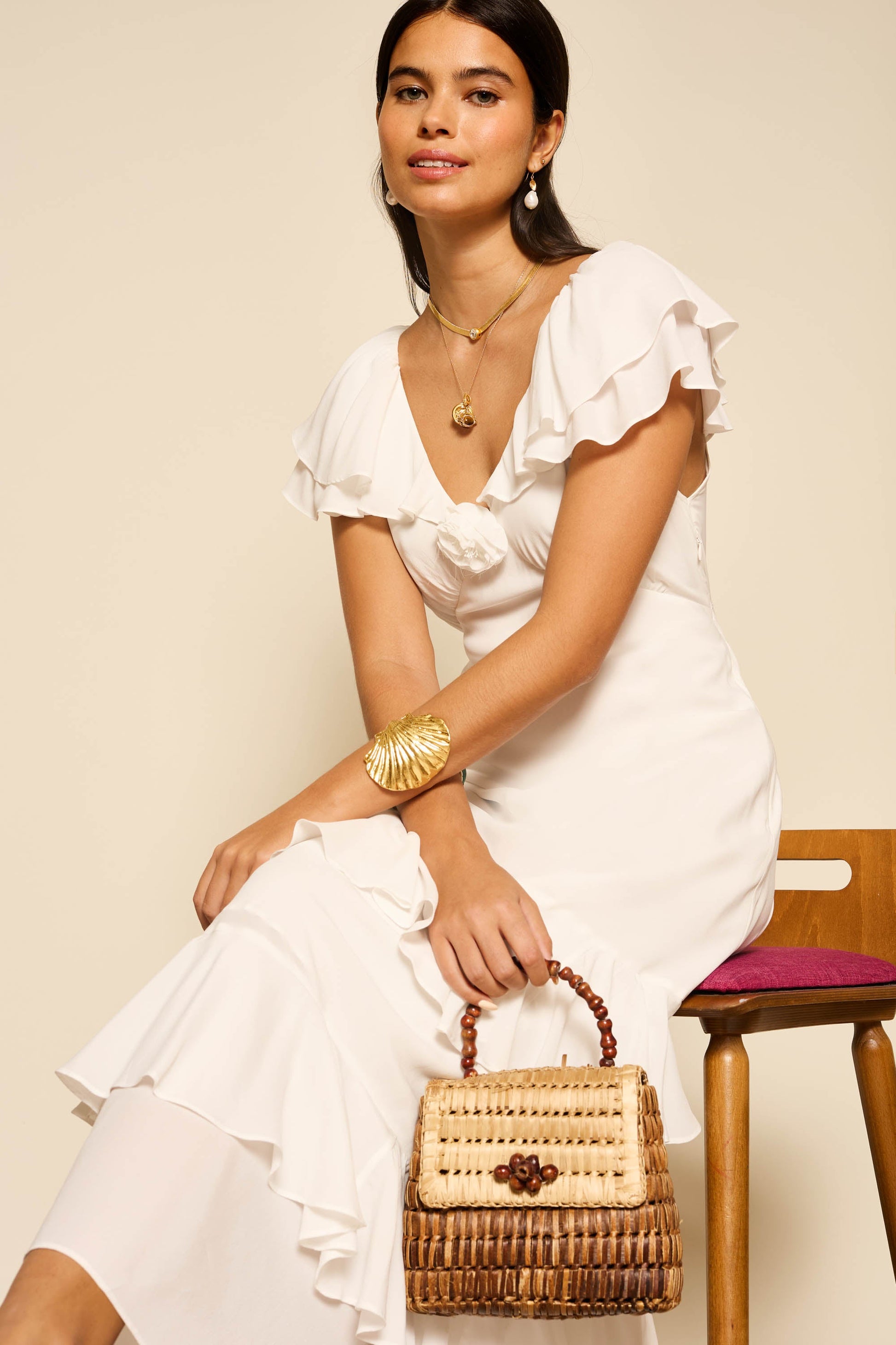 Our Benoite dress is especially feminine, with floaty ruffles and a corsage at the centre, inspired by vintage styles. It's made with touches of silk and has ties to draw in the waist.