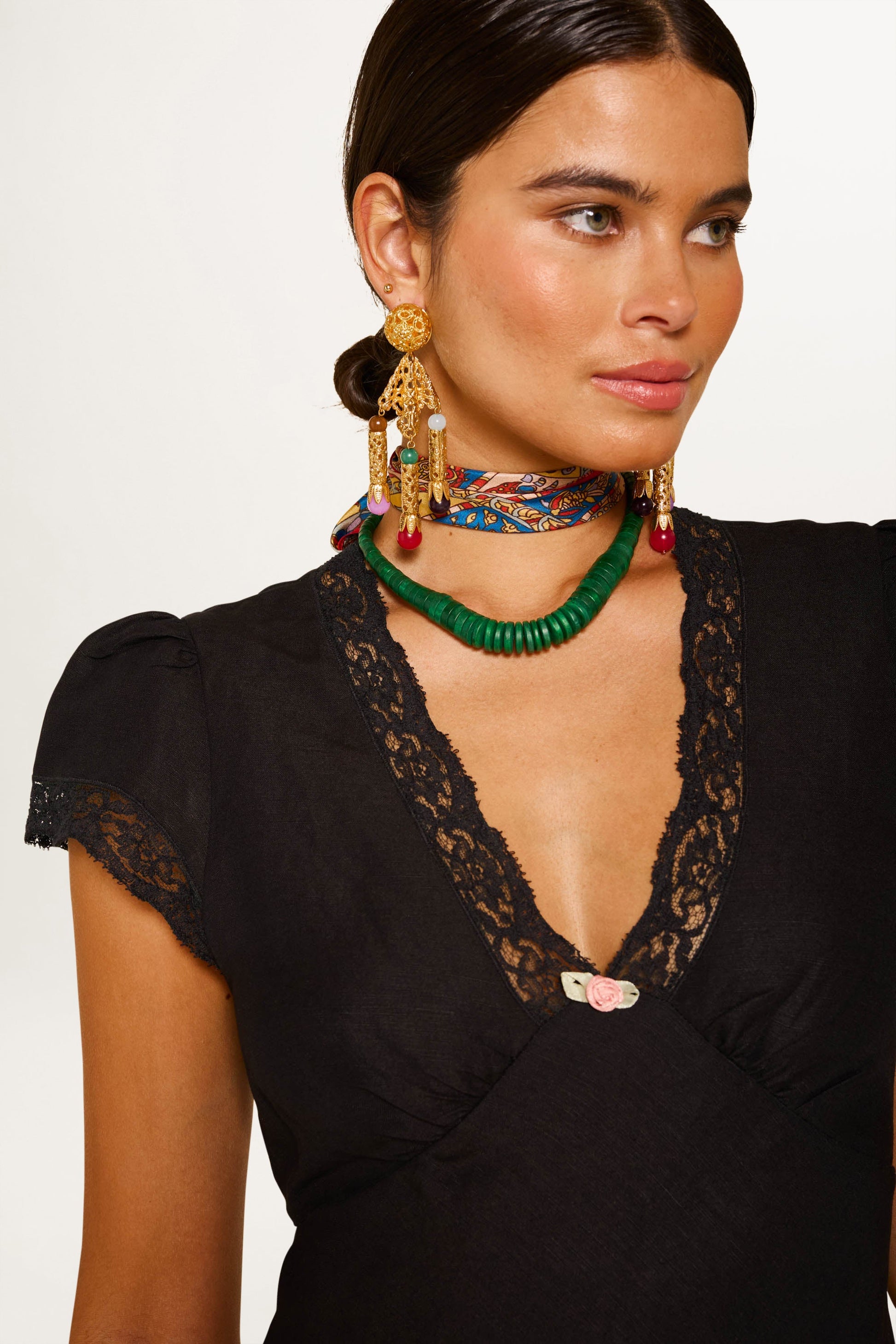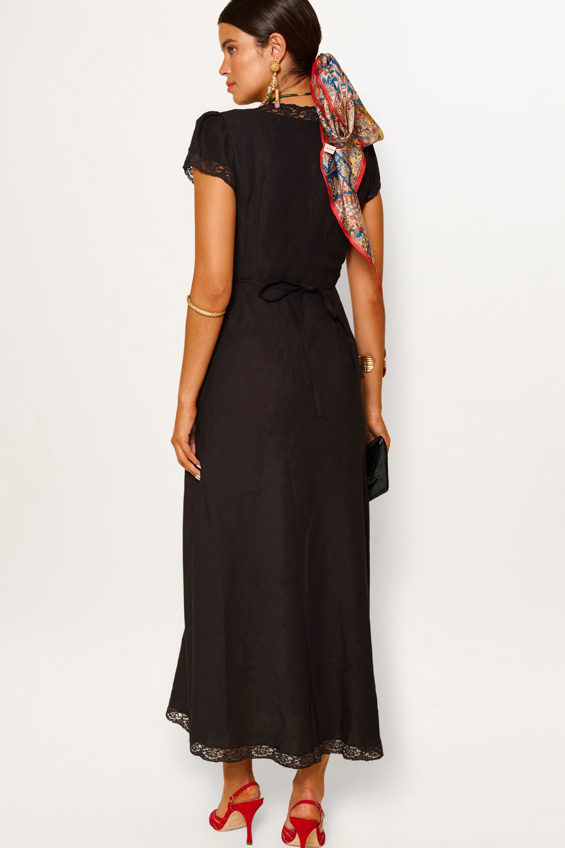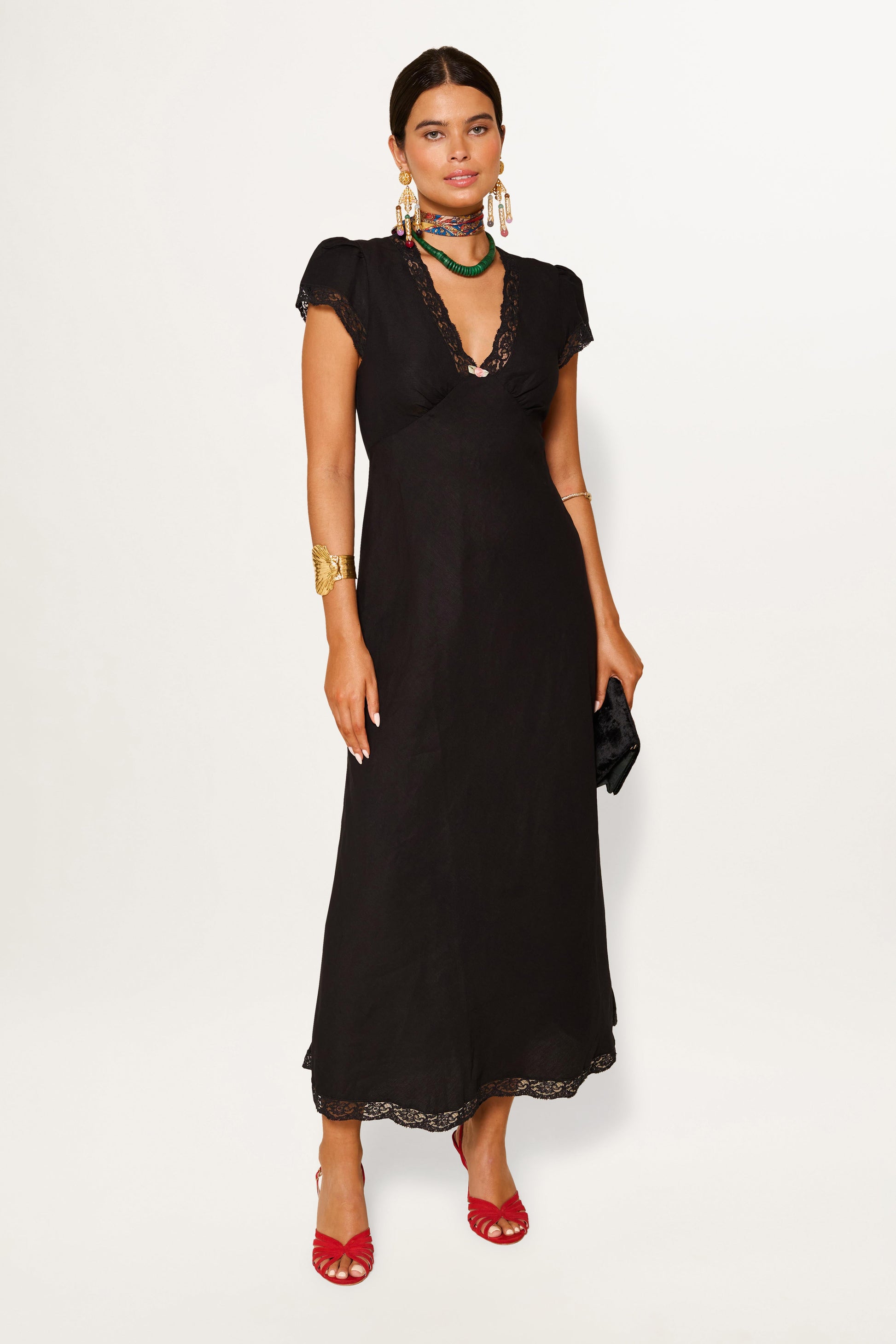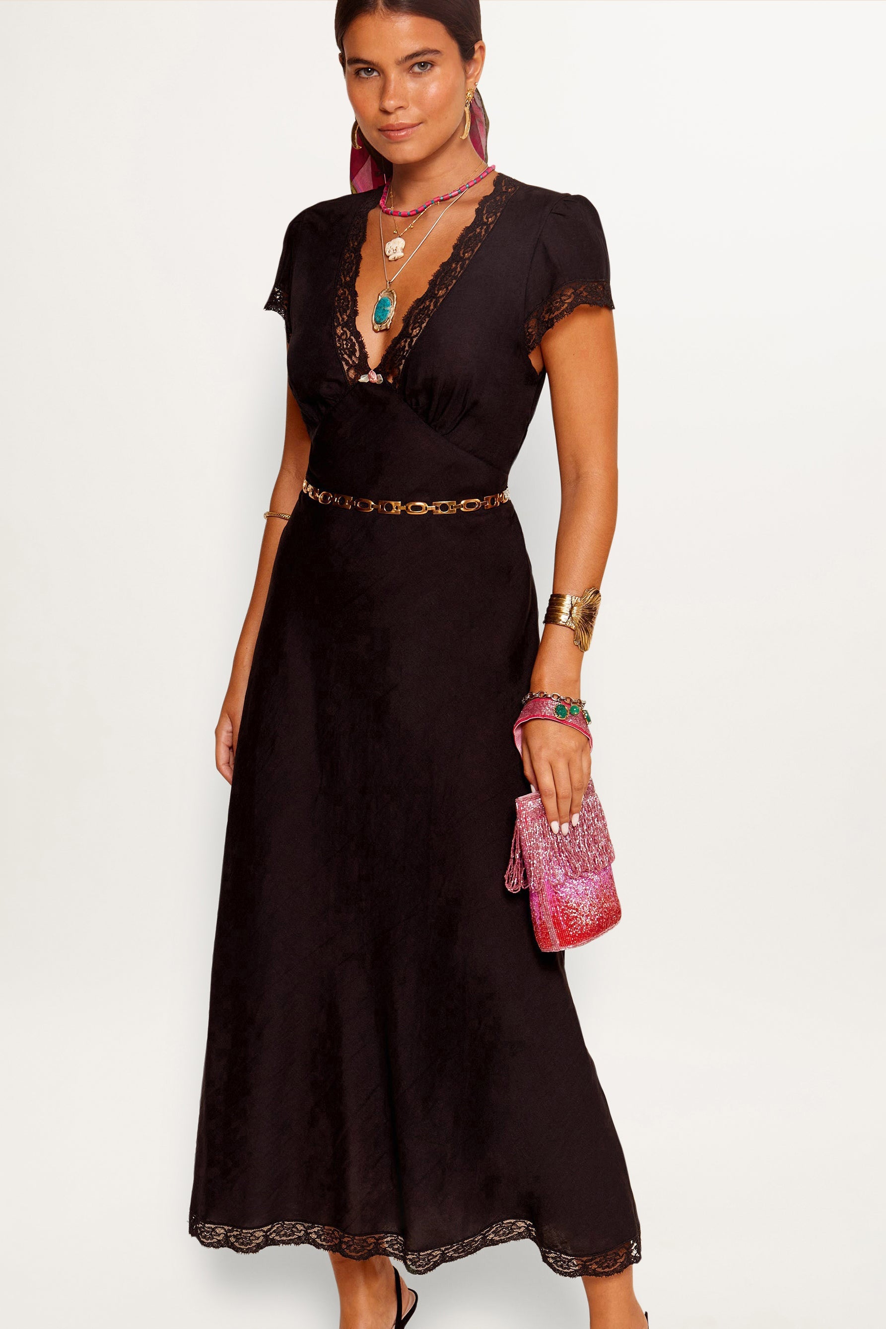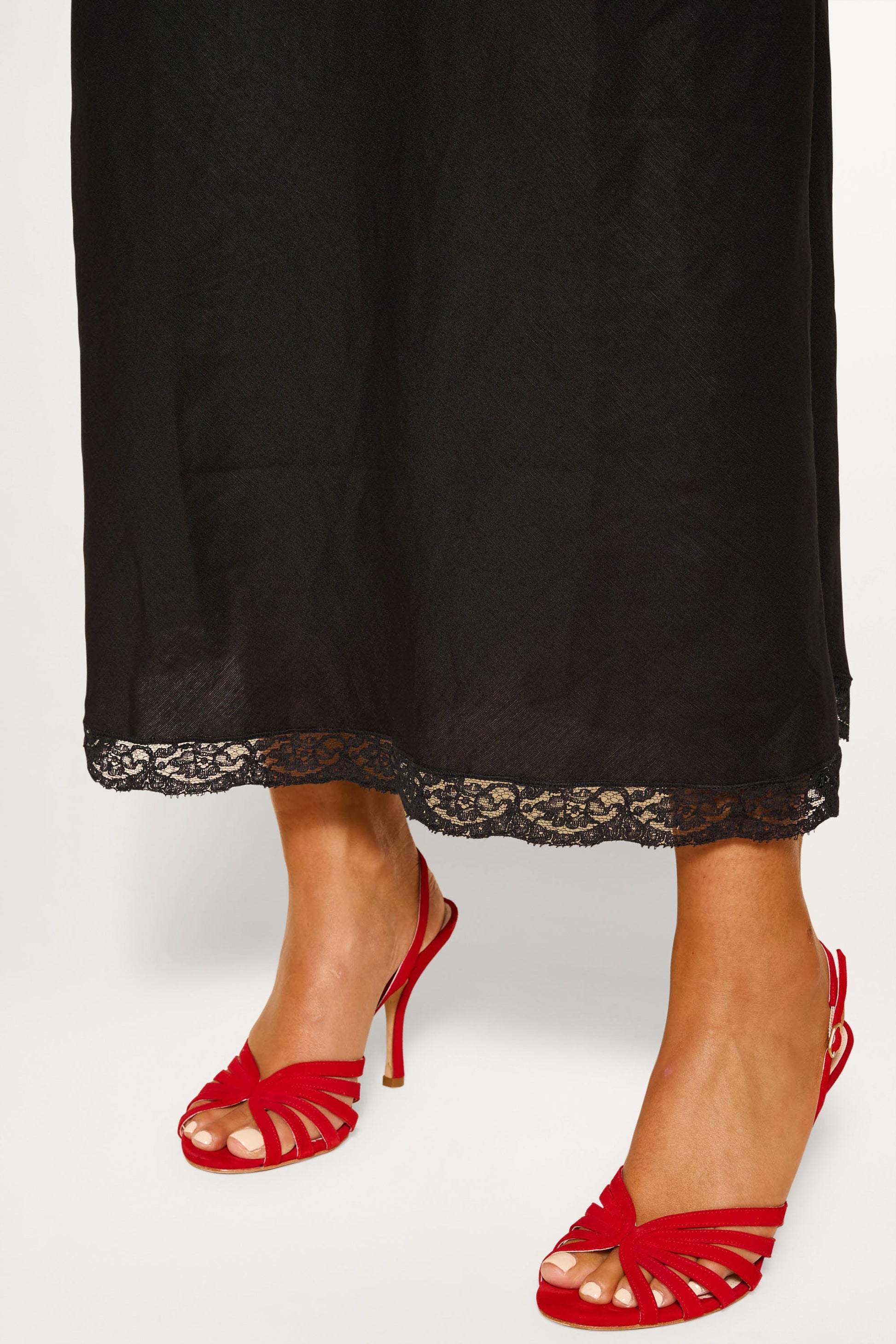 Every wardrobe needs a summery black dress like this Clarice midi. It's based on a vintage nightdress - you'll see the inspirations in the pretty lace and dainty rose trim.