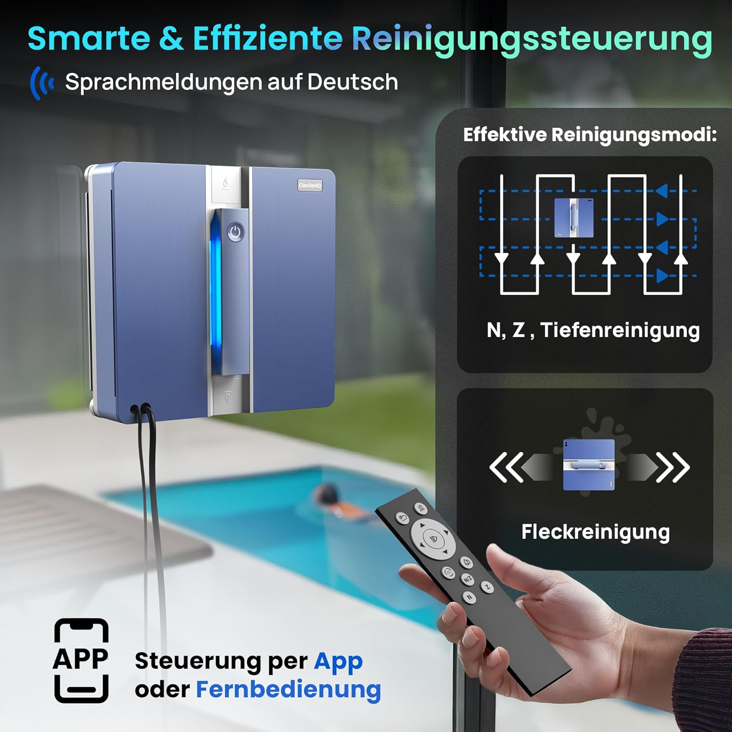 - đăAutomatische Fensterreinigungă: zeitsparend, effizient, ideal fĂŒr groĂe FensterflĂ€chen. Lehnen Sie sich zurĂŒck, wĂ€hrend der Fensterputzroboter die Arbeit ĂŒbernimmt! Durch intelligente Navigation erkennt der Fensterreiniger Hindernisse und kehrt selbststĂ€ndig zum Ausgangspunkt zurĂŒck. Ideal fĂŒr groĂe FensterflĂ€chen oder schwer erreichbare Fenster â so sparen Sie Zeit und haben mĂŒhelos saubere Fenster.