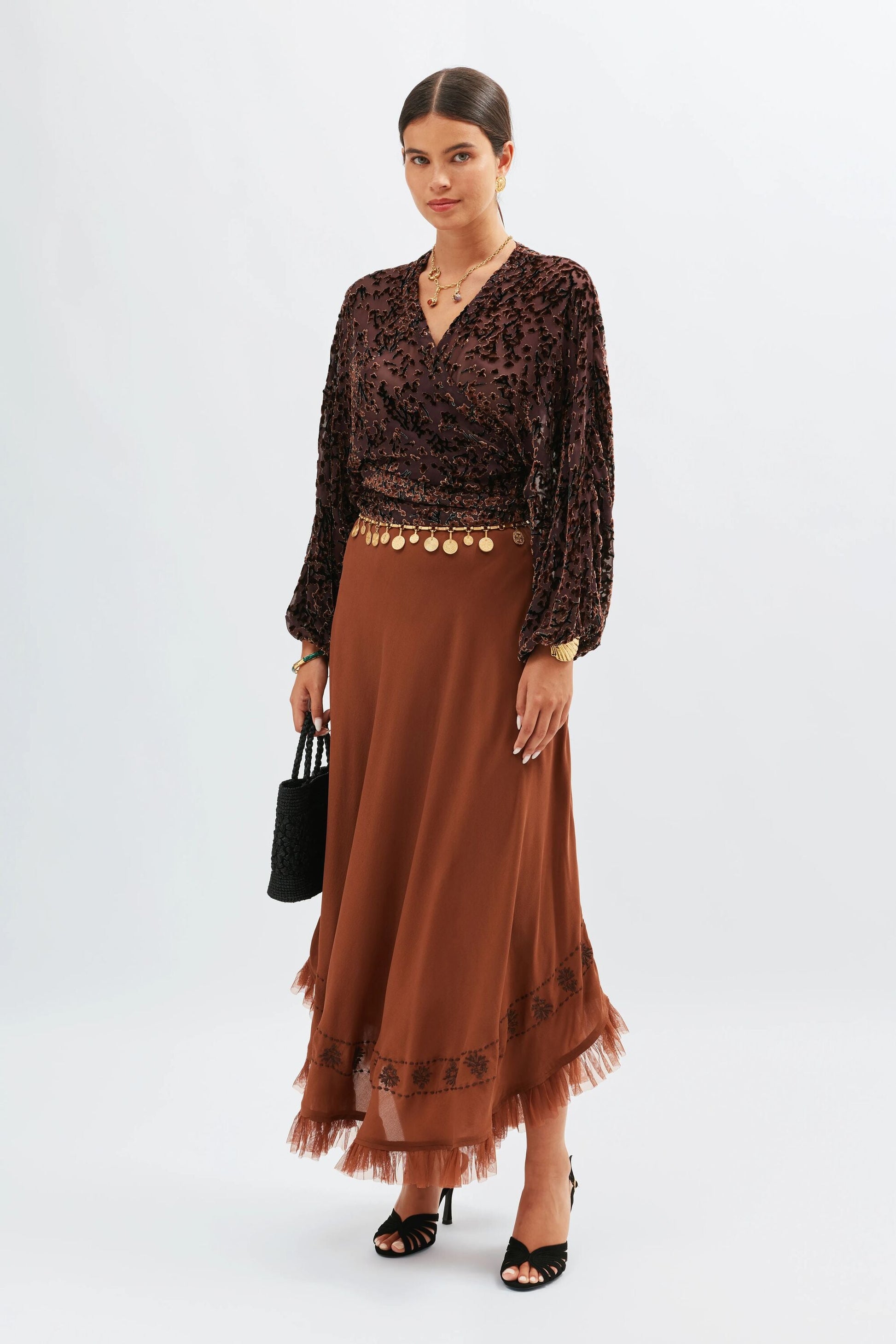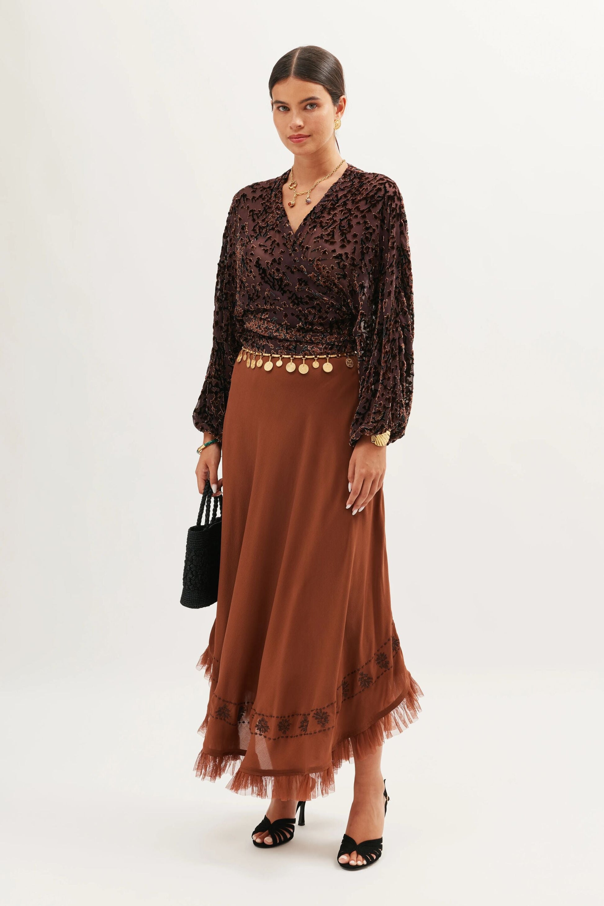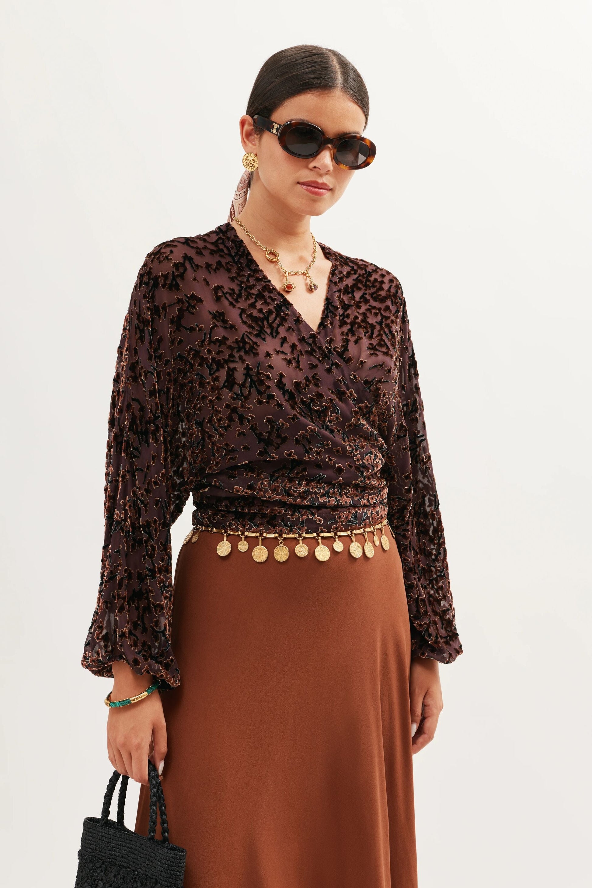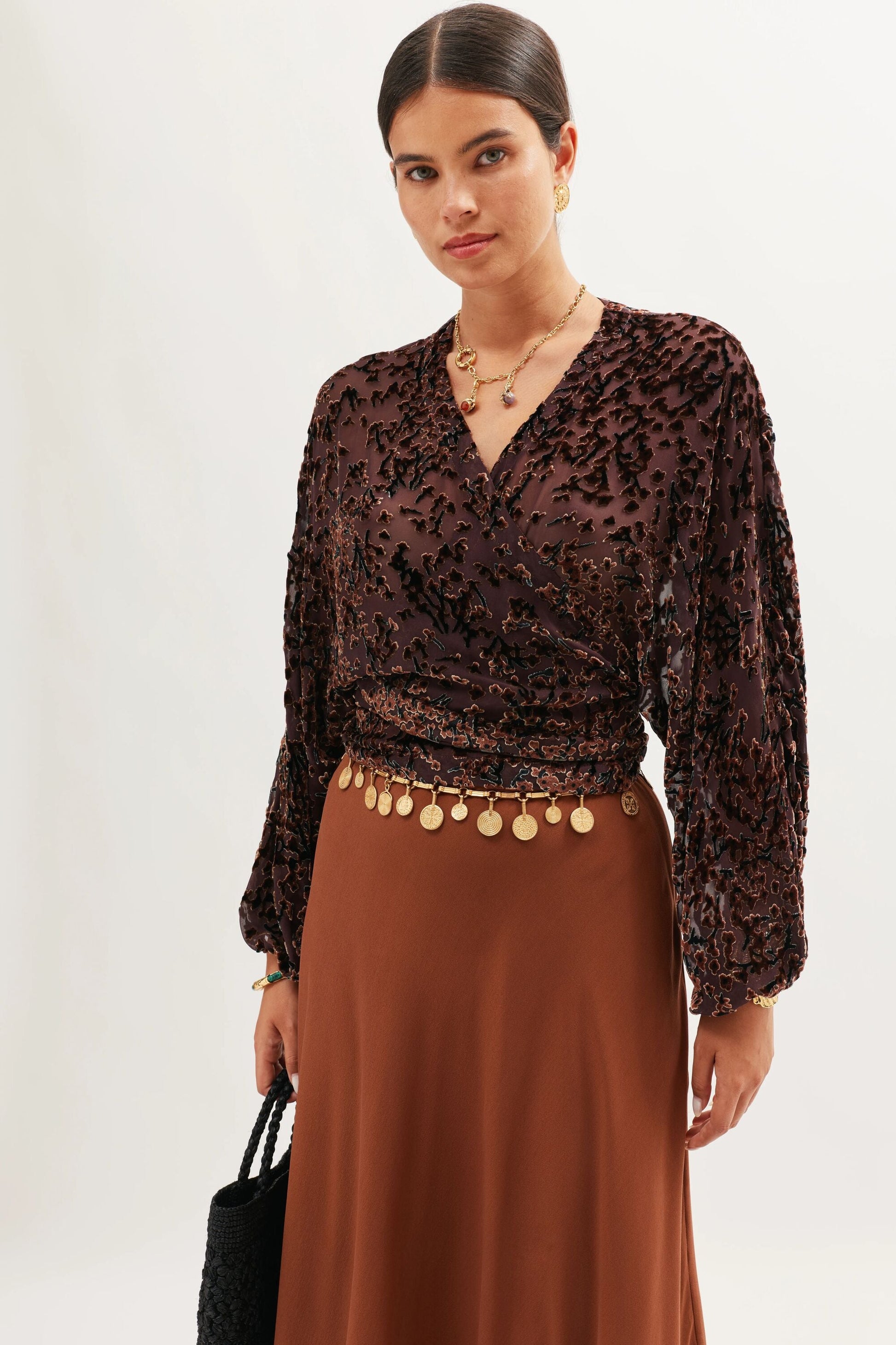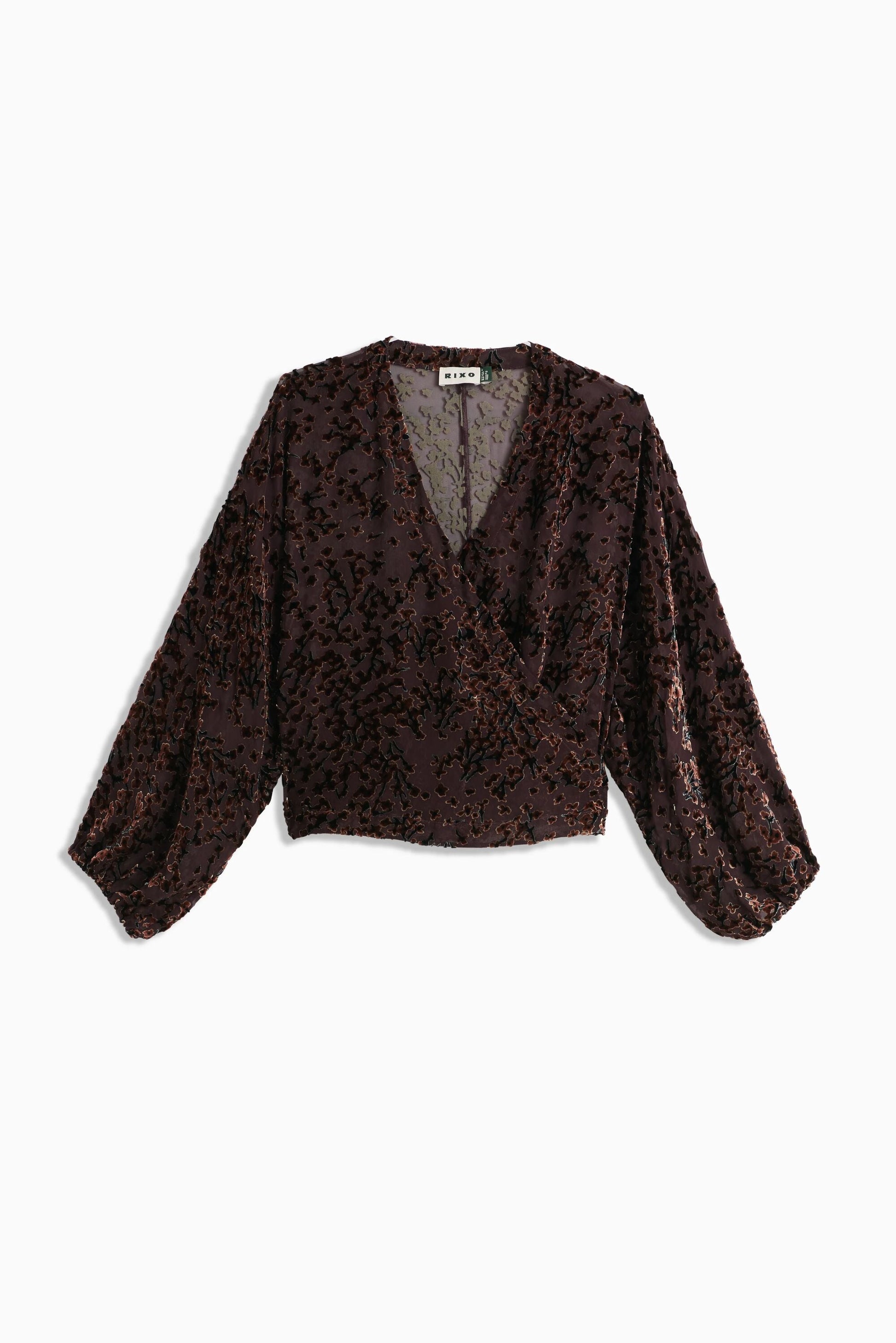 Introducing Cody, a beautiful cropped velvet wrap blouse. A new shape for us, with an adjustable waist fastening for a relaxed fit. Vintage-inspired in colour, burn out texture and silhouette, its blousy sleeves and '70s glam bohemia feel make it the perfect statement separate. Pair yours with your go-to RIXO skirt.