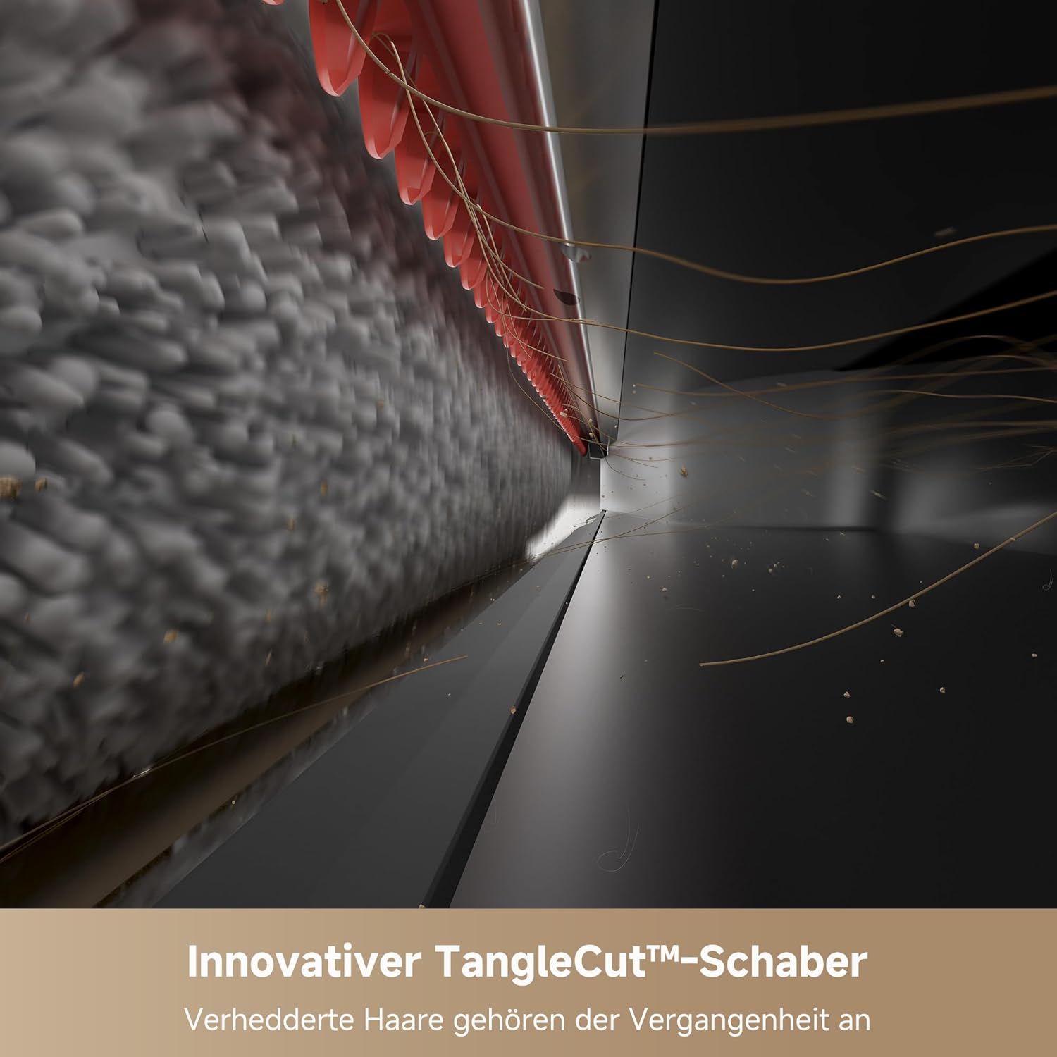 - Selbstreinigung mit Drehung in 2 Richtungen und festem Schaber: Indem die Bürste sowohl mit als auch gegen den Uhrzeigersinn rotiert, werden Haare entwirrt und die Bürste sauber gehalten, ähnlich wie beim