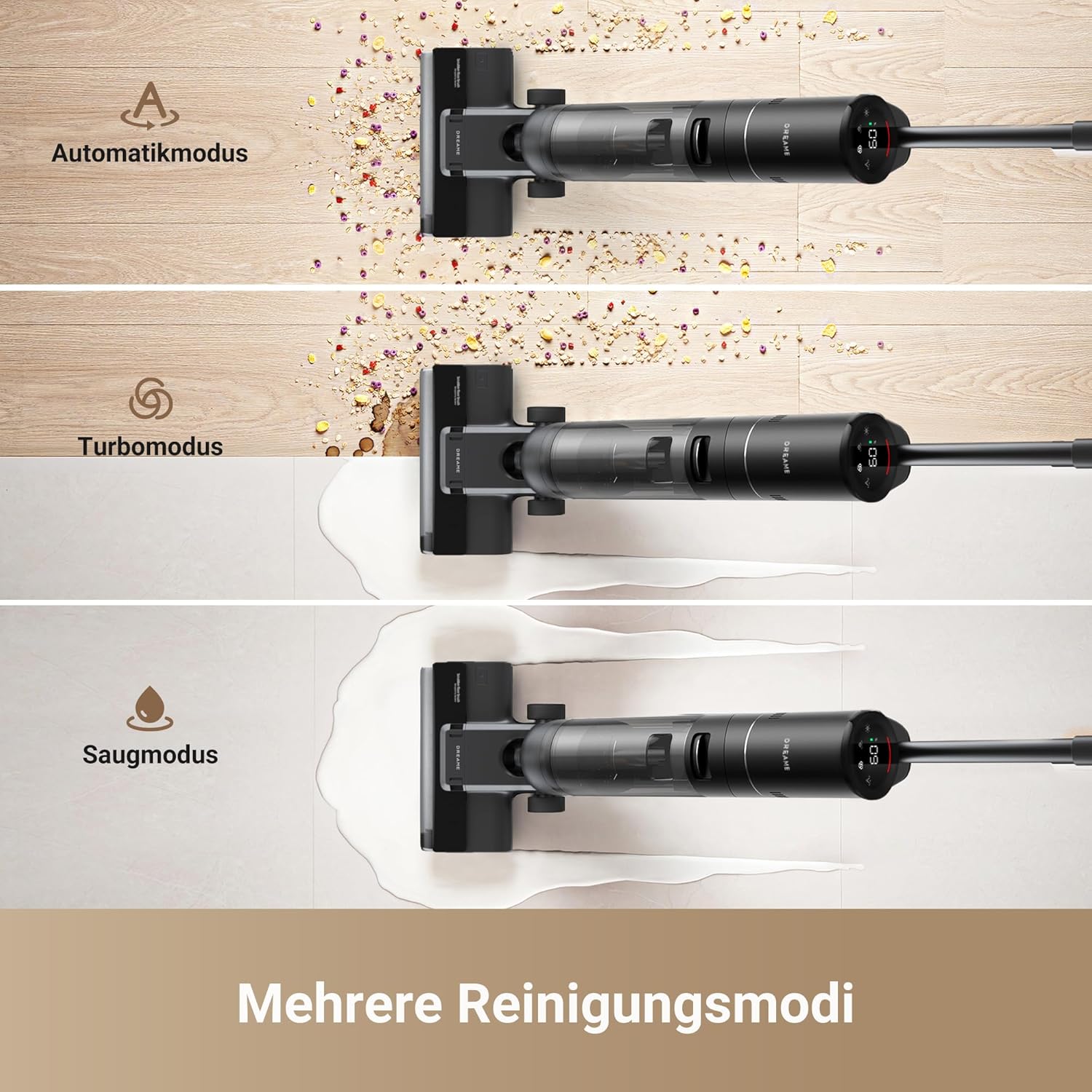 - Drei Betriebsmodi für vielseitige Reinigungsoptionen: Passen Sie Ihre Reinigung mit einem Automatikmodus für die Grundreinigung, einem Ultra-Modus für gründliche Reinigung und einem Saugmodus für Flüssigkeiten an Ihren Bedarf an