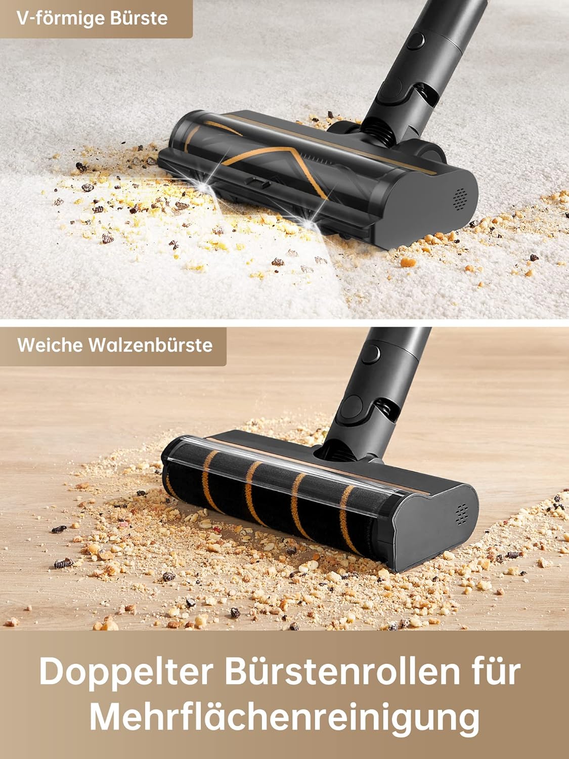- Diverser Bürstenkopf: Der R10 kommt mit einem Mehrflächen-Bürstenkopf mit V-förmigen Borsten und eingebauten LED-Leuchten. Diese Kombi ergibt eine gründliche Reinigung auf diversen Oberflächen, darunter Teppiche, Hartholzböden und Fliesen. LED-Lichter leuchten in jede Ecke, sodass versteckter Schmutz und Krümel nicht zurückbleiben