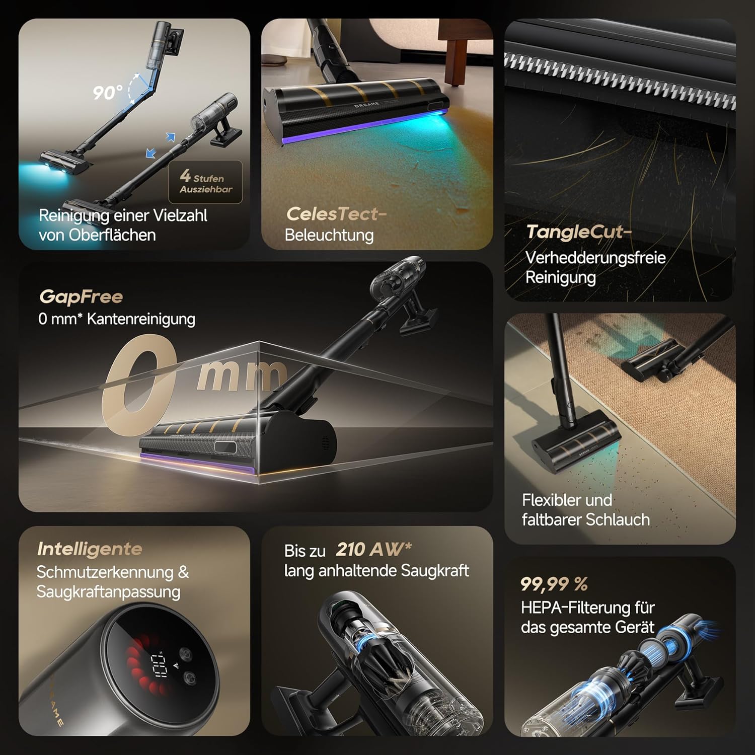 dreame V20 Pro-A Kabelloser Staubsauger, Kantenreinigung 0 mm, ohne Verheddern, für Hartböden und Teppiche, 210 AW Saugkraft, 90 Min. maximale Laufzeit, Filterung 99,99%, entfernt Tierhaare