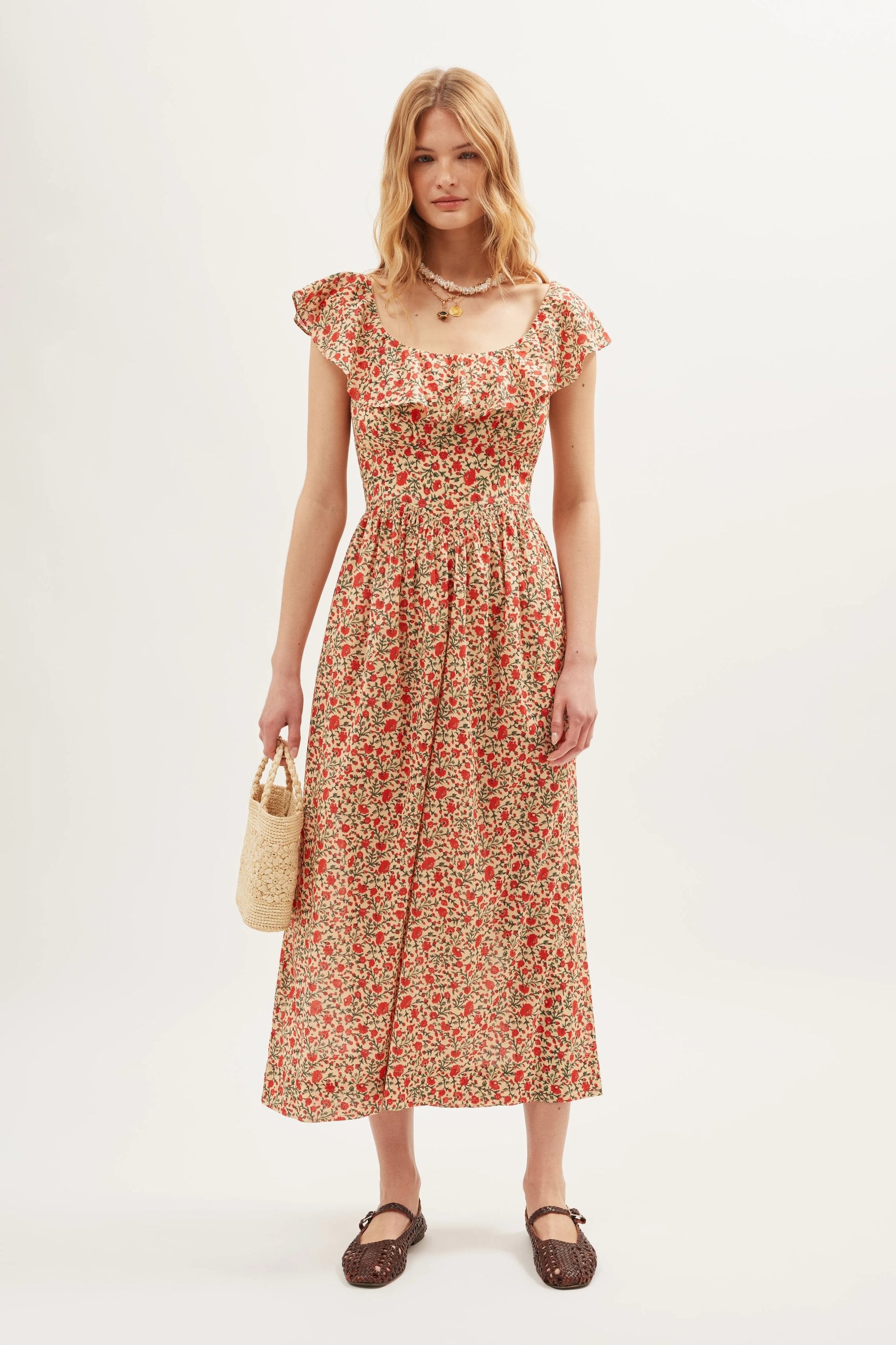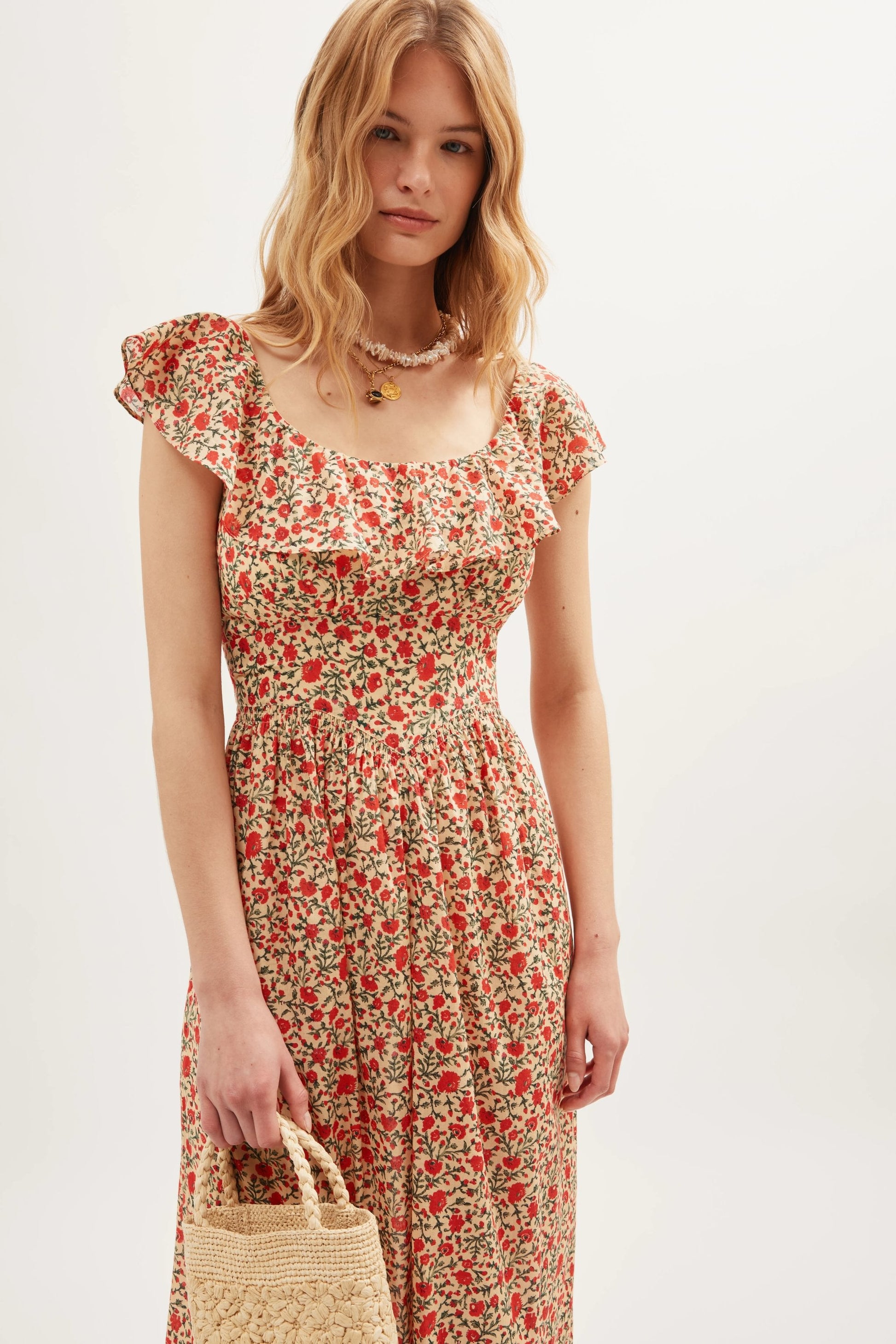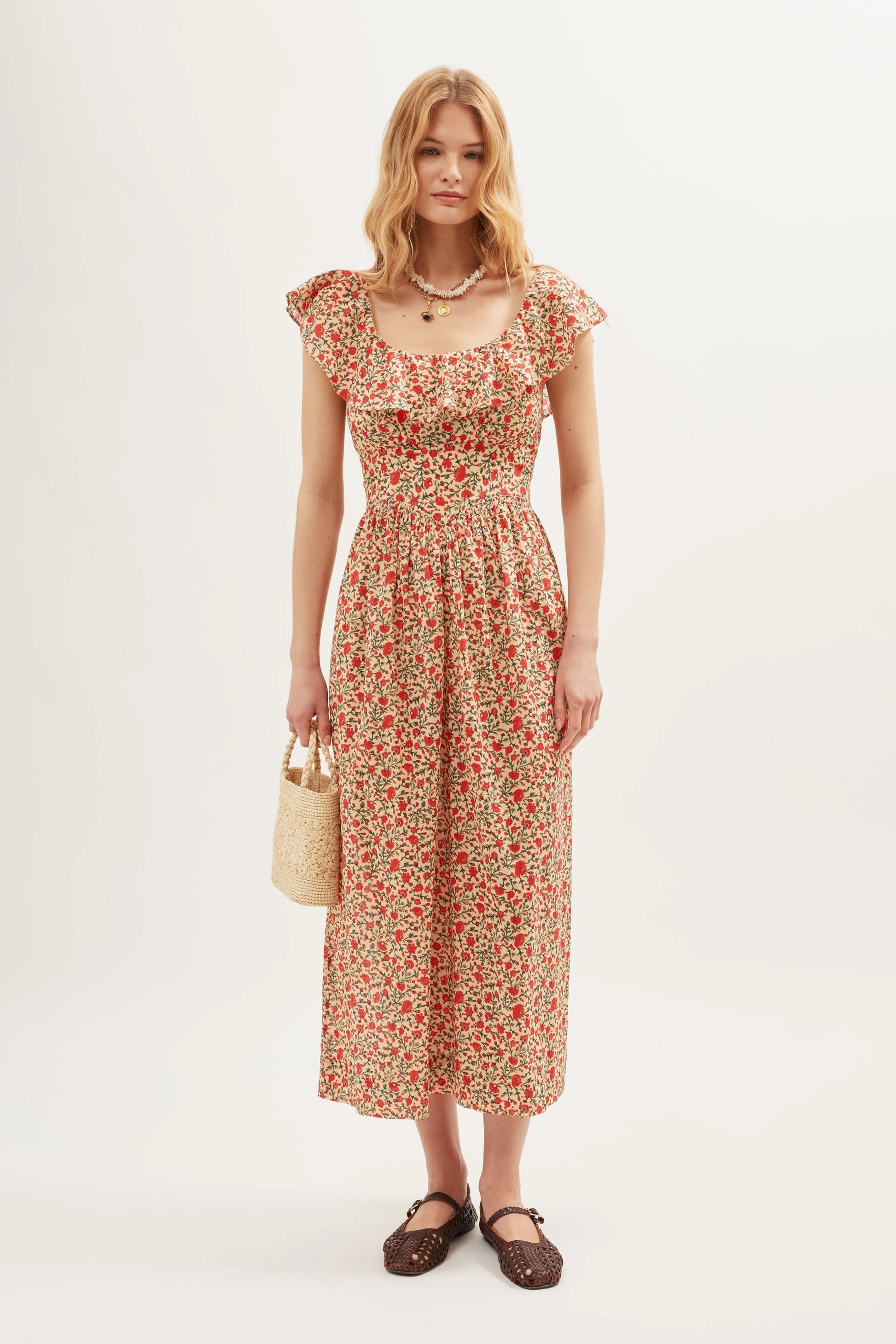 Ebony is a new shape for the season in our ditsy trail floral print. The perfect dress for summer, it has ties to draw in the waist and a pretty ruffled neckline.