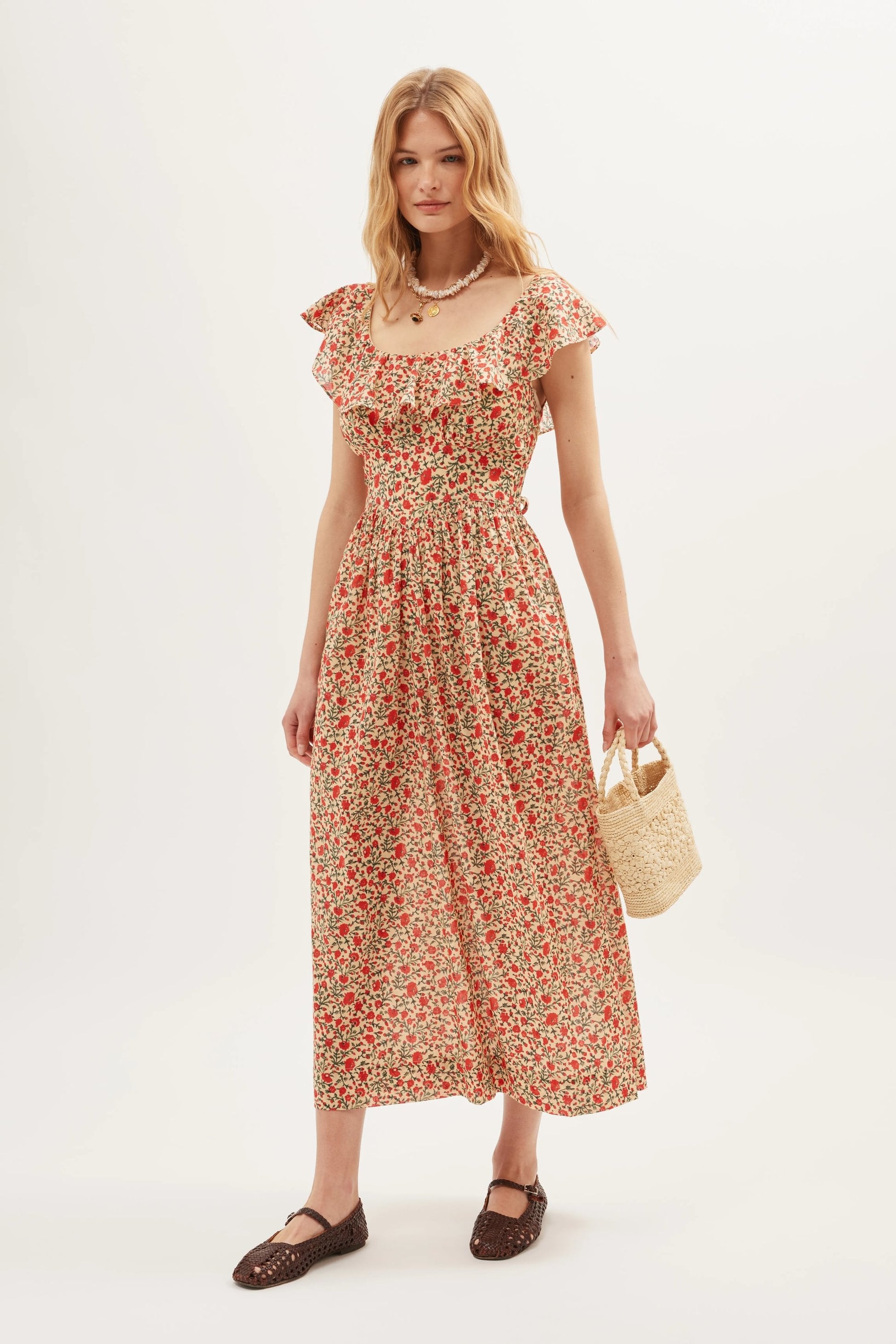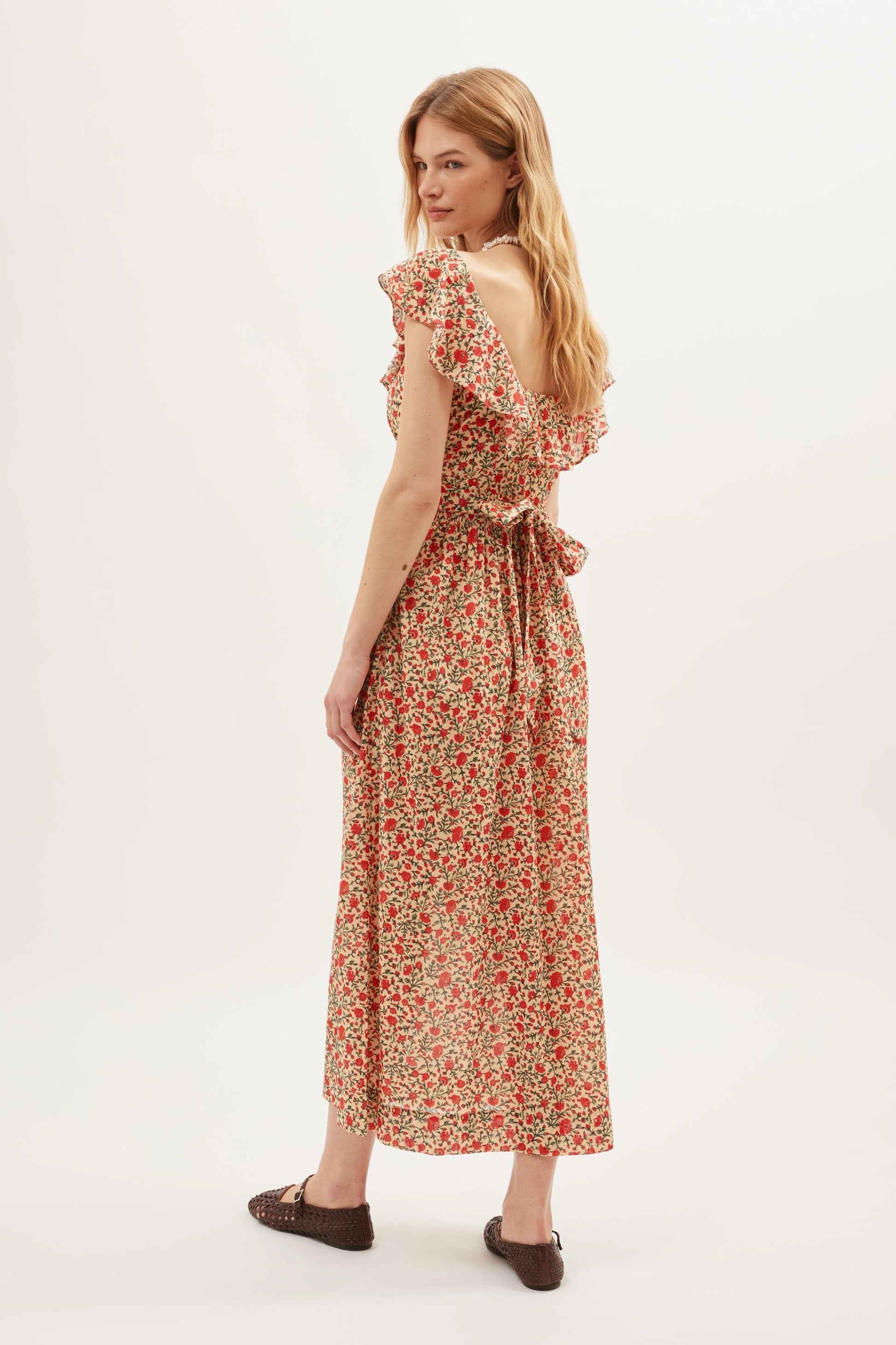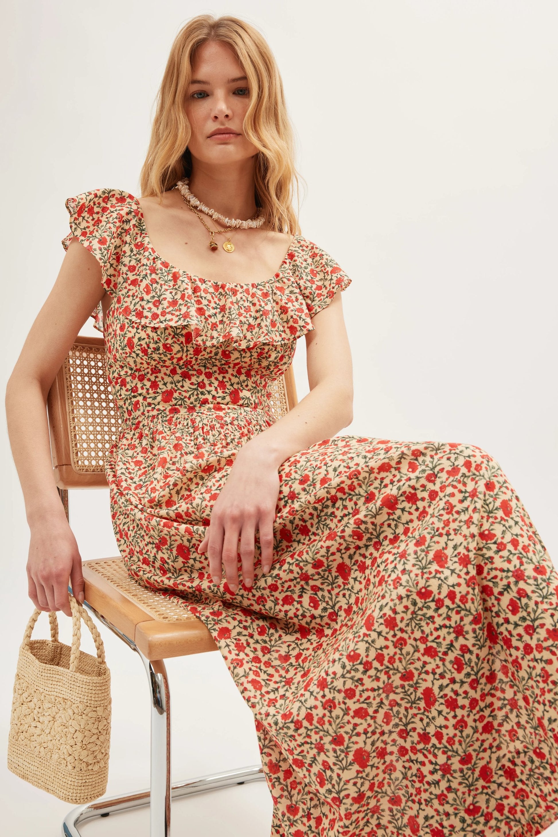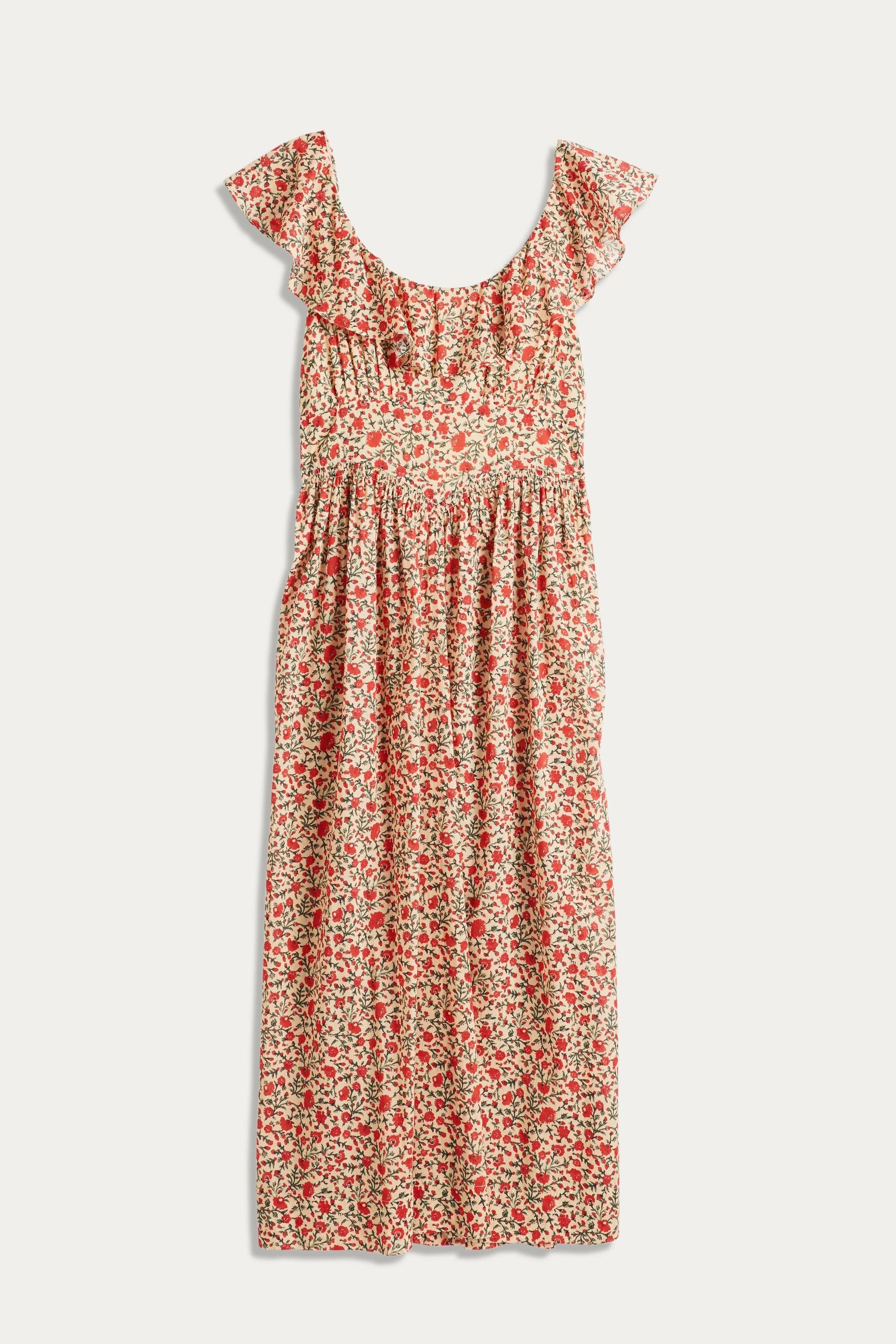 Ebony is a new shape for the season in our ditsy trail floral print. The perfect dress for summer, it has ties to draw in the waist and a pretty ruffled neckline.