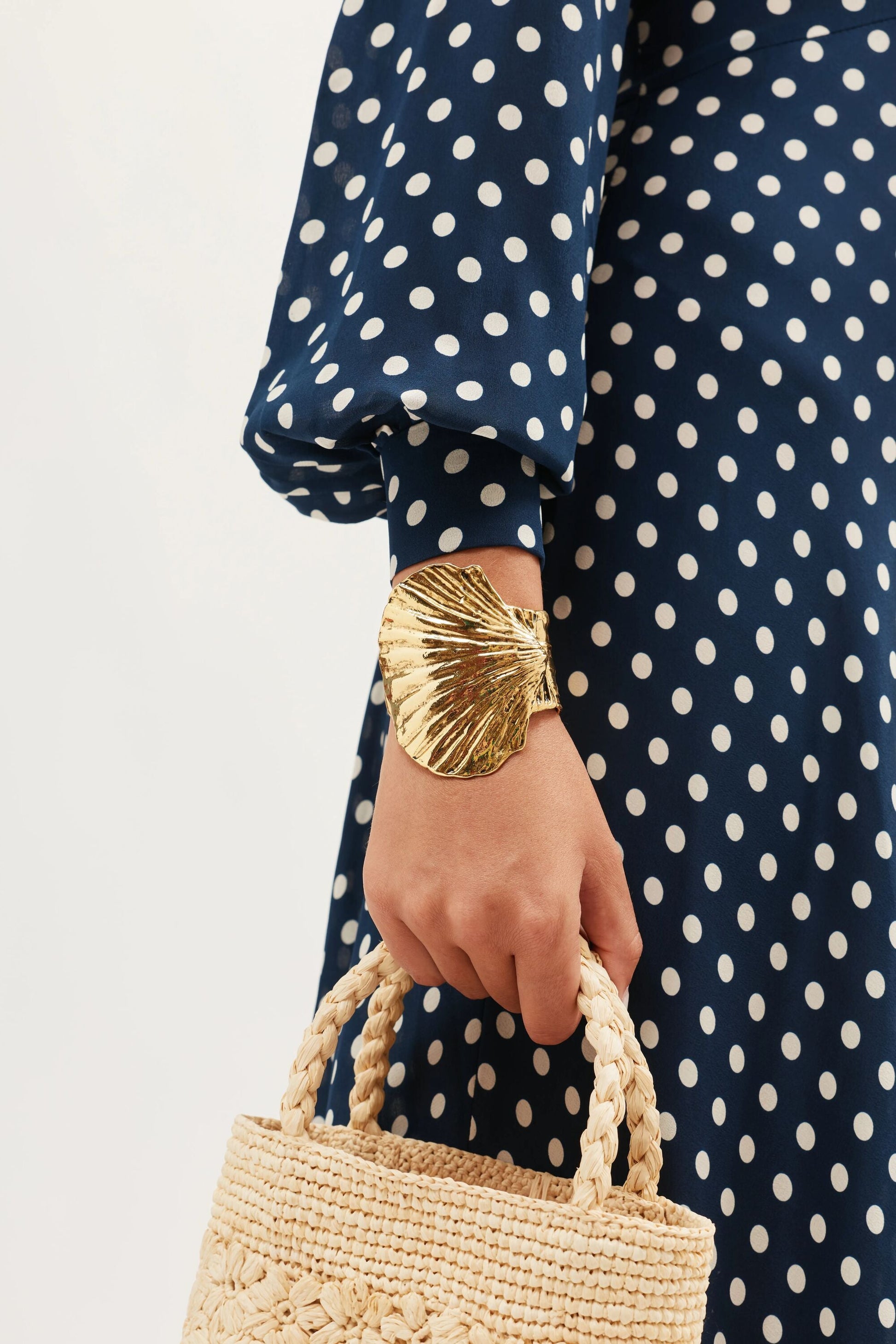 The Emory is a classic long sleeve occasion dress in a timeless navy polka dot print.