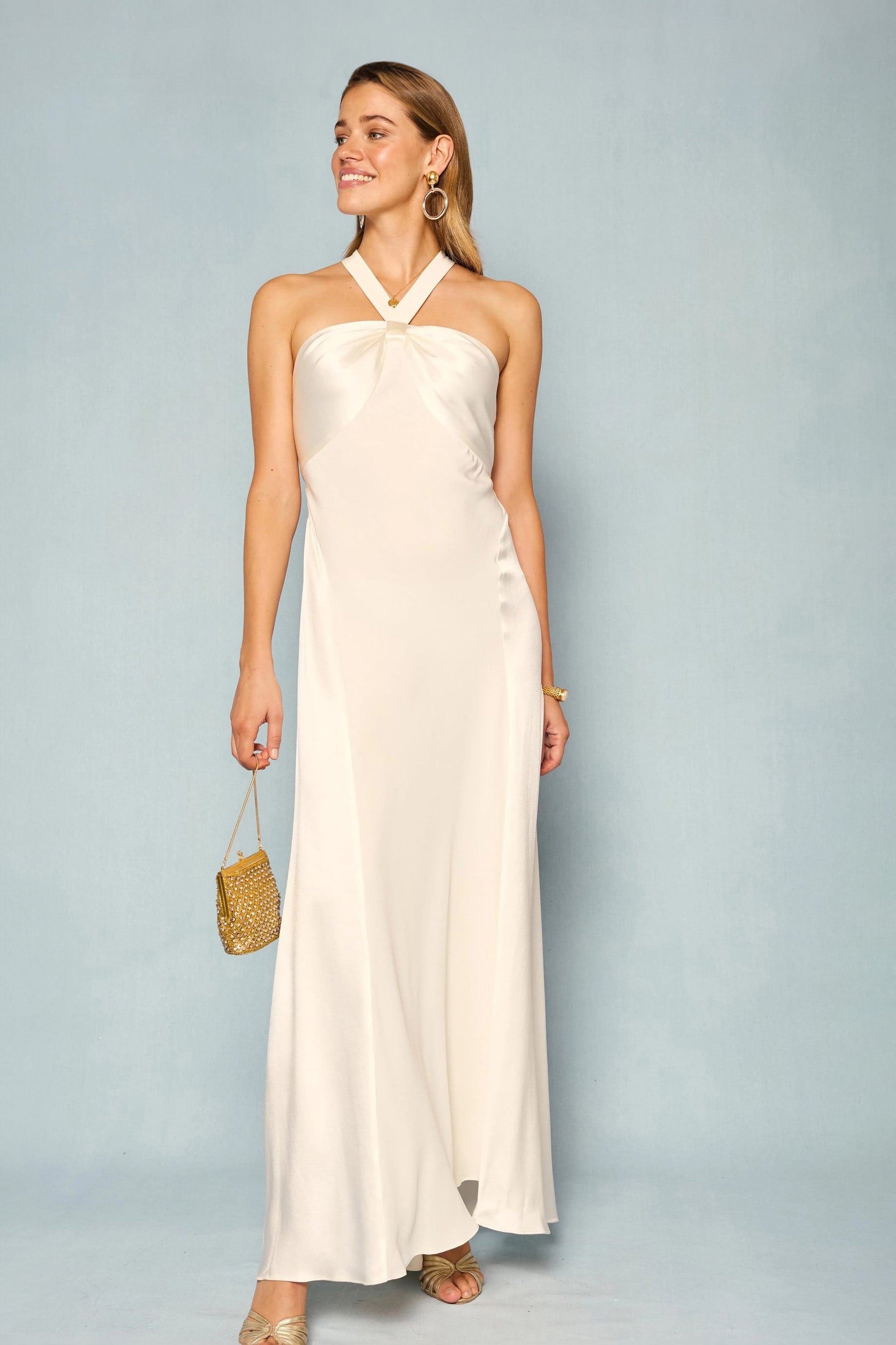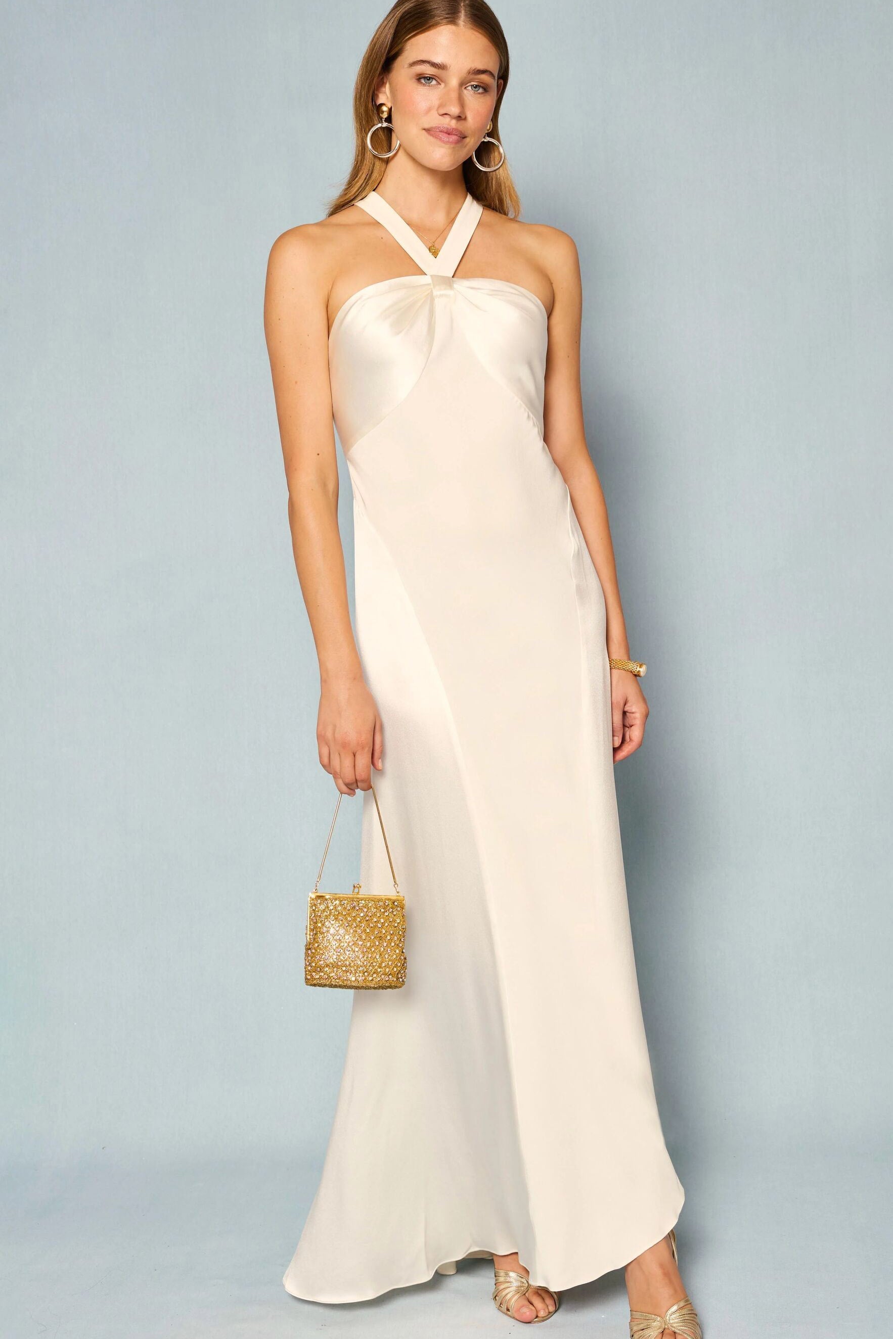 Our elegant silk crepe Eve gown has a vintage-inspired silhouette that's truly timeless. Designed with a bow-detailed silk-satin bust, it turns to an open back but the halterneck straps fit snugly for a secure fit. The full skirt is cut on the bias for a beautiful drape that looks stunning in photos.