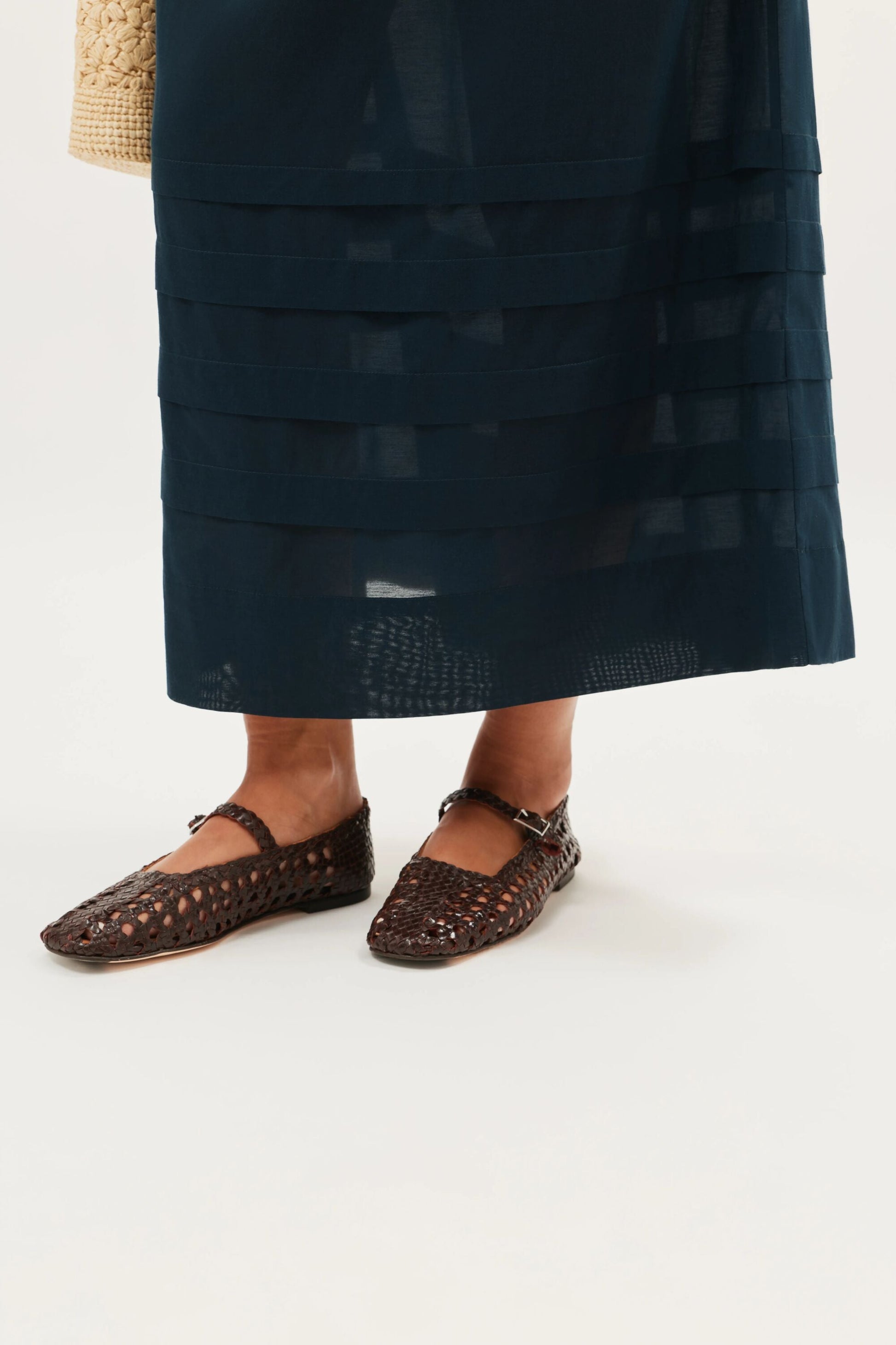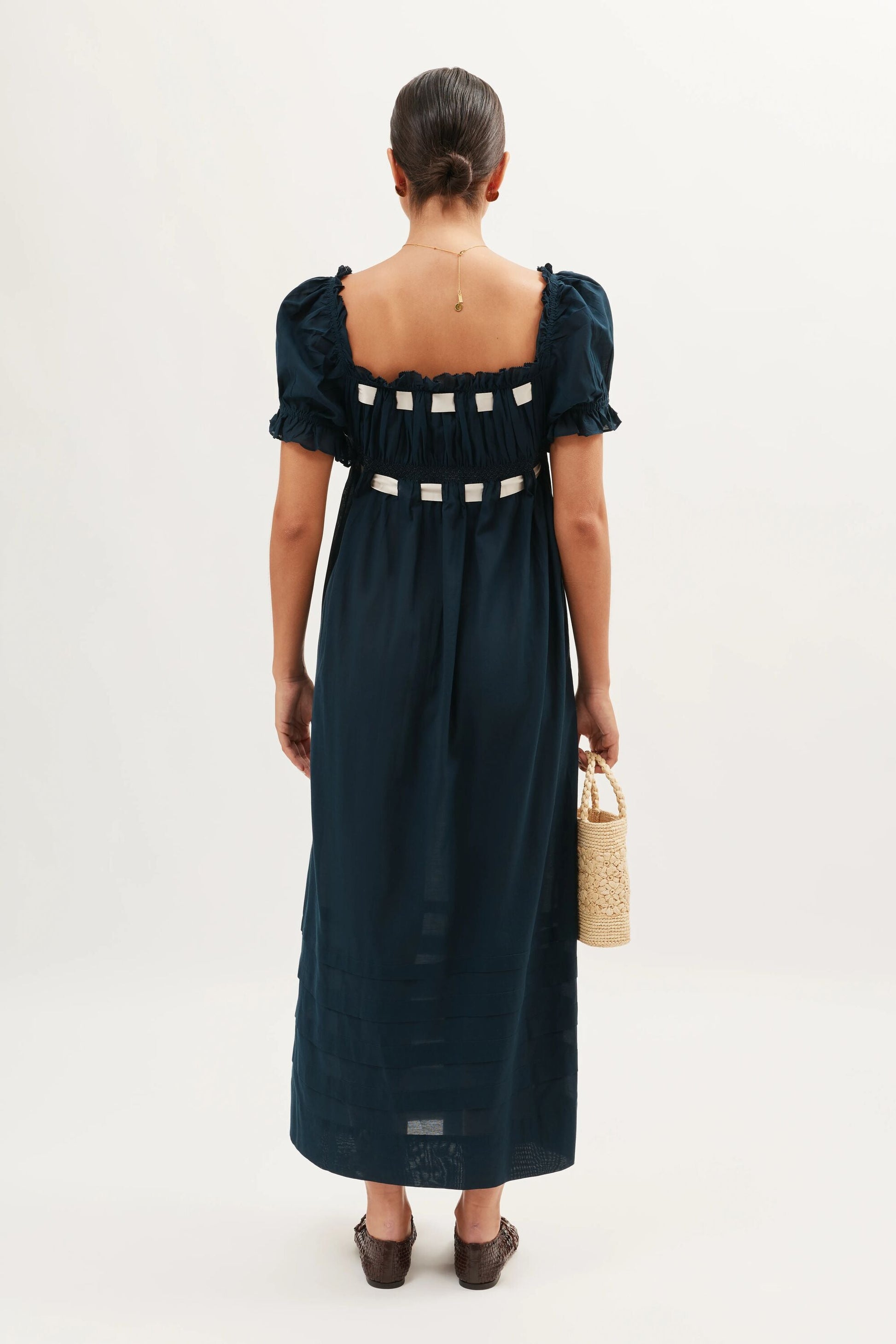 Evrose is the perfect summer day to night navy dress, as part of our RIXO x Billie Bhatia collaboration. A longer midi version of our bestselling Devin, it's designed with decorative smoking with elegant ivory ribbon detailing. Made from cotton-blend, it’s a warm weather delight to treasure.