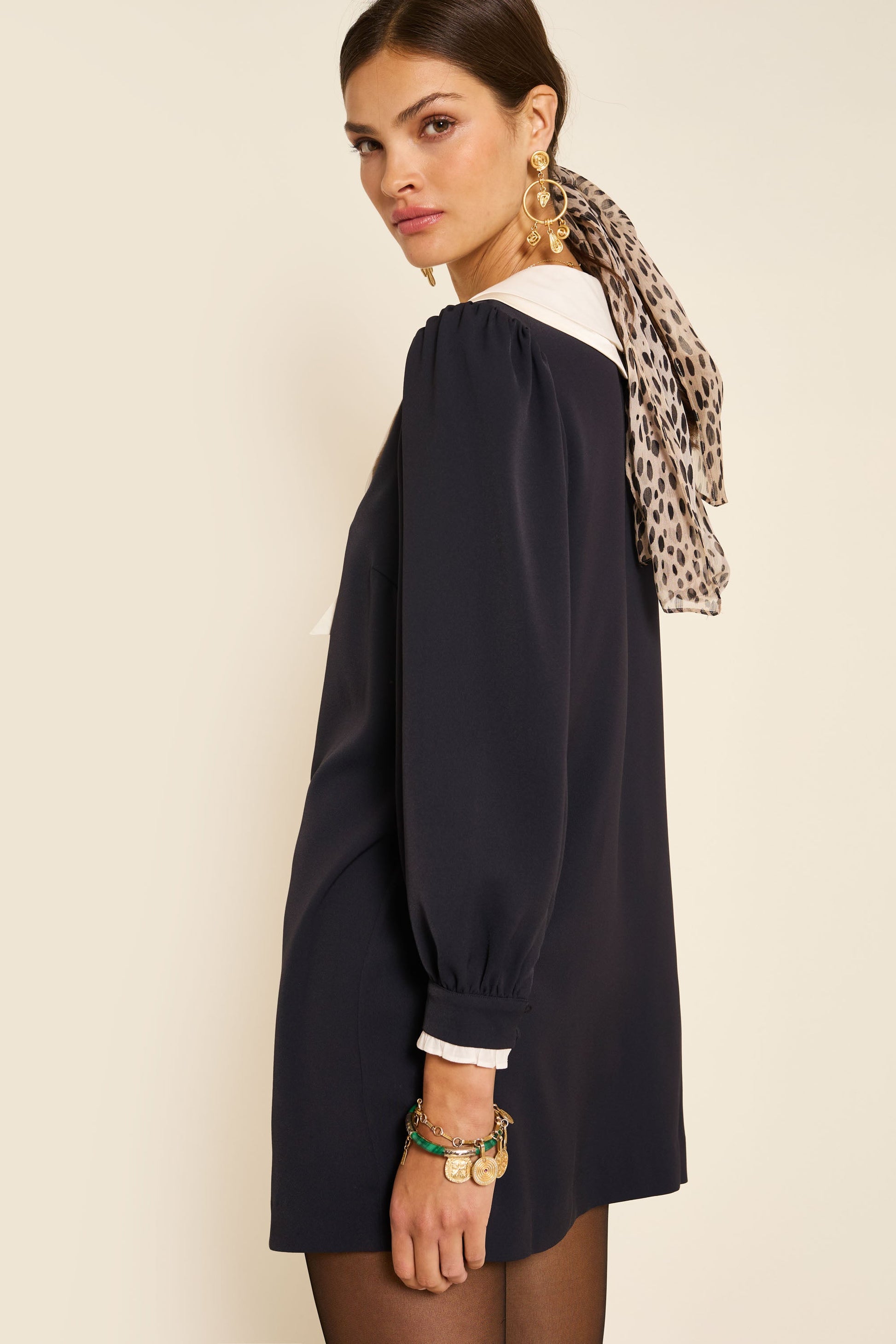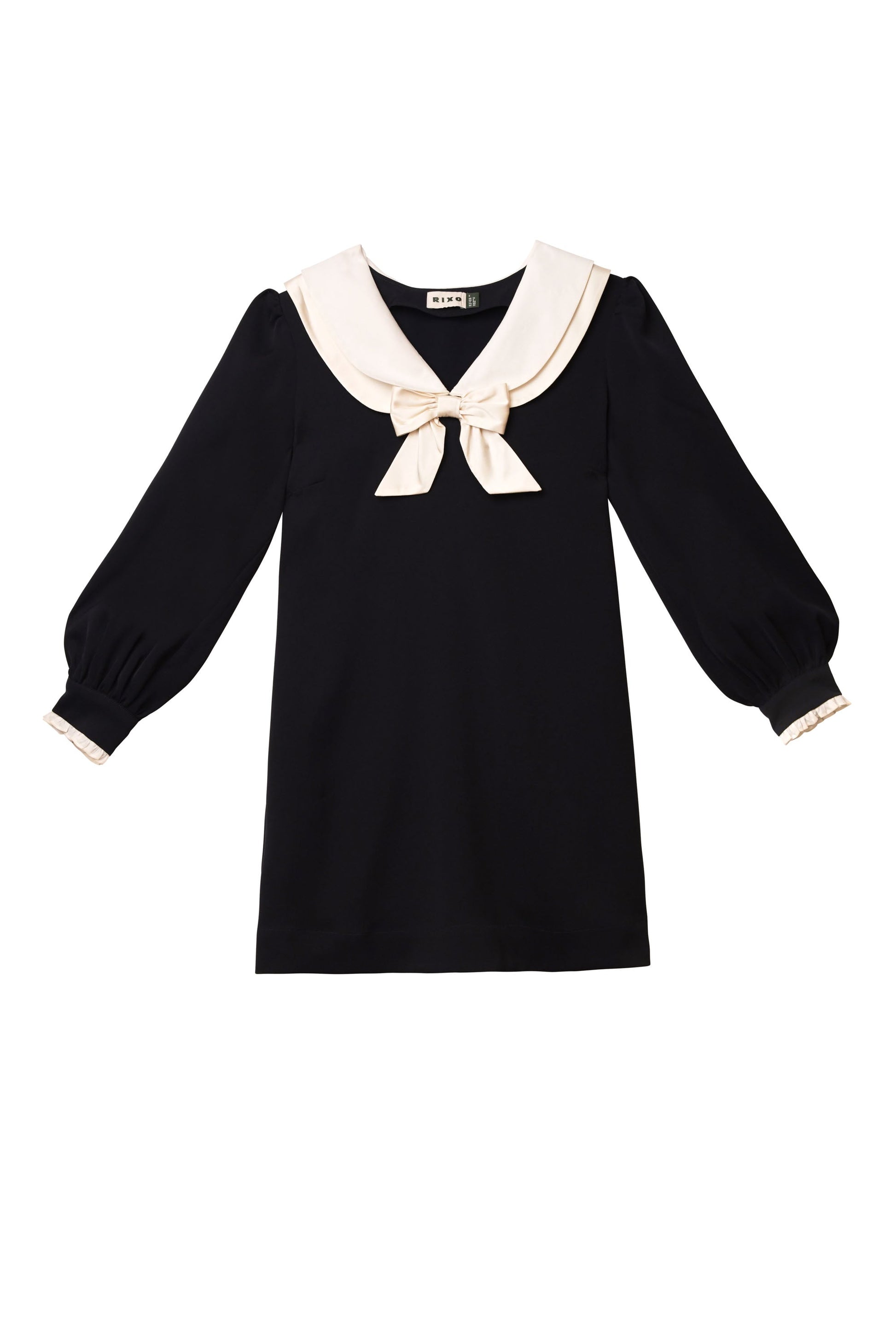 This Halina mini dress is based on our Eimer blouse, designed with the same nautical-inspired collar and feminine bow. Wear it with boots or ballet flats, adding tights on cold days.
