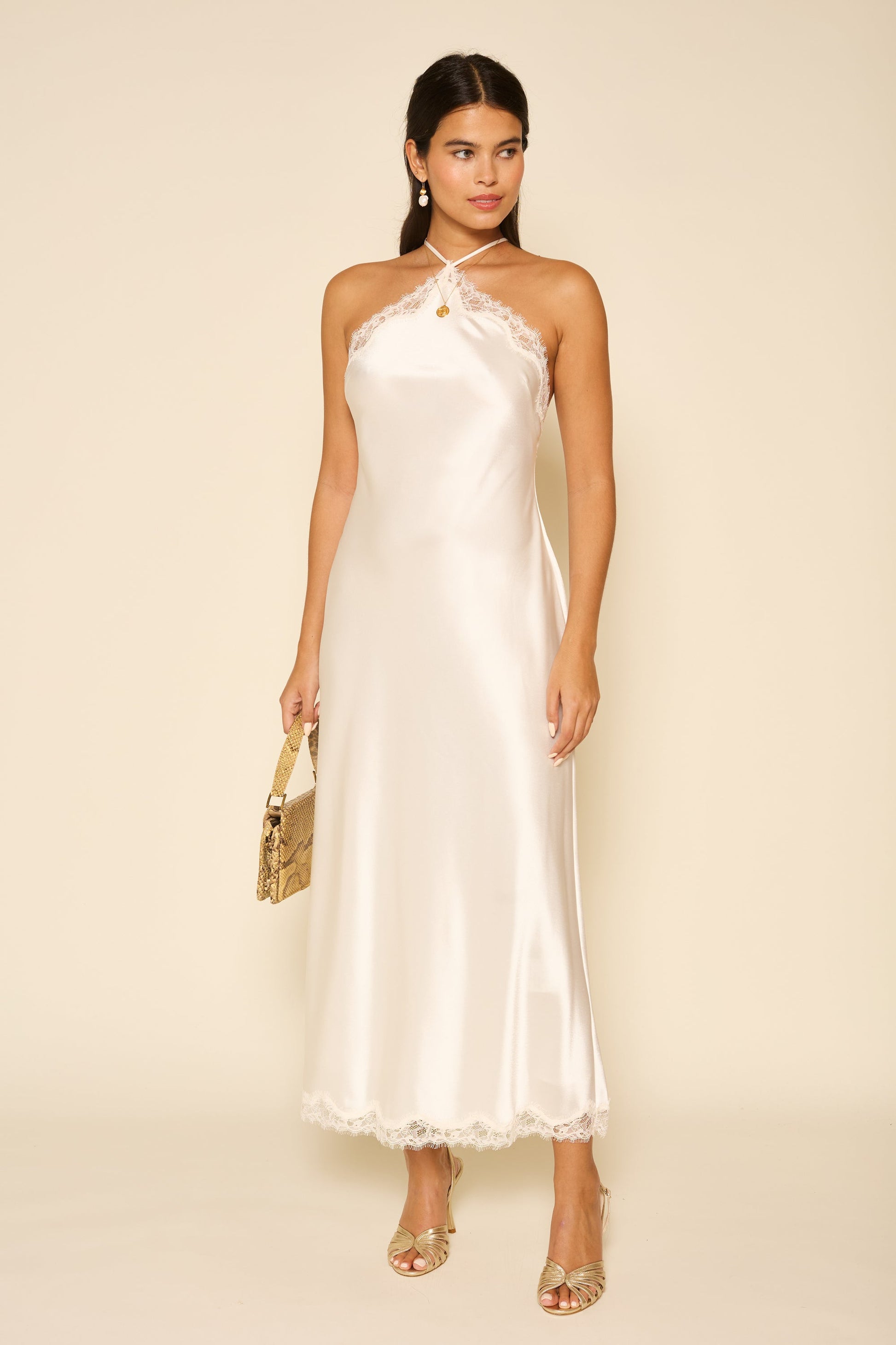 Harlan is simple but perfectly designed. We were inspired by a slip dress from the '90s and added a lace trim that makes it an elegant choice for weddings and other special occasions.