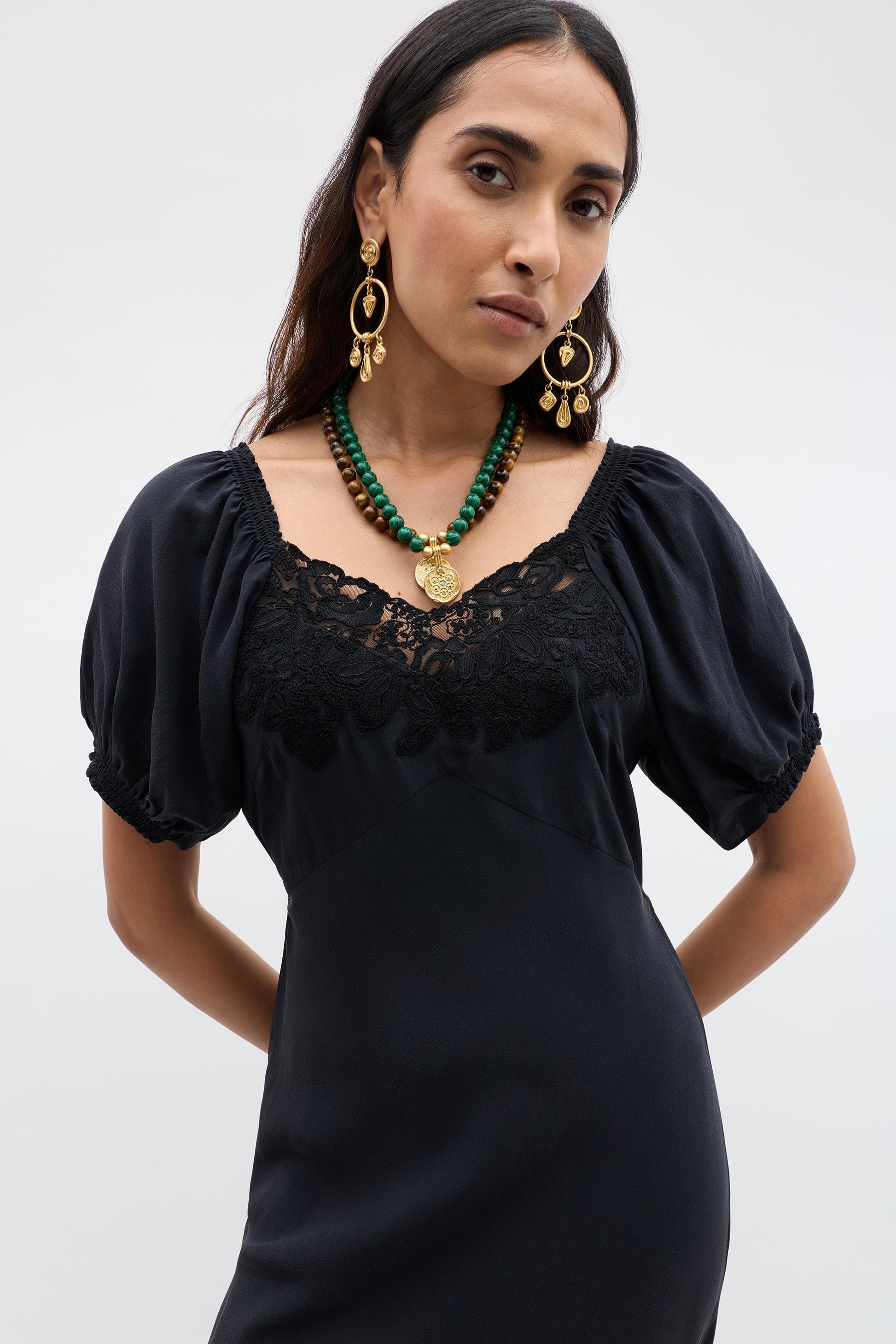 This black Ilaria dress is set to be your new favourite LBD. Inspired by a much-loved vintage style, its delicate lace detail, elegant bias cut and puff sleeves make it the perfect fit for every dress code.