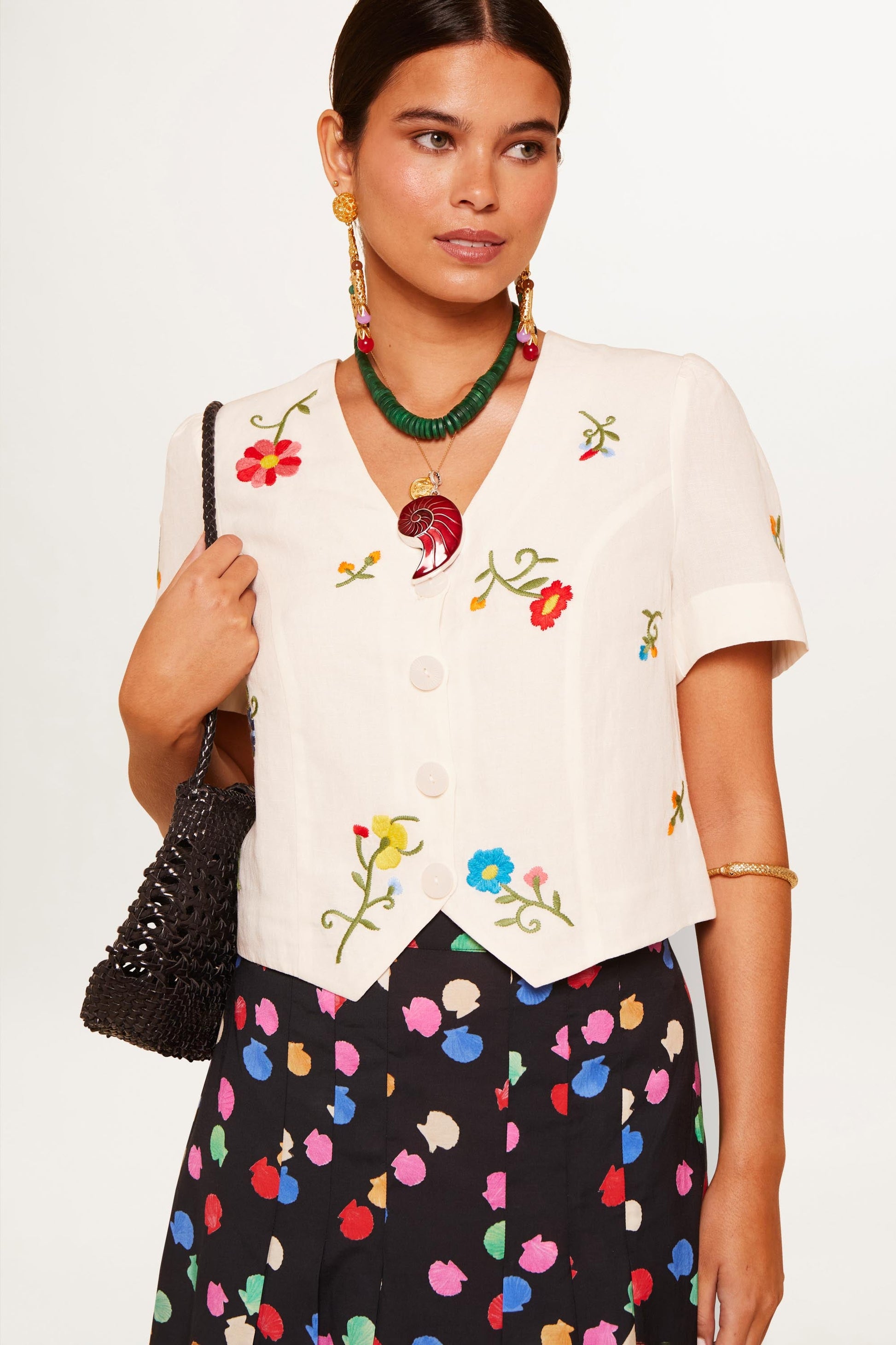 The boxy hem on our Immie top is based on a vintage waistcoat. Designed so it looks best untucked, it's embroidered with pretty florals.
