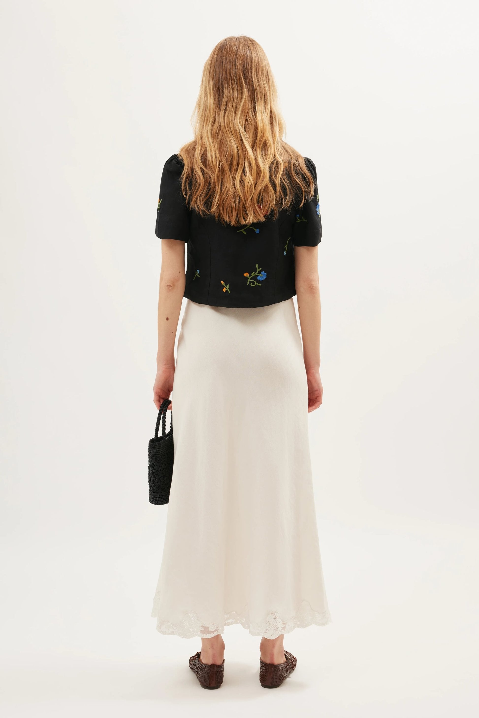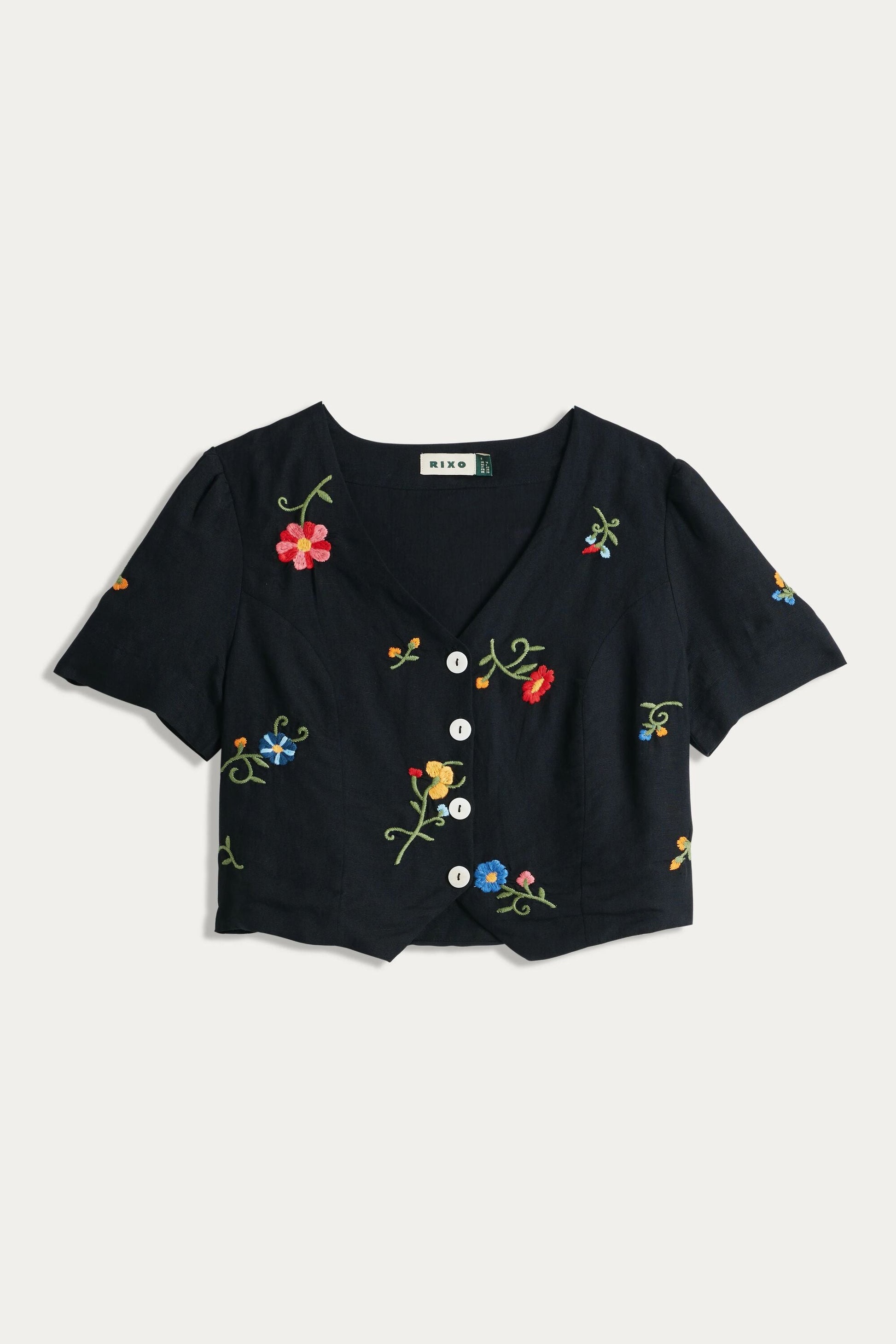 A vintage top was the starting point for Immie - we tweaked the design until the fit was just right. The floral embroidery is a big inspiration for us this season.