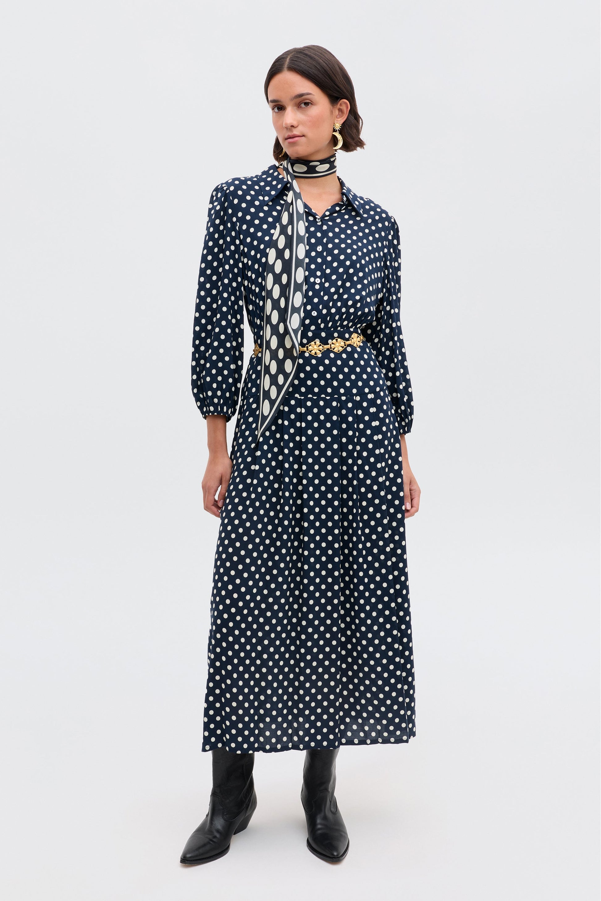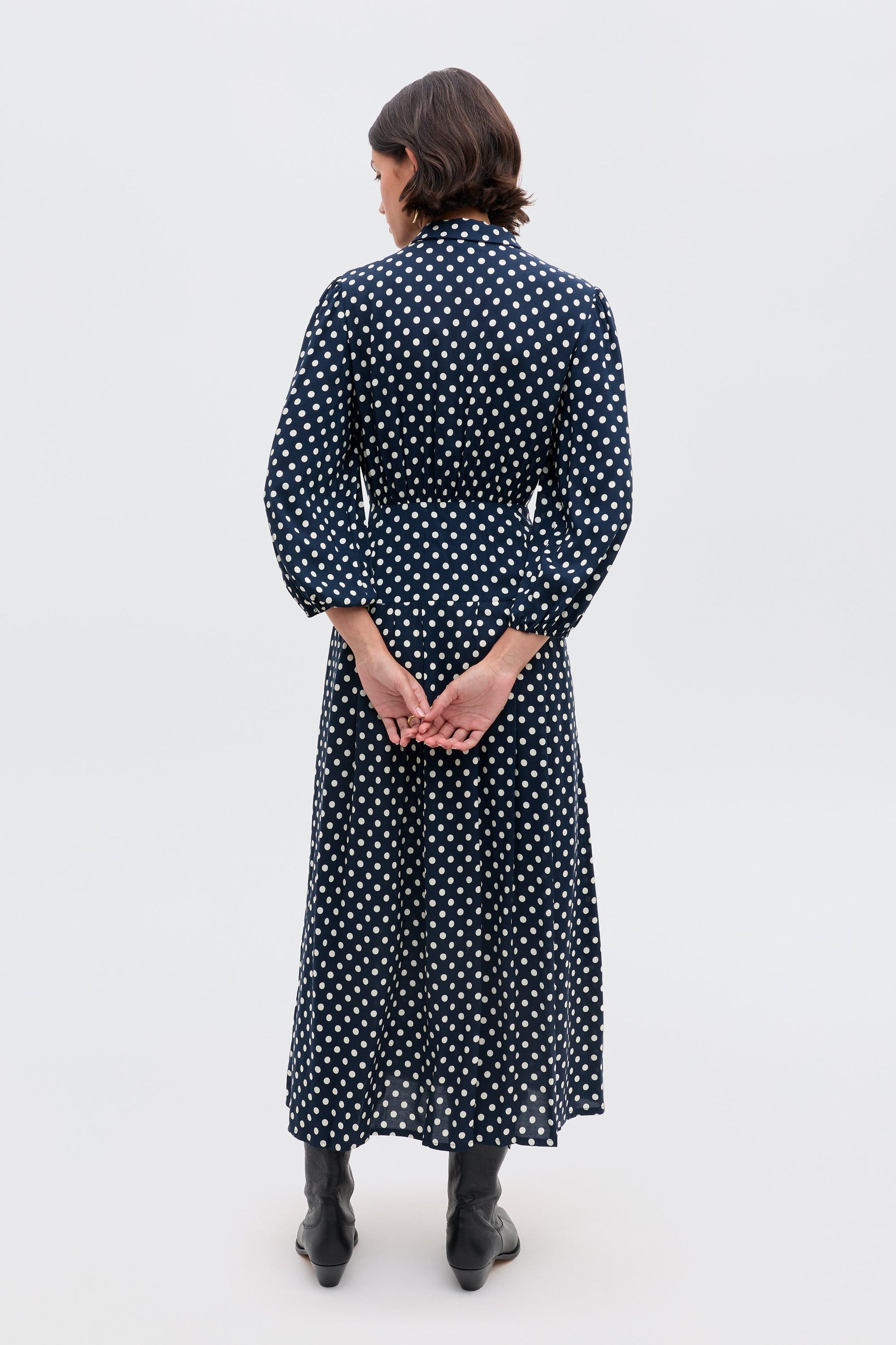 The Izzy is a flattering blouson-sleeved shirtdress, pleated below the smooth waist panel of her midi skirt in a timeless navy polka dot print.