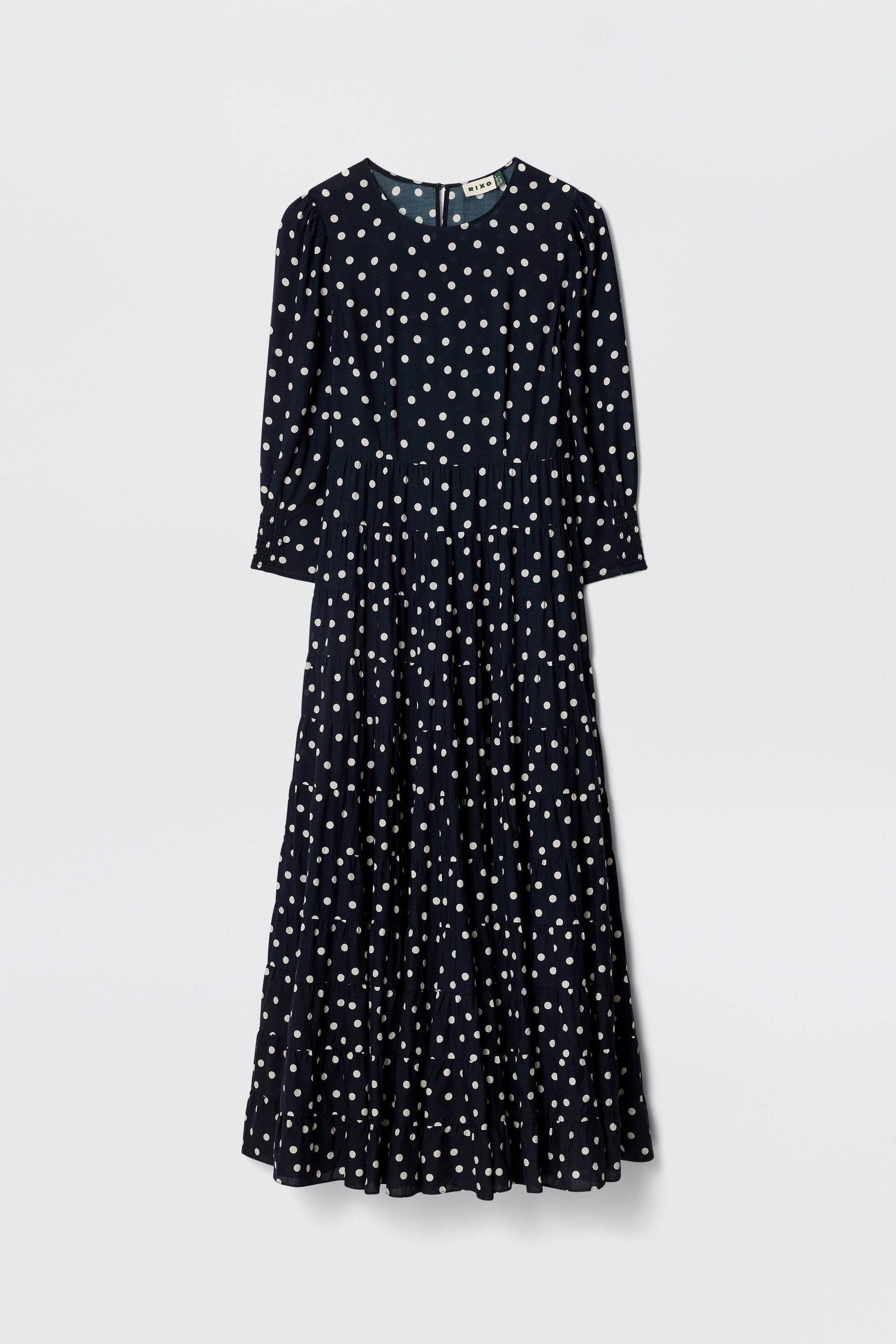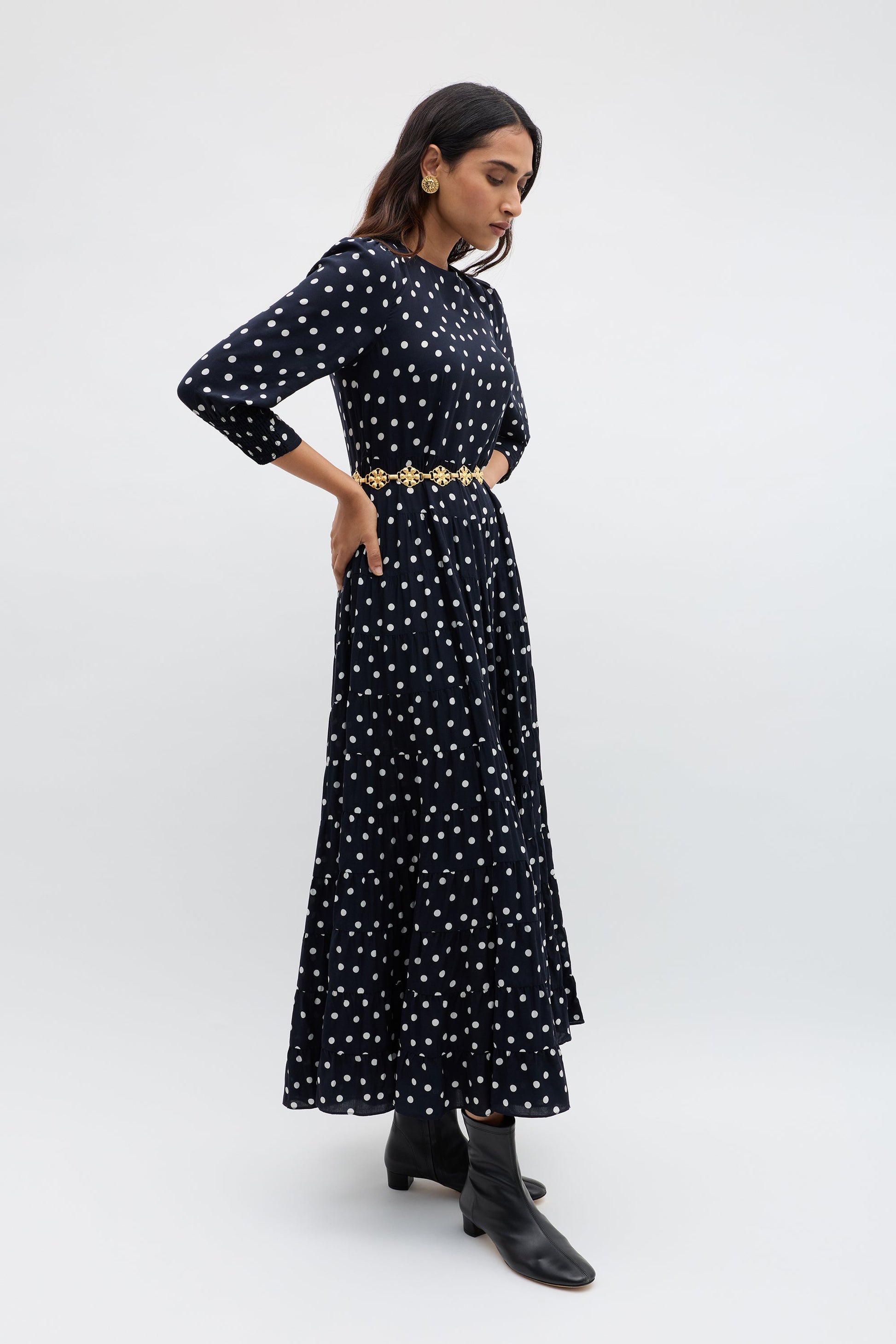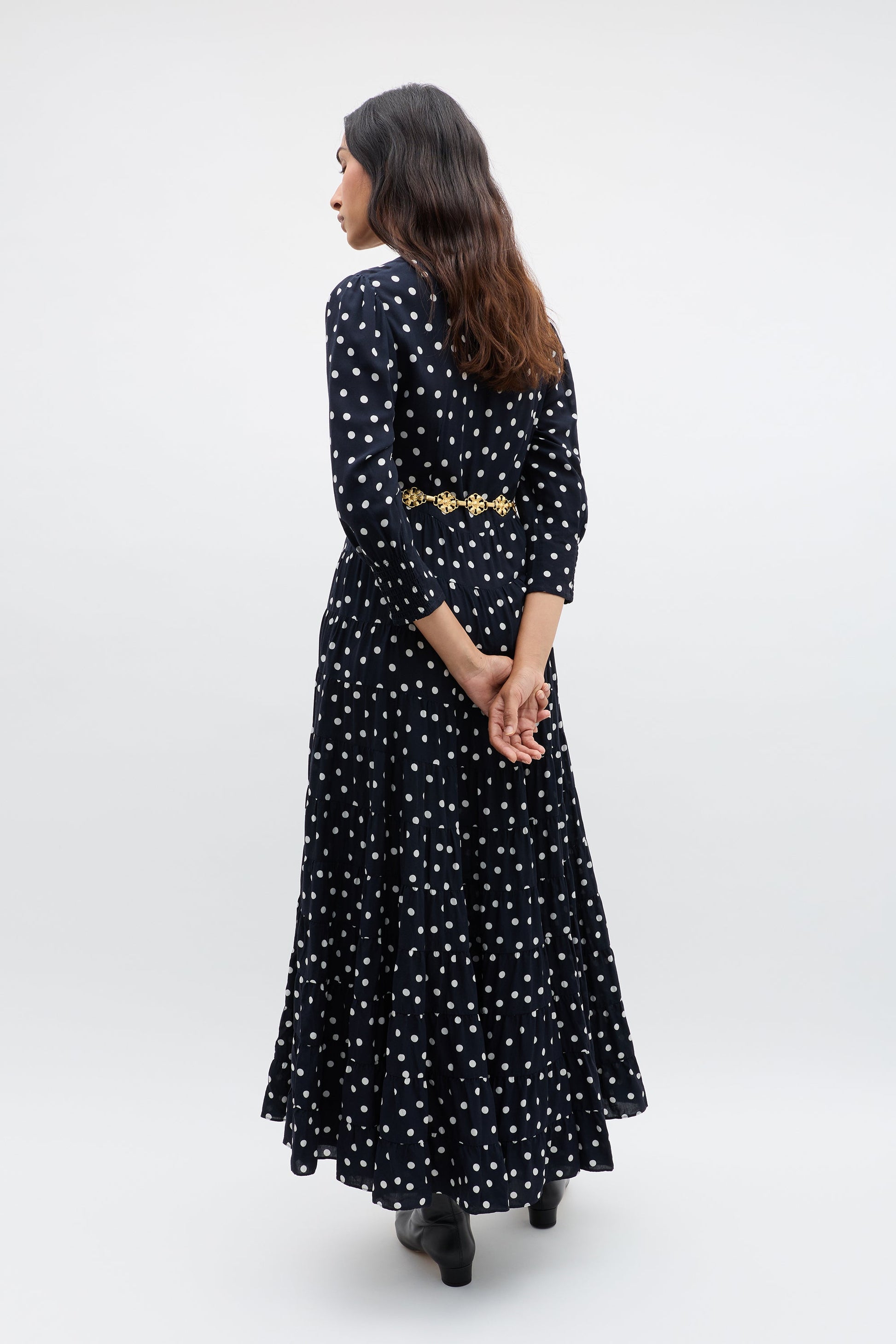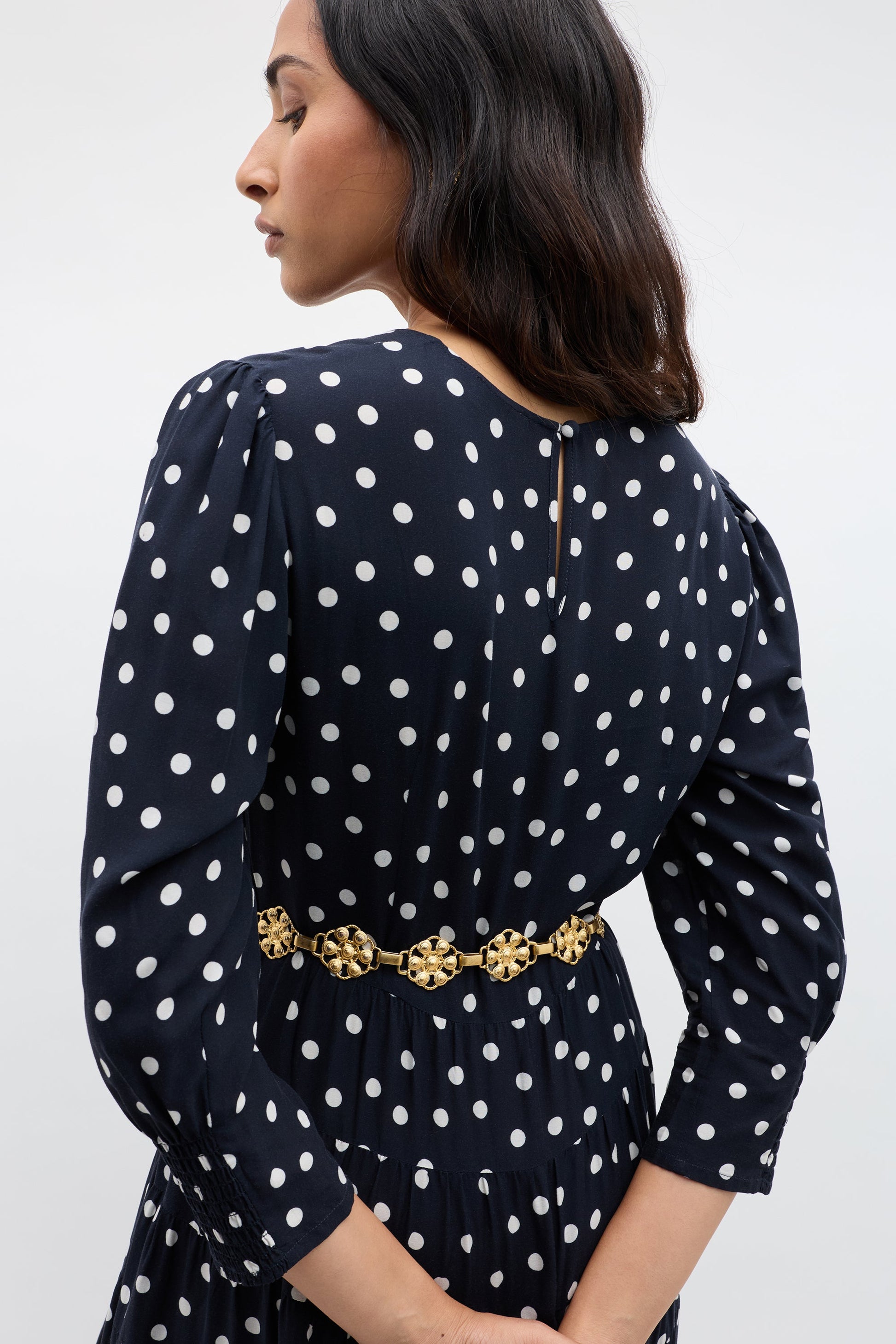 Our Kristen Dress – classic, refined and effortlessly elegant. The cuffed sleeves give the sleeves a subtle billow for a romantic feel. Vintage-inspired, the bohemia dot print is timeless and versatile. The staple dress for busy days running errands in the city to nights celebrating life's special moments.