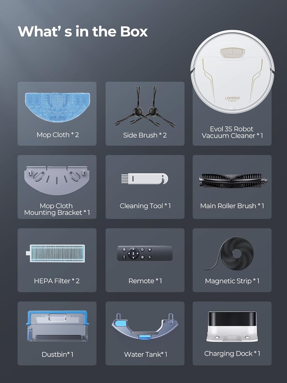 - đ§č ă3-in-1 Reinigung: Kehren, Saugen & Wischenă Ein GerĂ€t, drei Funktionen â der wisch und saugroboter kehrt, saugt und wischt in einem Durchgang, um selbst feinen Staub und hartnĂ€ckige Flecken zu entfernen. Ideal fĂŒr Haushalte mit Kindern oder Haustieren.
