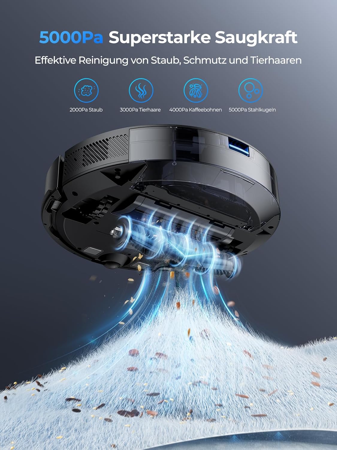 - đȘïž ăLeistungsstarke 5000Pa Saugkraft & Multi-Boden-Reinigungă Mit einer Saugleistung von bis zu 5000Pa entfernt der Saugroboter mit Wischfunktion mĂŒhelos Staub, Tierhaare und KrĂŒmel von Teppichen, Hartböden und Fliesen. Dank intelligenter Teppicherkennung passt er die Saugleistung automatisch an, um eine grĂŒndliche und materialschonende Reinigung zu gewĂ€hrleisten.