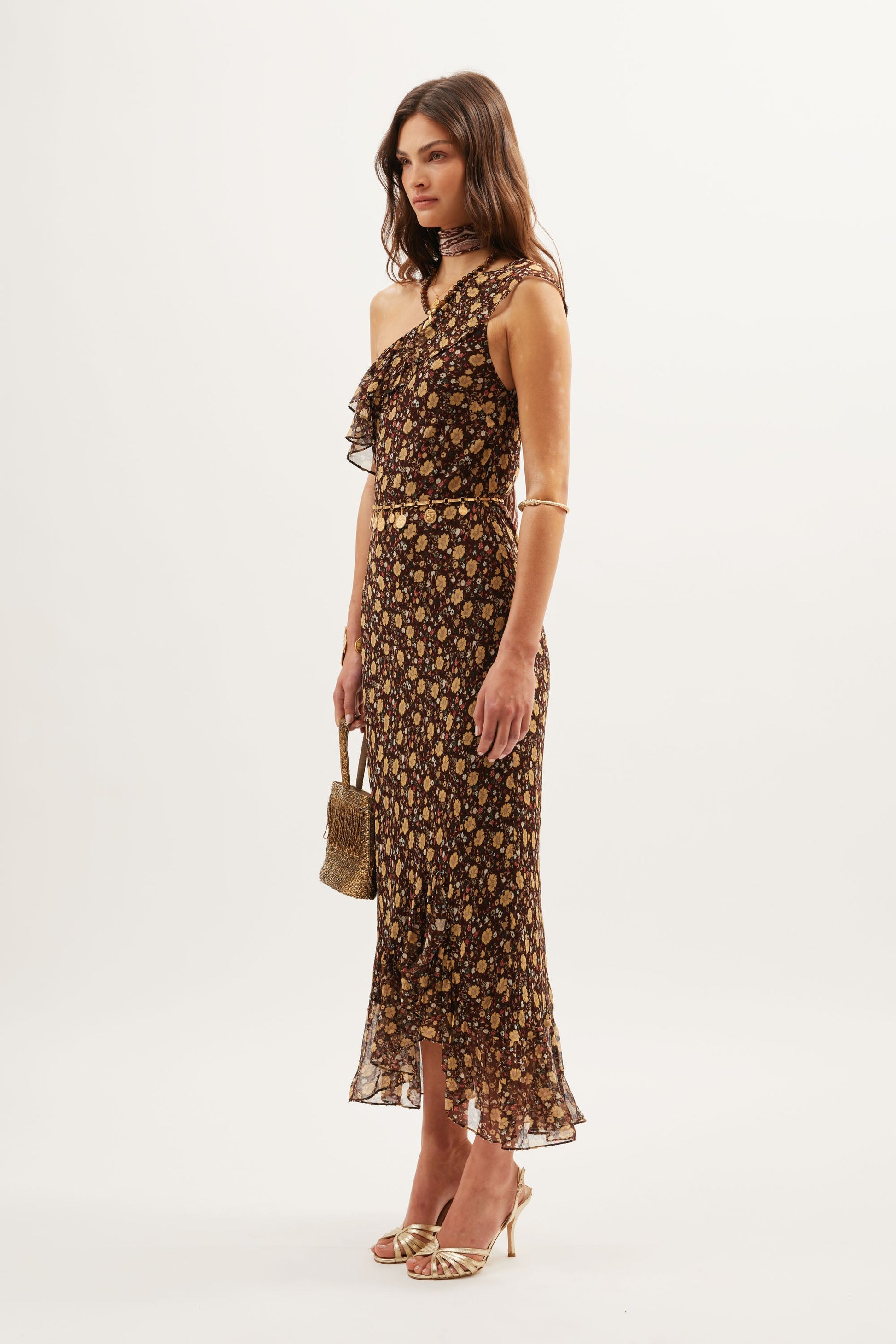 Feminine and flouncy, Leon is inspired by vintage nightwear, with an asymmetric hem and single shoulder. It's made from crinkled-georgette and hand beaded along the frilly edges.