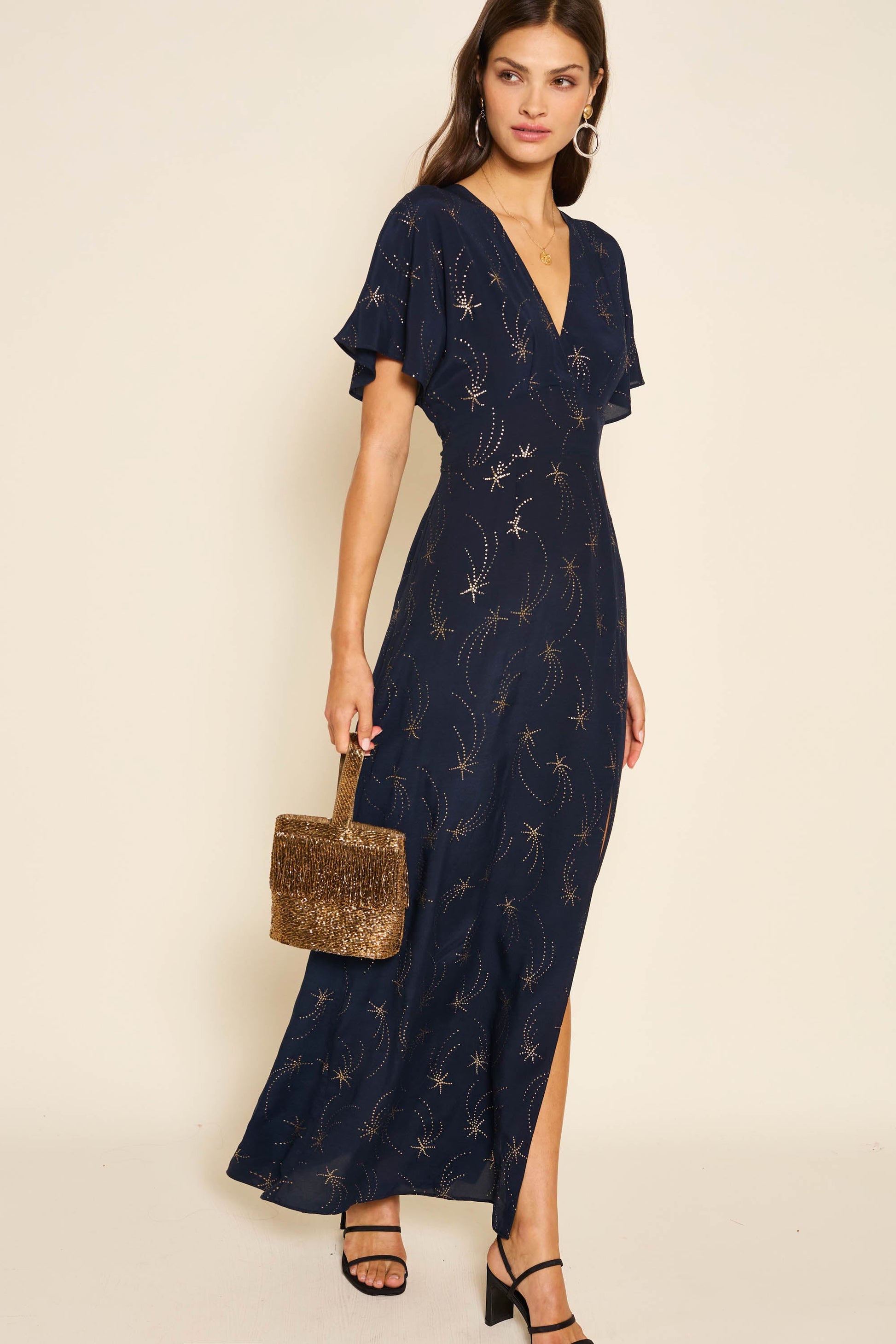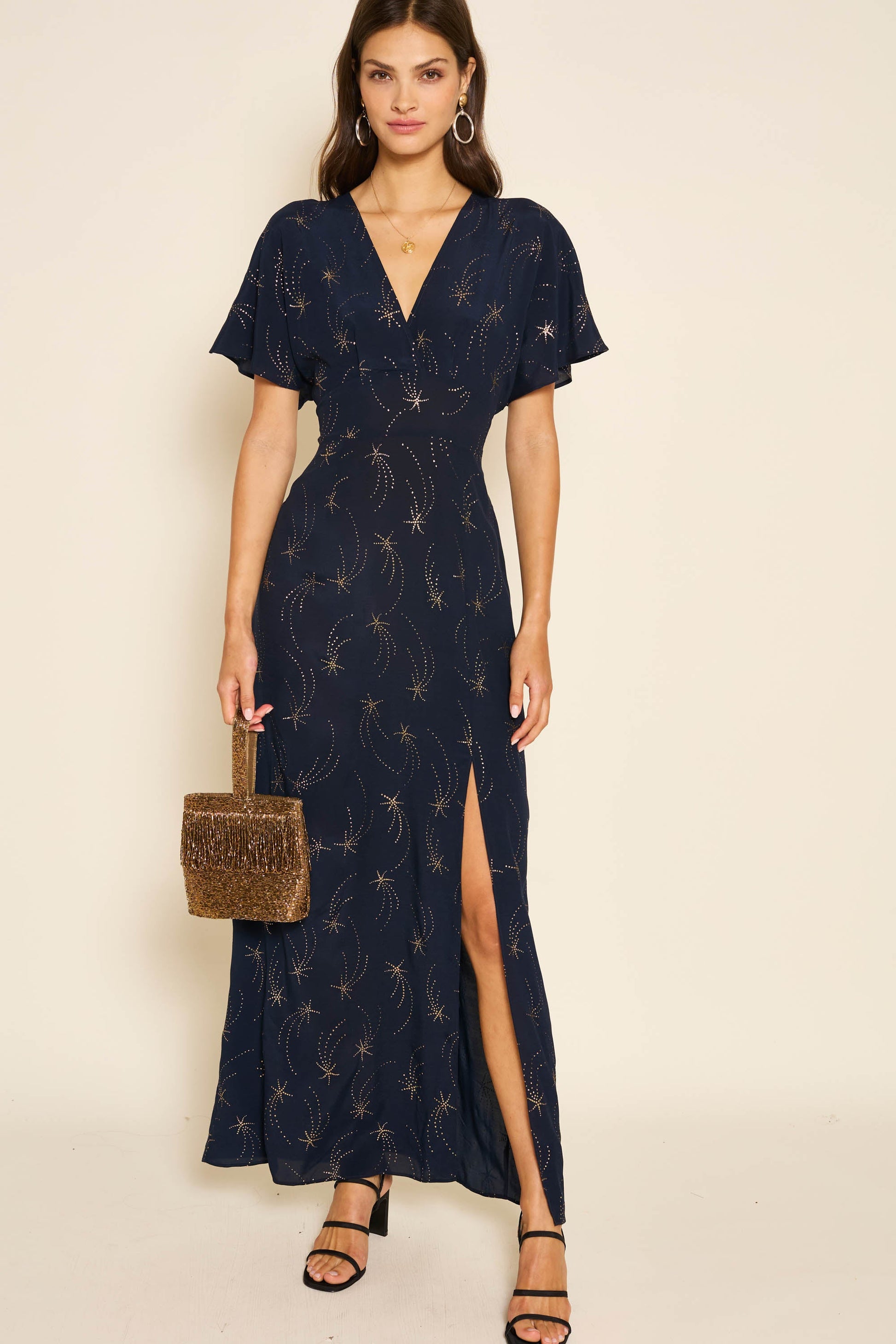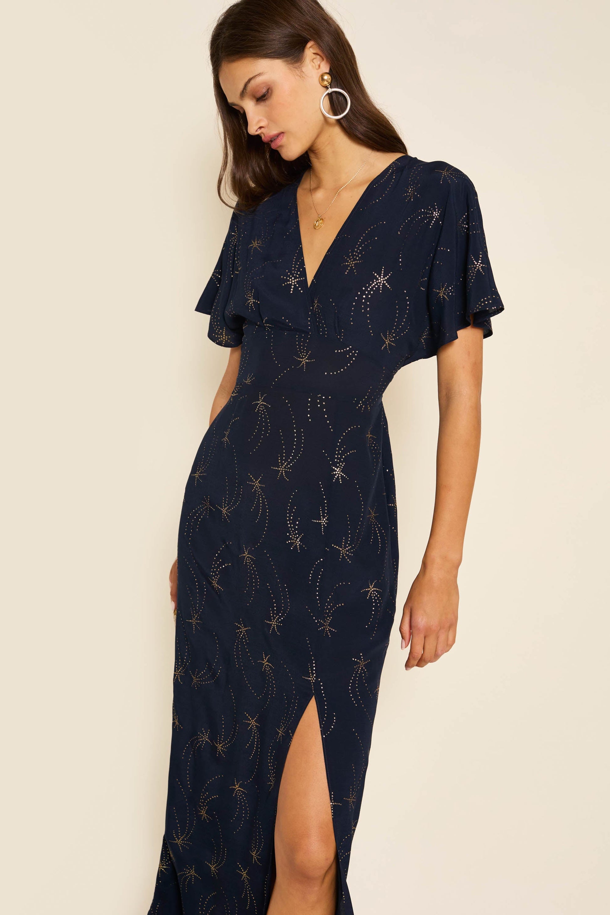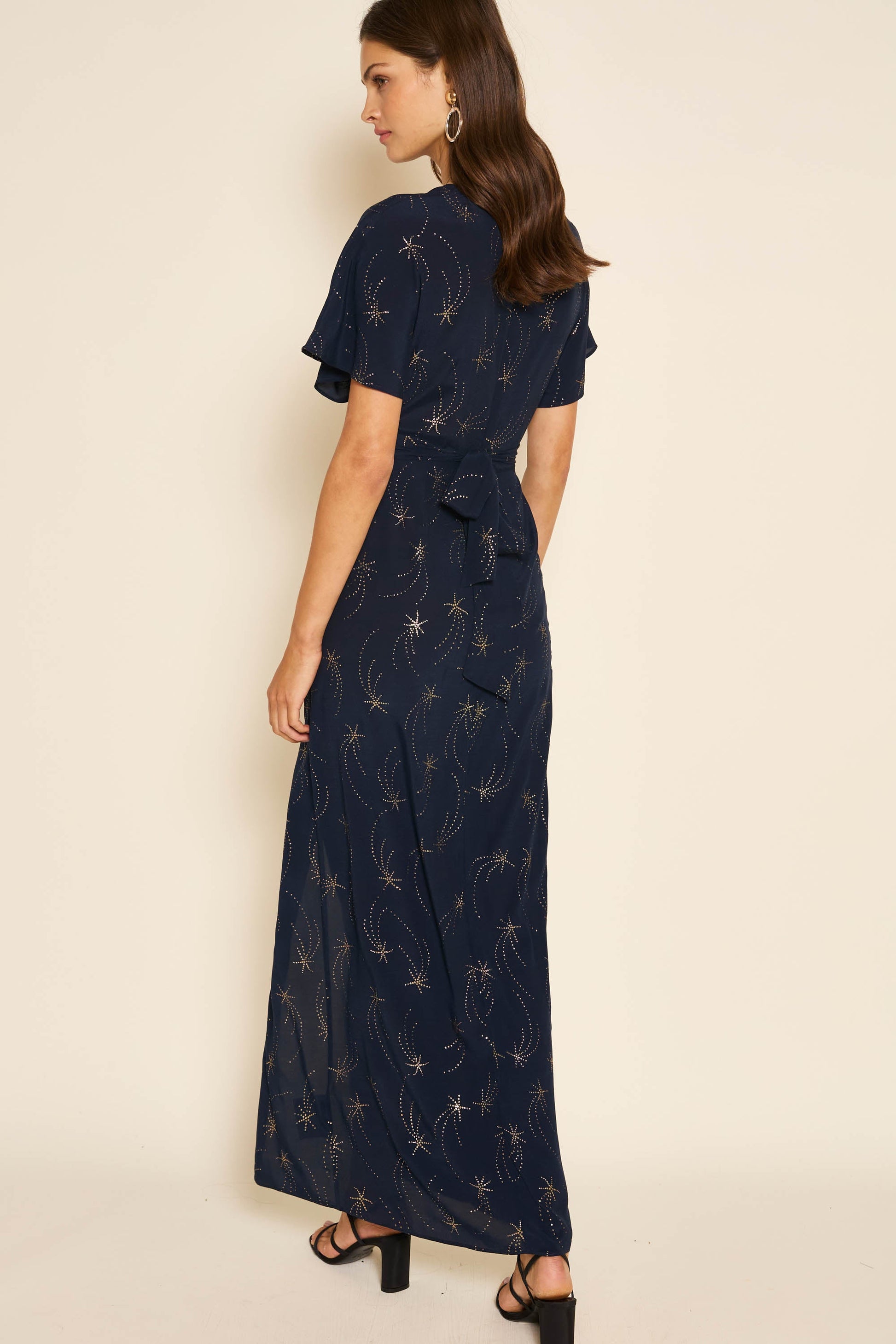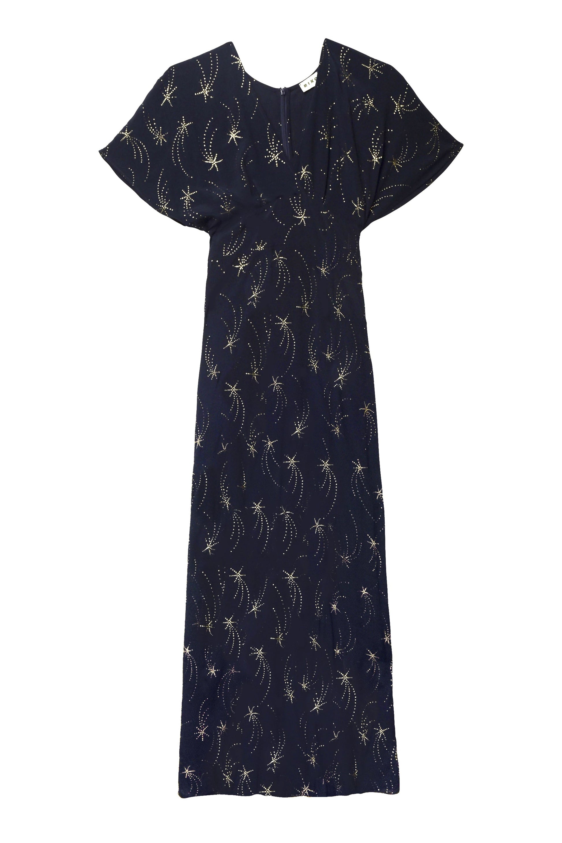 We've tweaked our classic Sadie dress and closed up the back so Lera can be worn year-round. Detailed with glittered shooting stars, it has floaty sleeves that cover the upper arms and side ties for an adjustable fit. The long length works well for black tie.