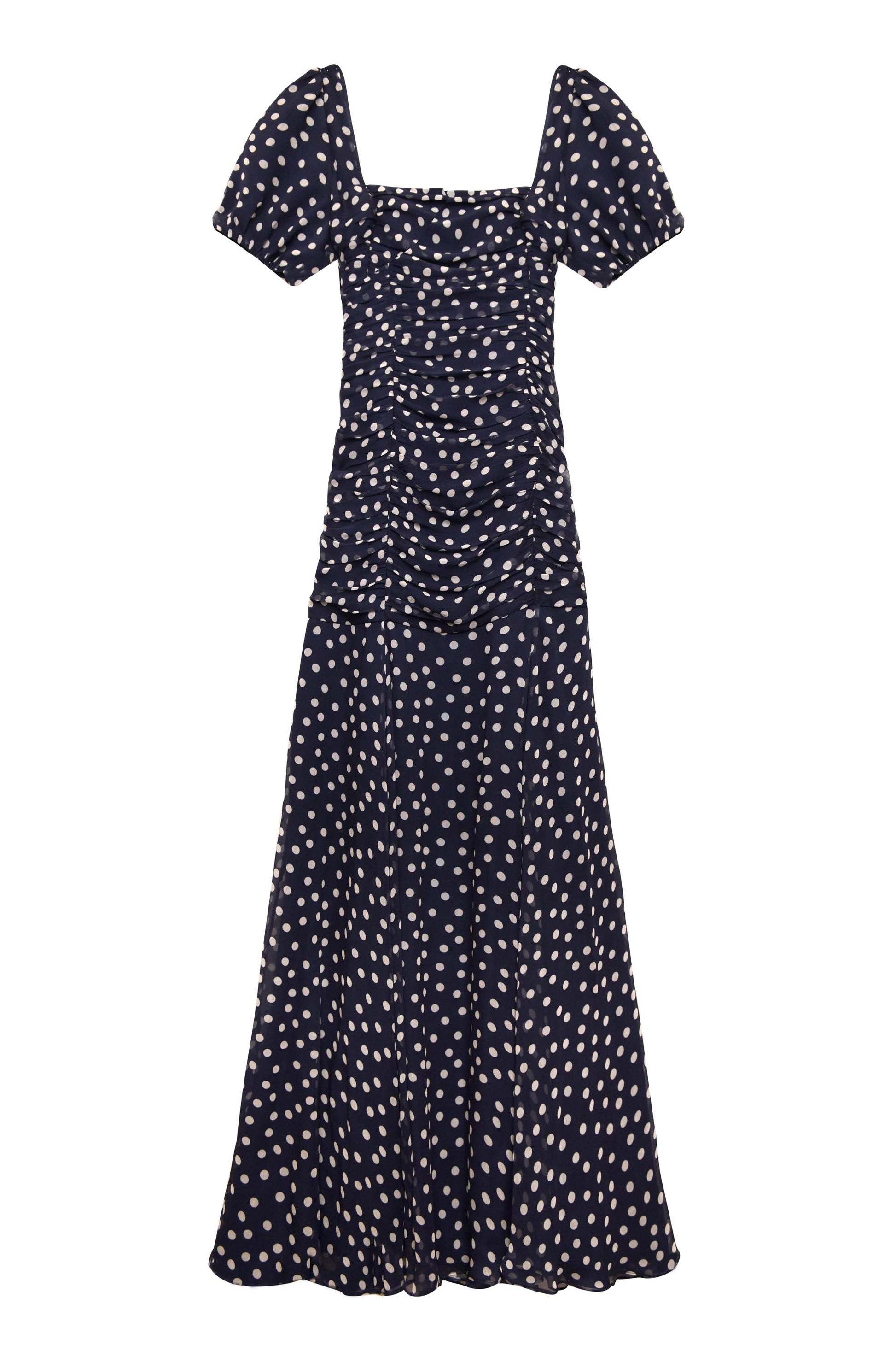 The Leyane is a romantic navy dot dress with a flattering ruched bodice and A line skirt.