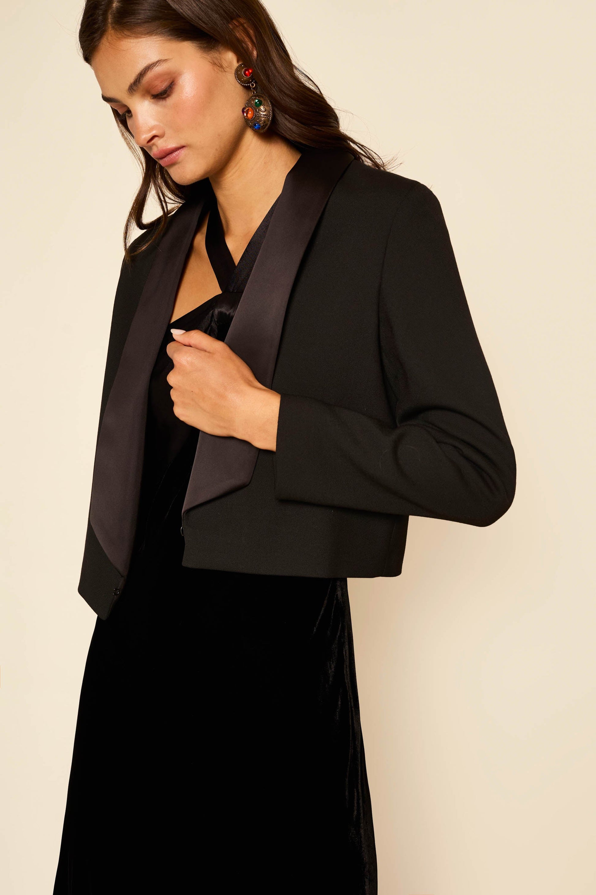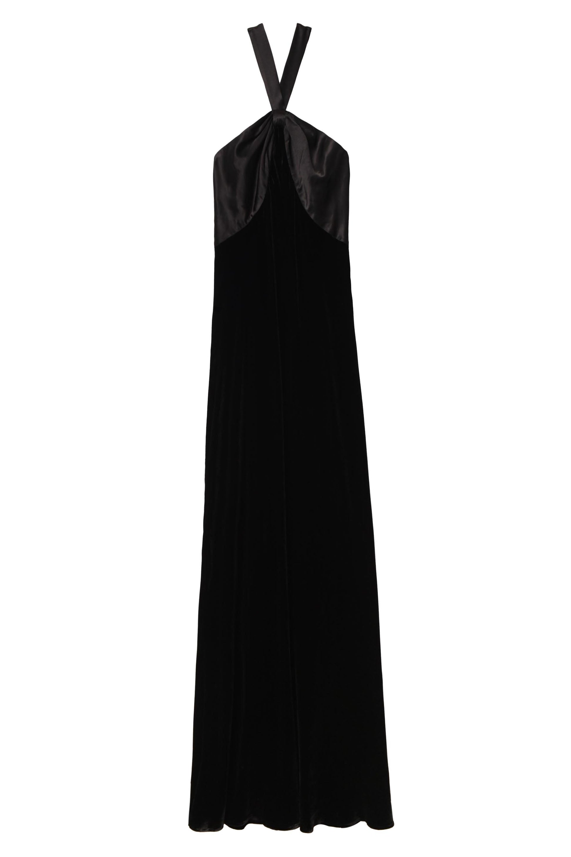 Our answer to the classic tuxedo, Losanna is the perfect black-tie gown. It's made from the softest silk-blend velvet with contrasting satin details and elegant covered buttons. Although the back is open, the straps hold everything in place and the bust sits snugly for a secure fit.