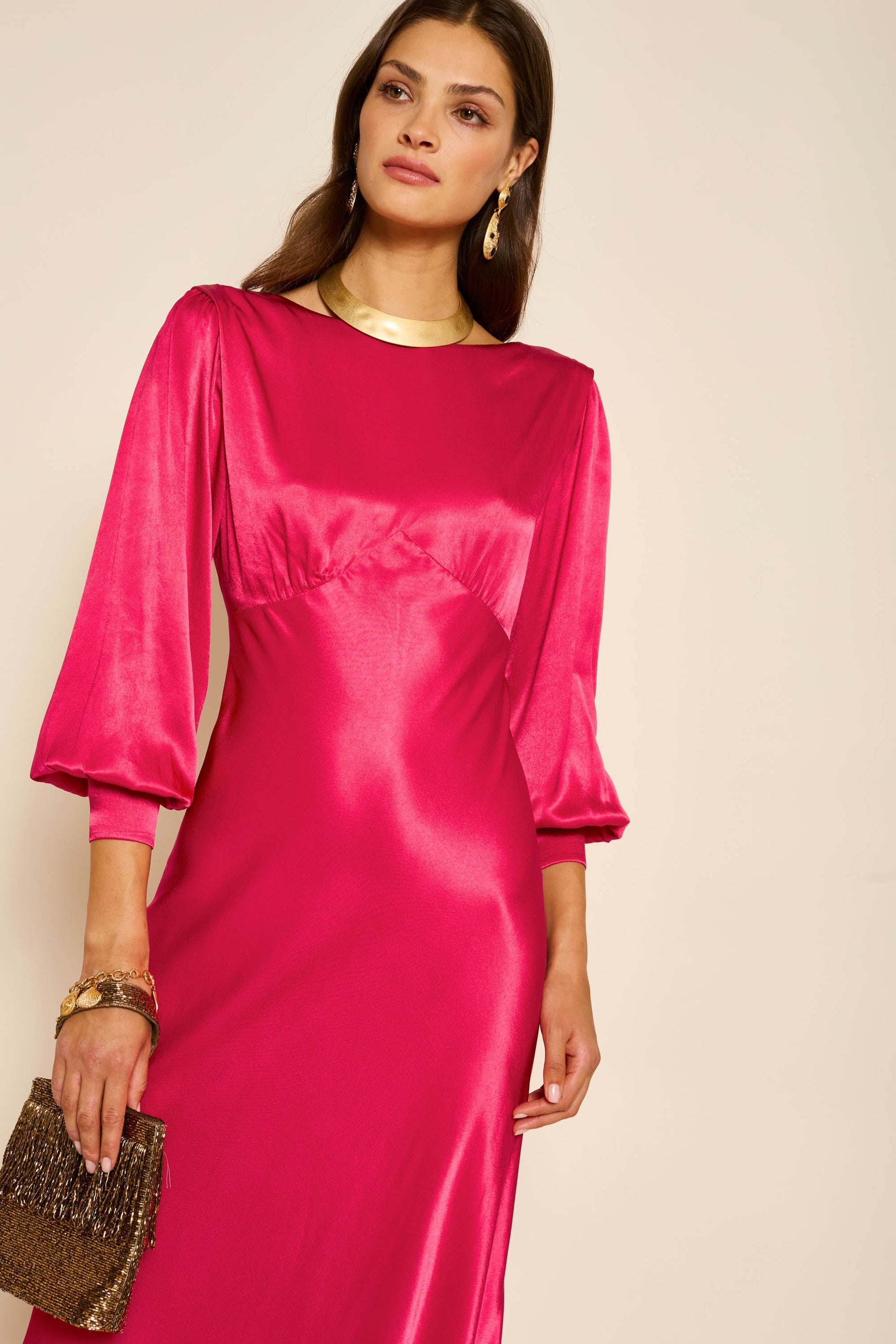 Marni was one of the most popular gowns in our debut GOLD collection. Updated in raspberry satin, this version has the same vintage-inspired silhouette and plunging, V-shaped back.