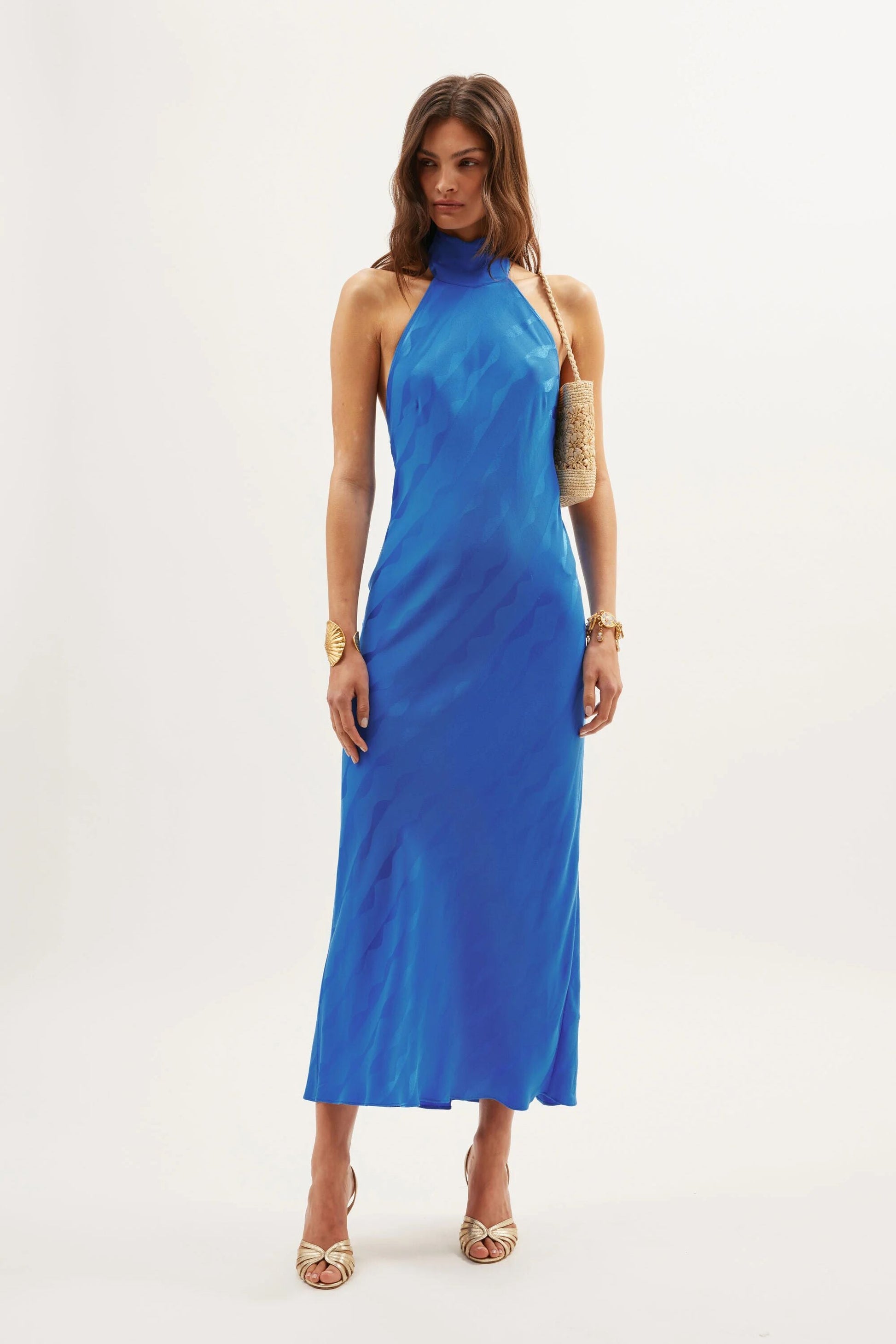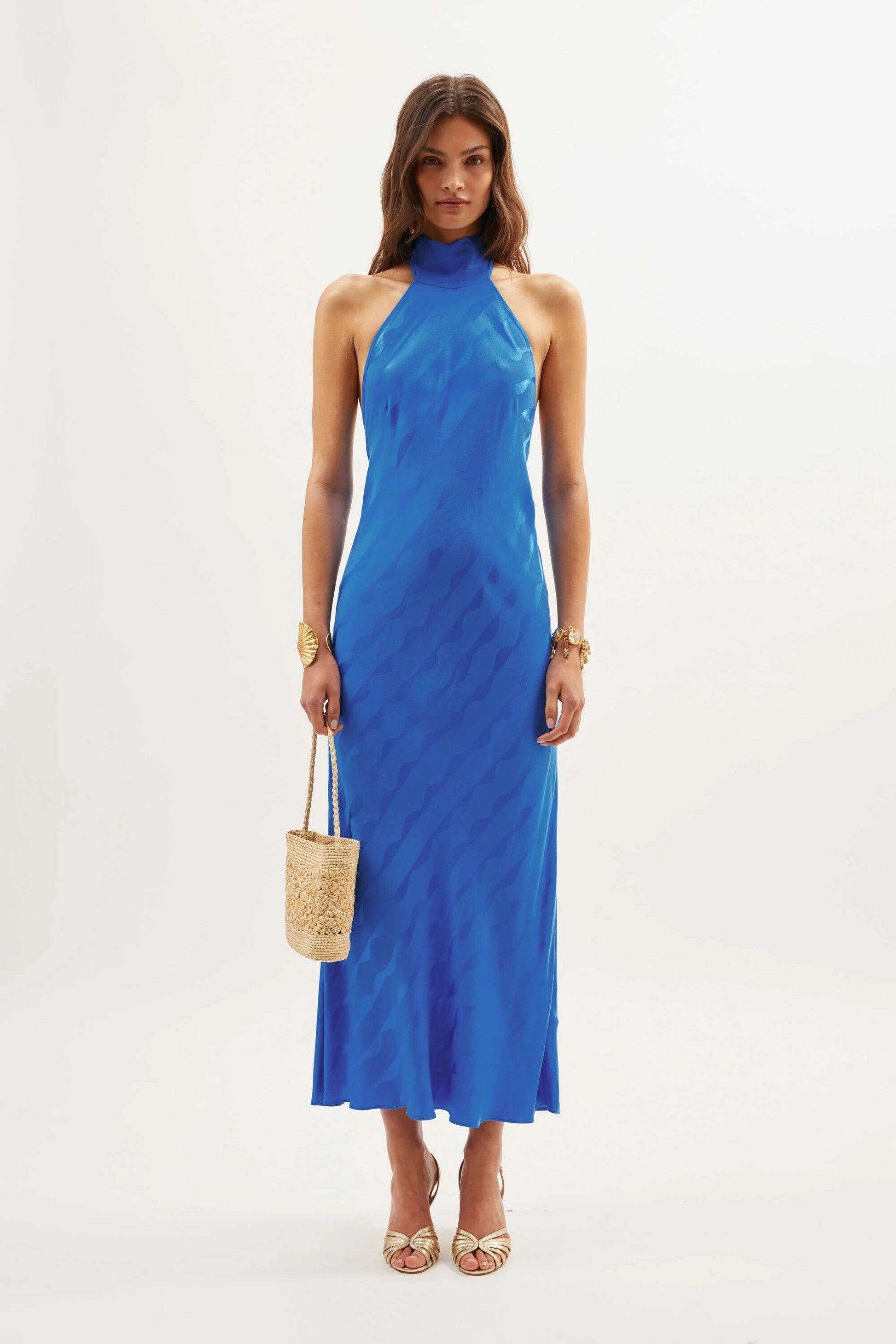 Elegant and understated, Maura has a simple silhouette with halterneck ties that trail down the open back. The jacquard weave adds interest without the need for print.