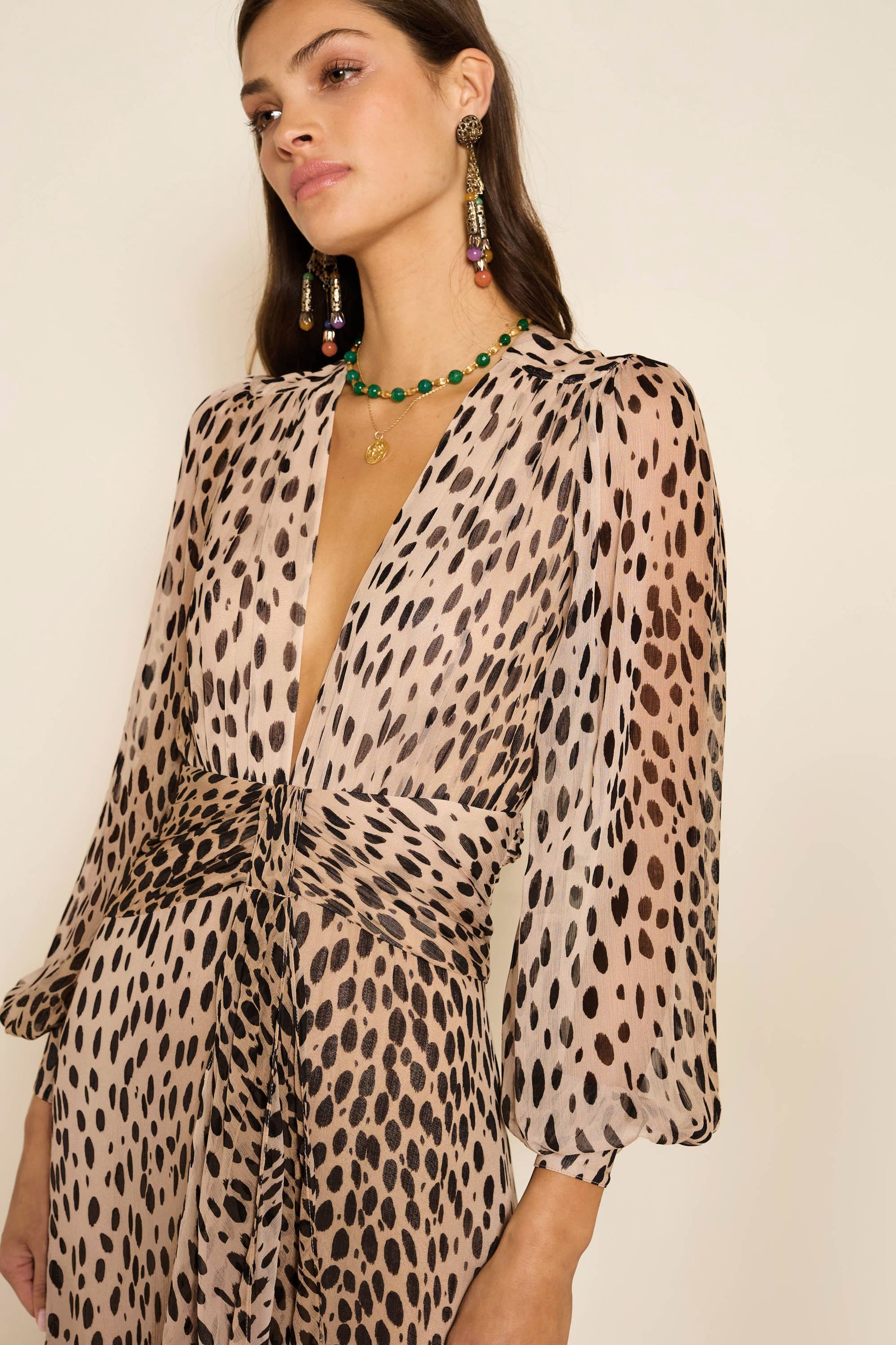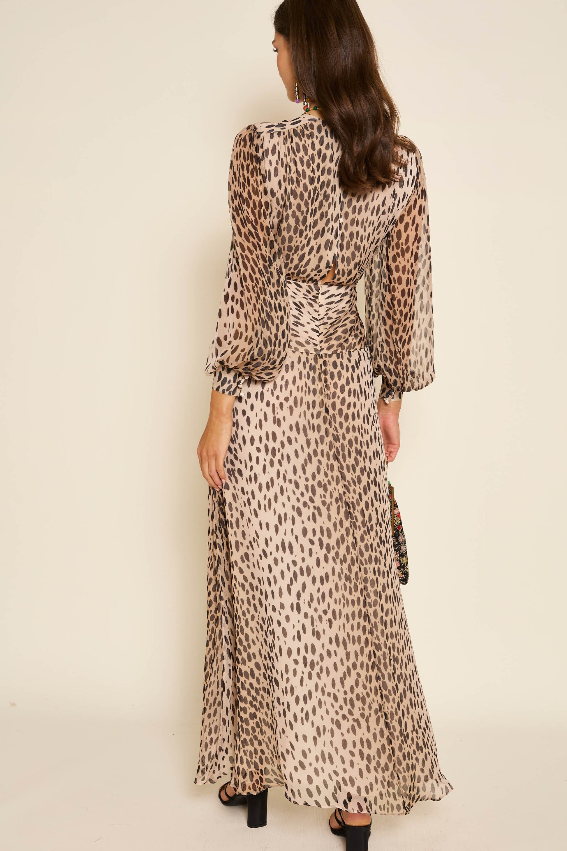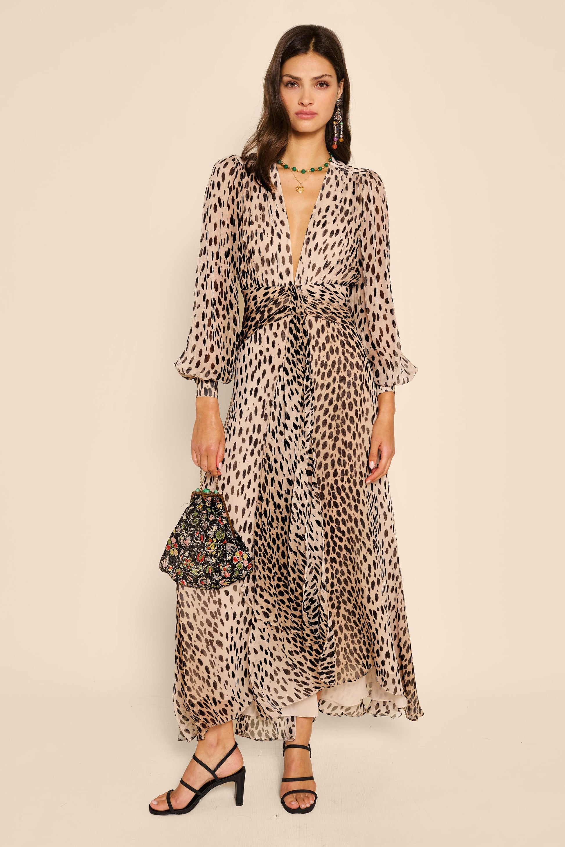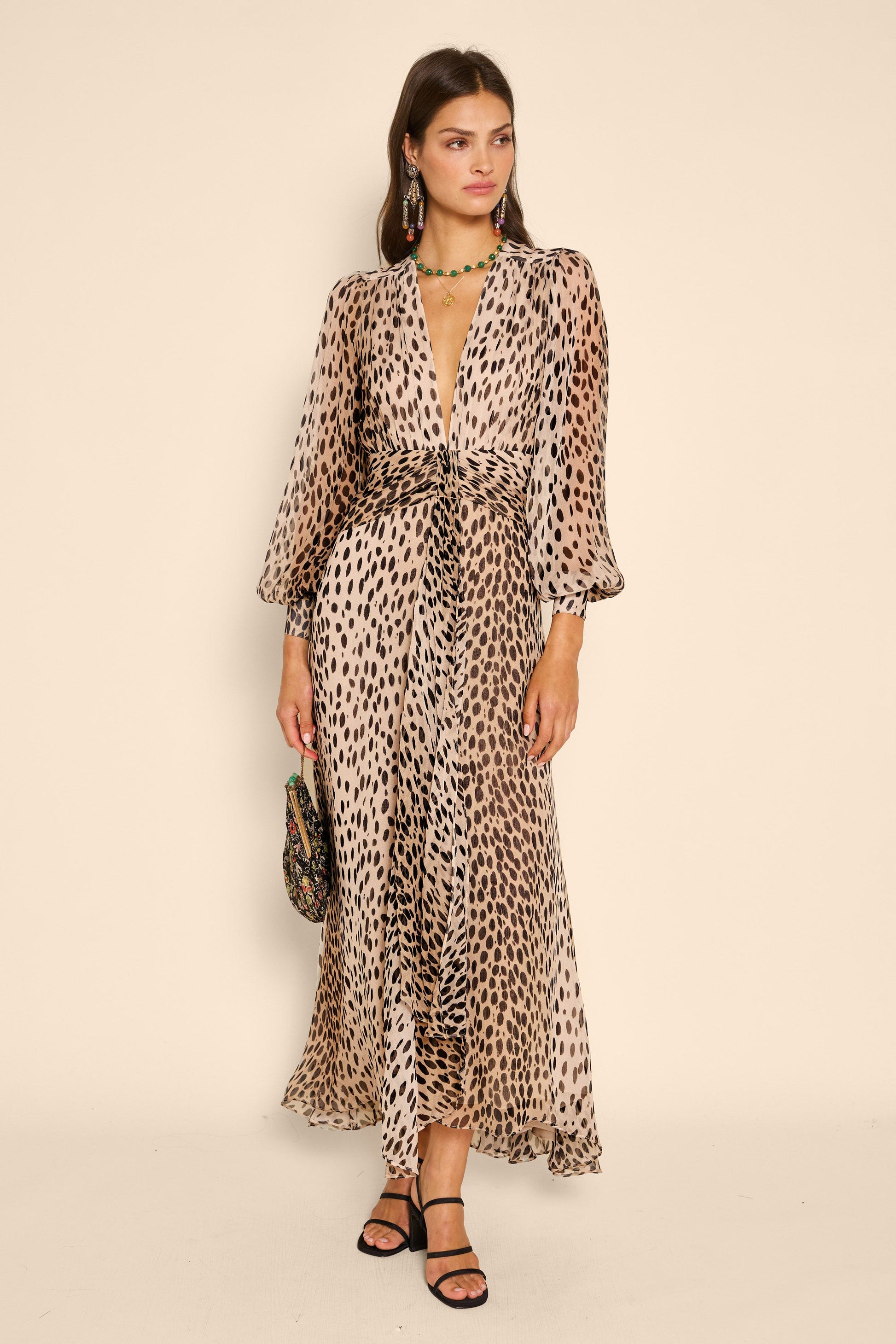 This Meera gown is an update on one of our bestsellers - the crinkled-chiffon feels extra special. Long sleeves balance the plunging neckline and the fabric is slit at the back to reveal a flash of skin.