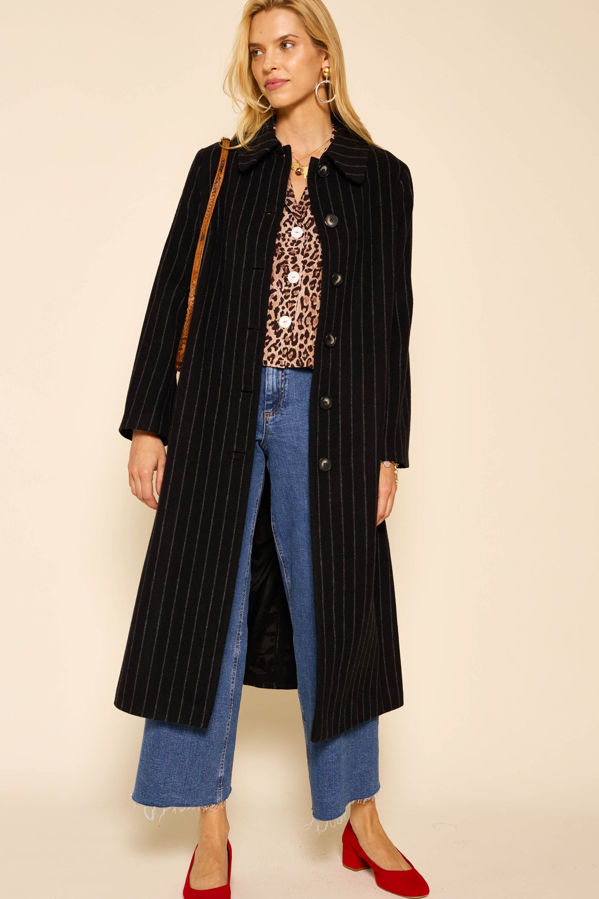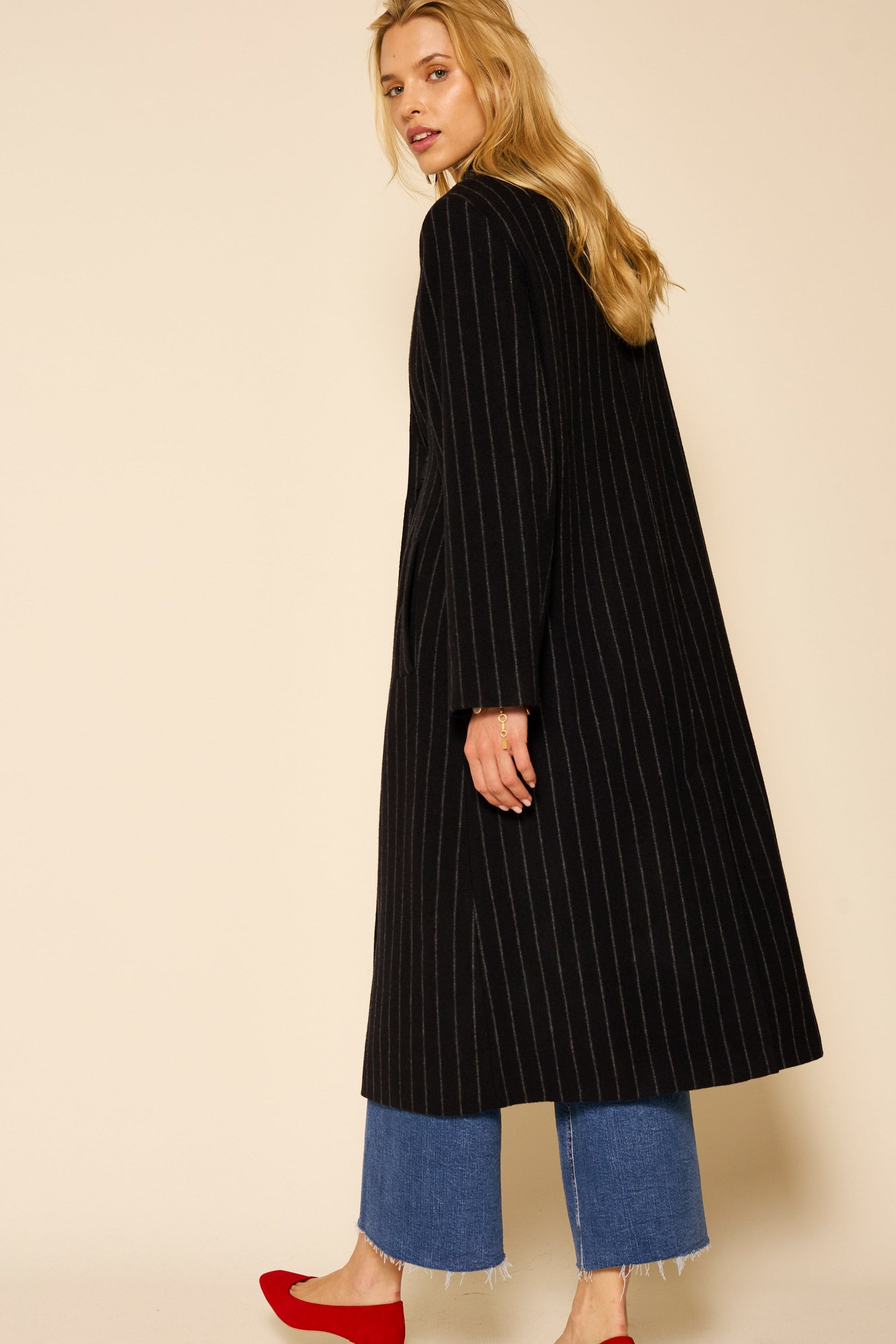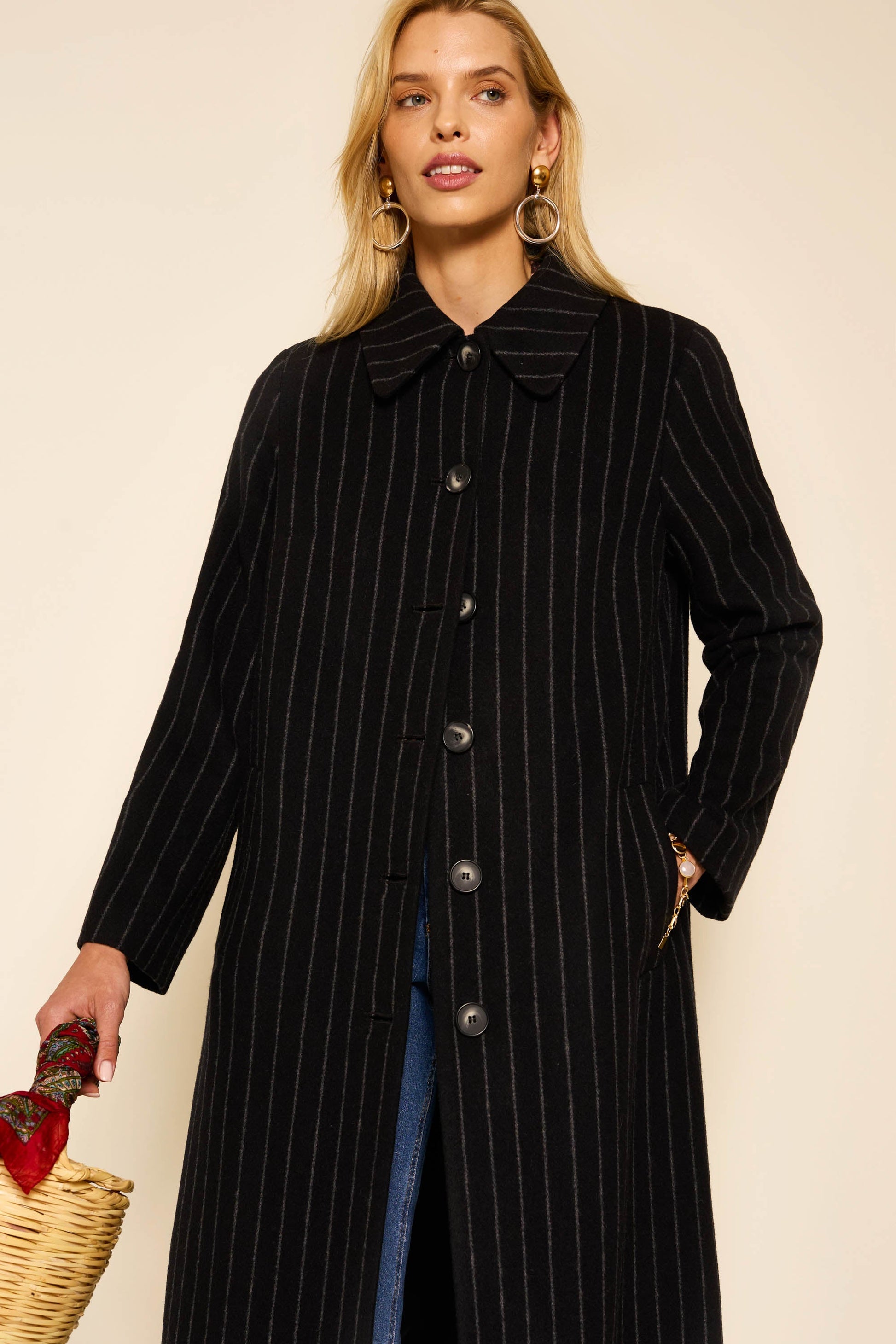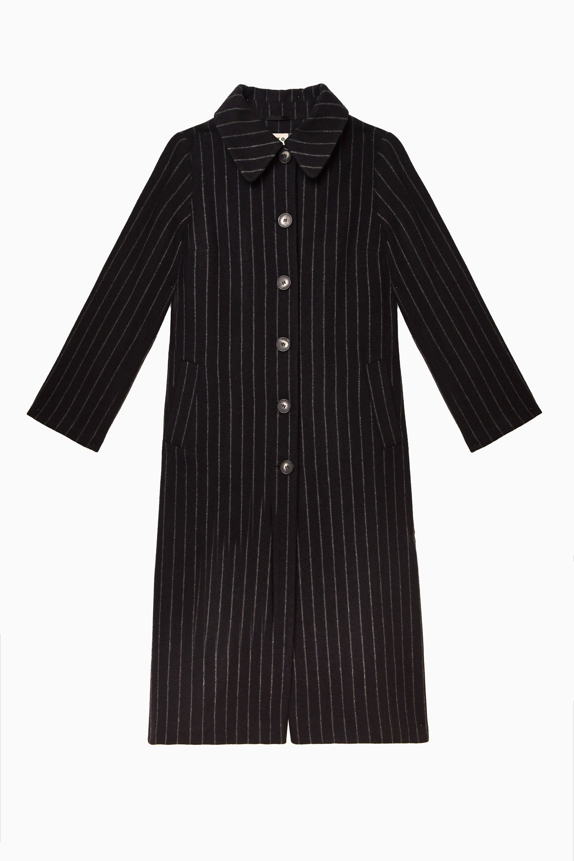 Our Milly coat is a RIXO signature, and we've updated the fabric and the fit to make it better than ever. This black pinstriped version is a classic and goes with everything.