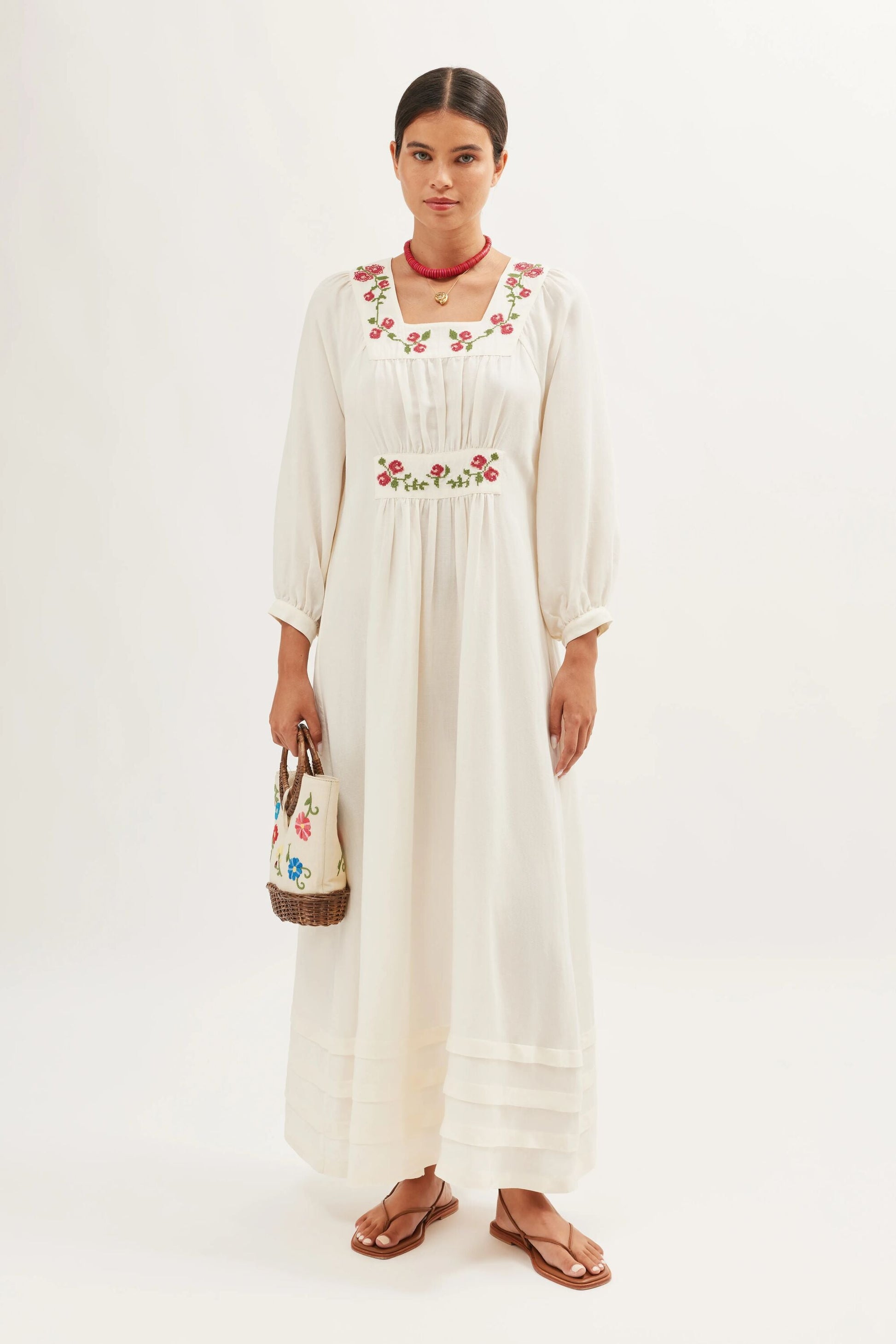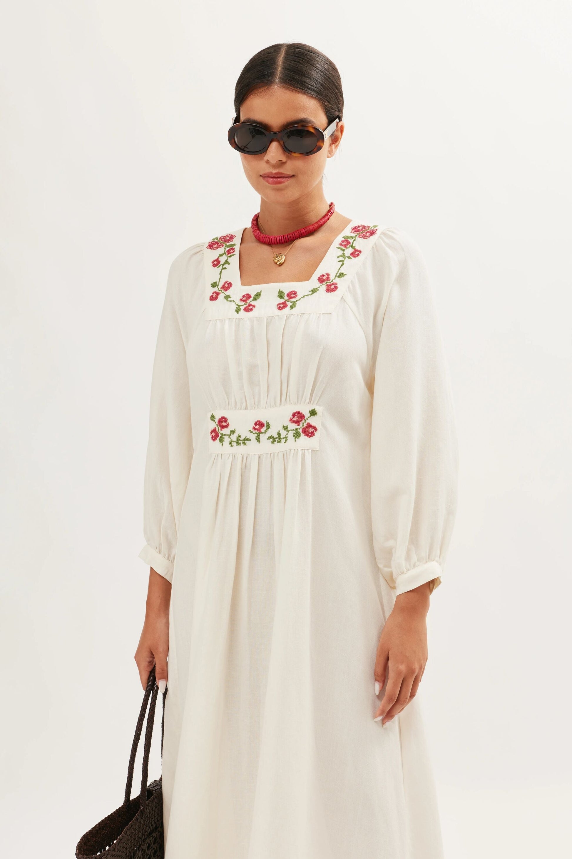 Meet our beautiful Neila dress in ivory from RIXO's exclusive collaboration with Billie Bhatia. Made from linen-blend, its intricate floral embroidery and airy 1970s inspired shape is both charming and perfect for every day.