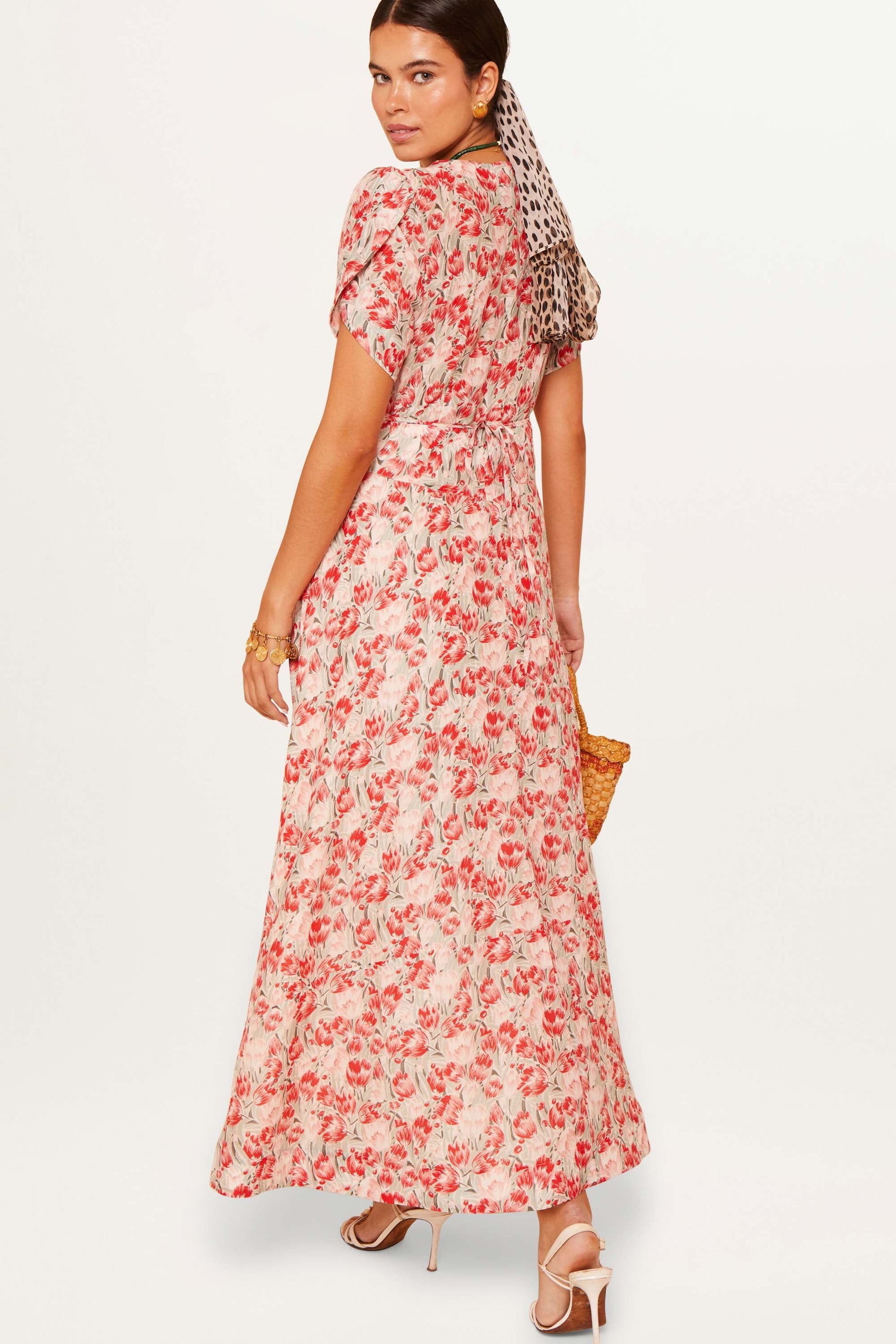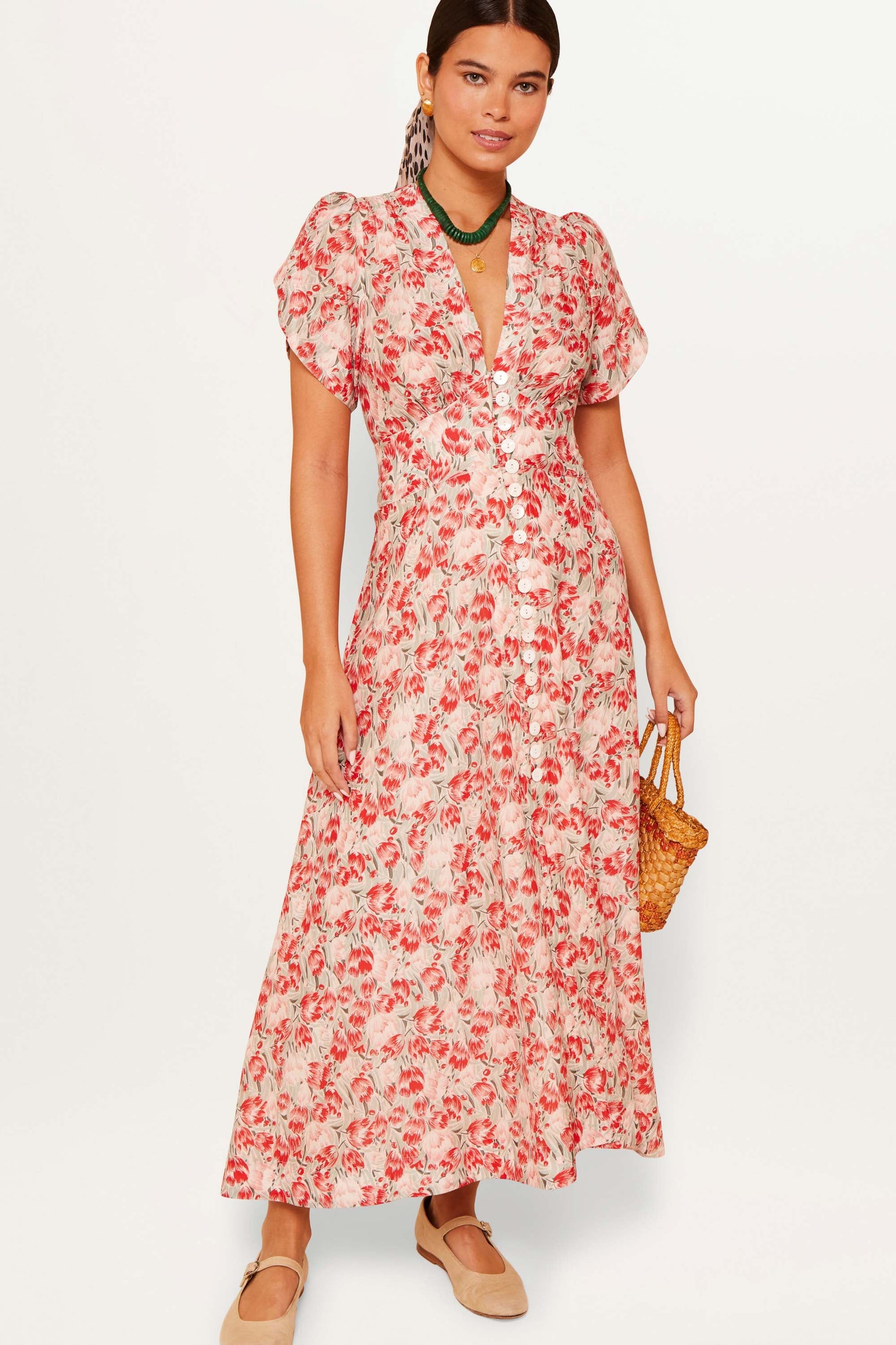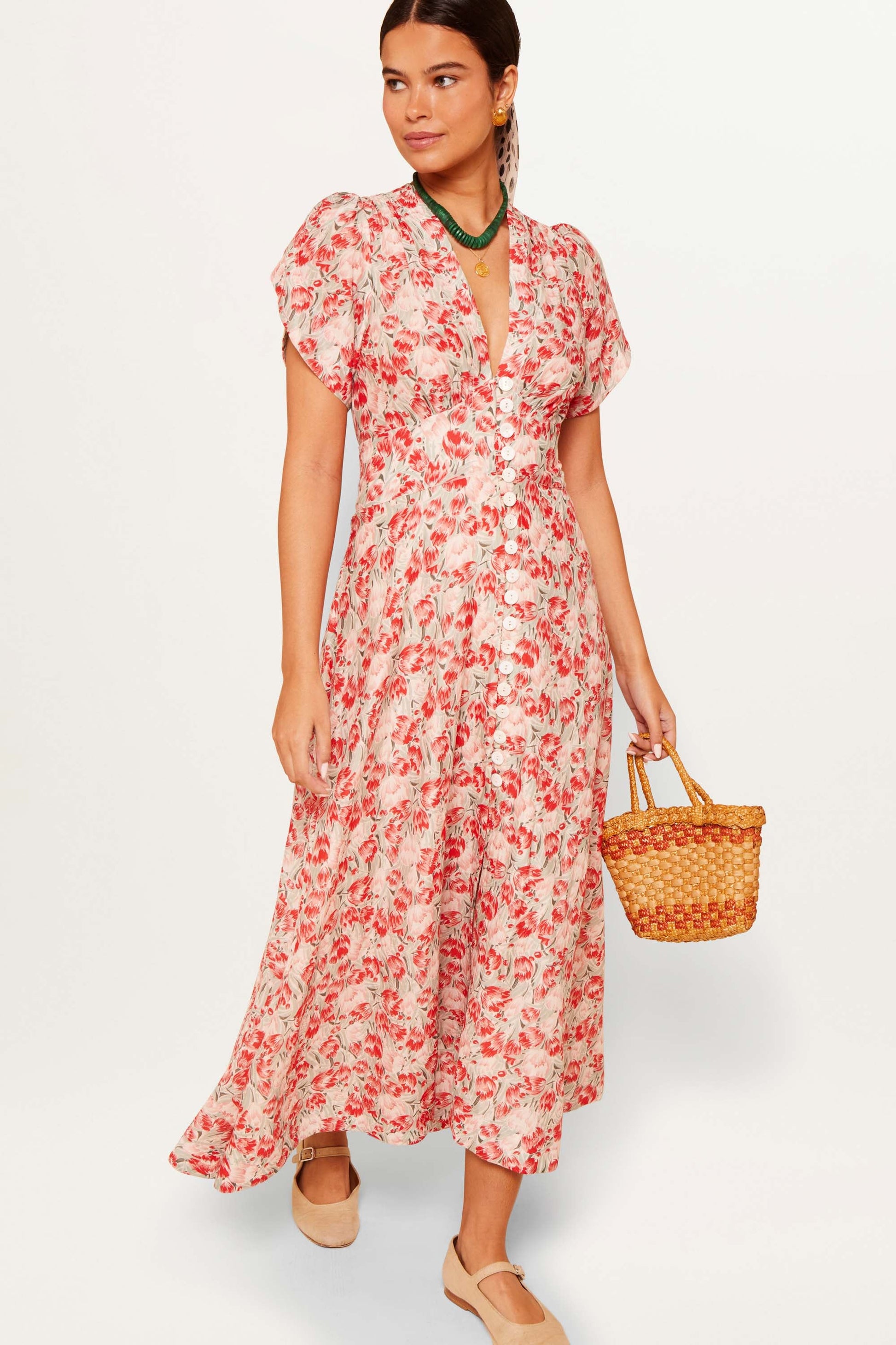 Novara is a brand new style for us, inspired by a vintage dress that Co-founder and Creative Director, Orlagh, loved. The curved sleeves create such a pretty shape that compliments the nipped-in waist and Tulip Fields print.