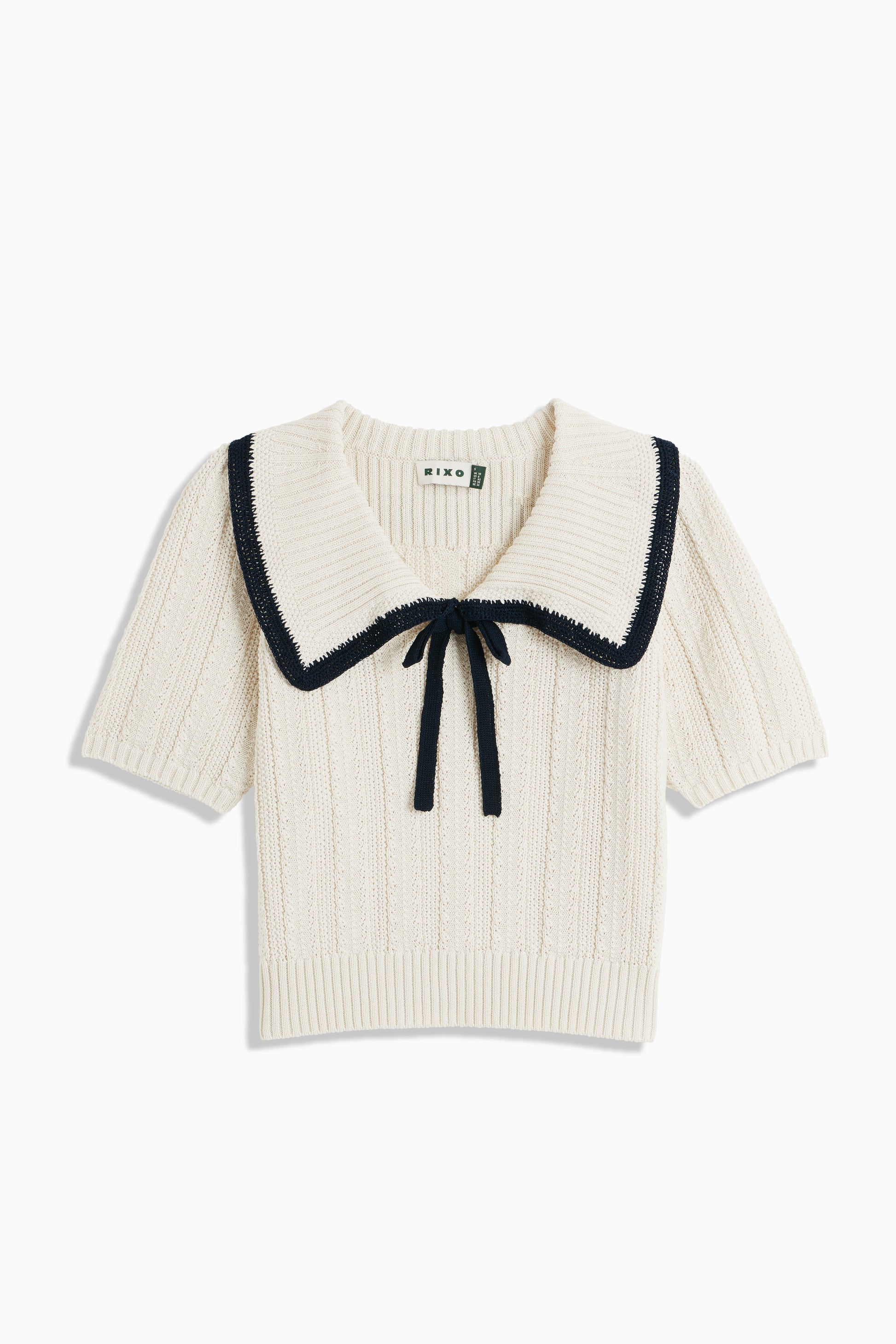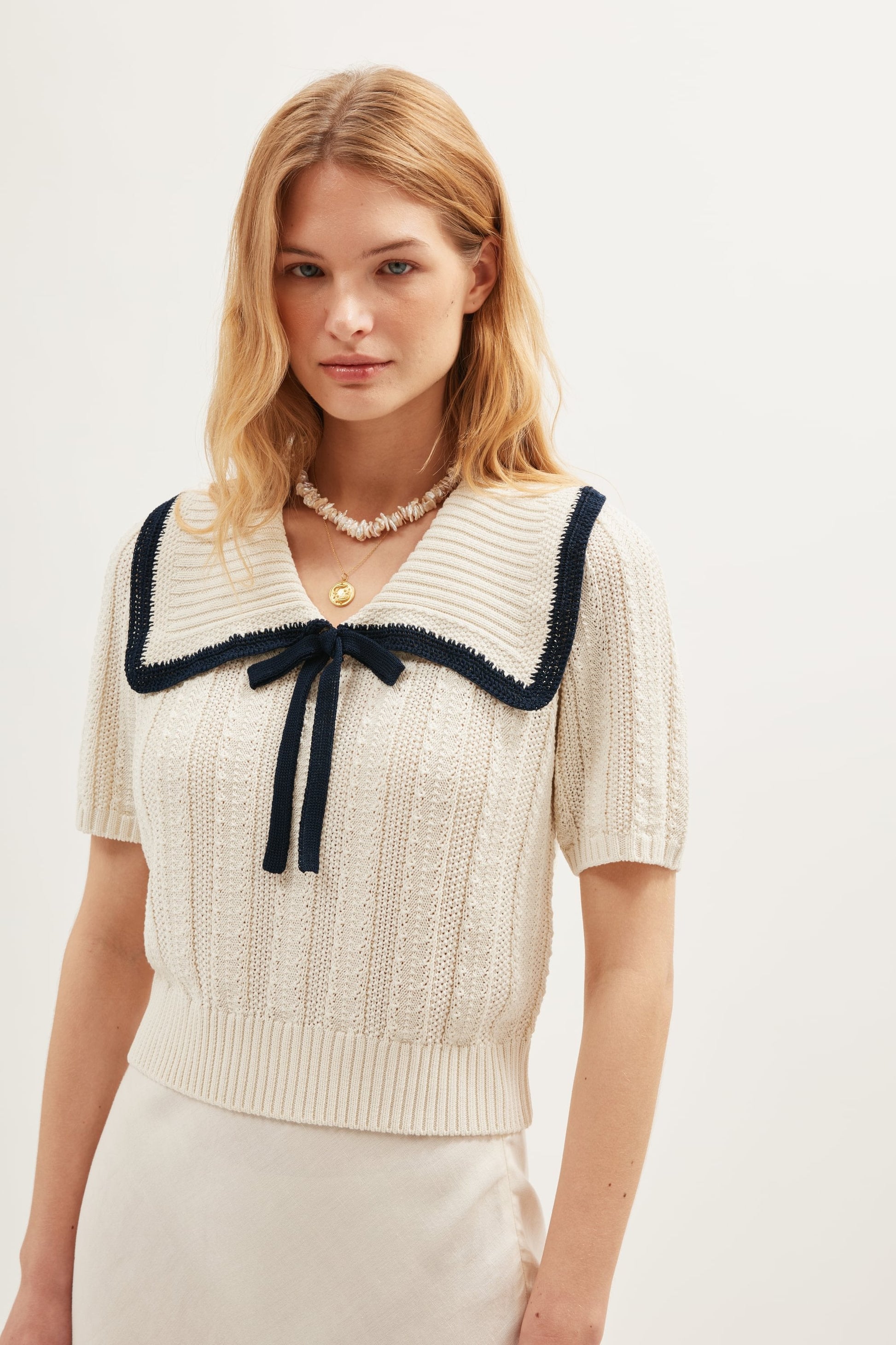 This Pippa top is the perfect summer nautical knit. The collar detail is inspired by a vintage style we loved - we added a bow and short, puffed sleeves.