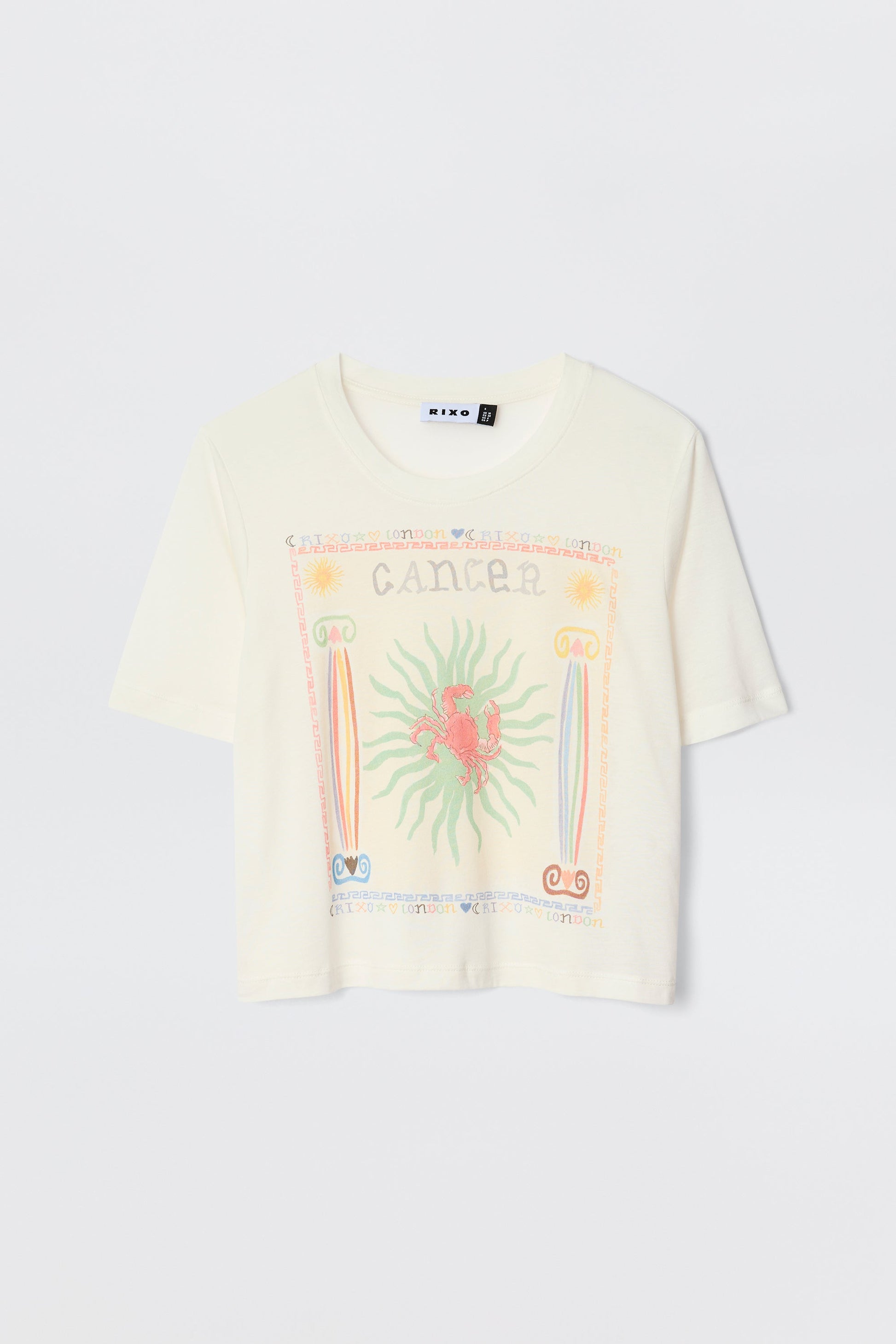 Our Co-founder, Orlagh, sketched this Cancer illustration by hand so each Ria T-shirt is unique. It's made from slightly sheer jersey with a cropped hem that's easy to tuck into your favourite RIXO skirts.