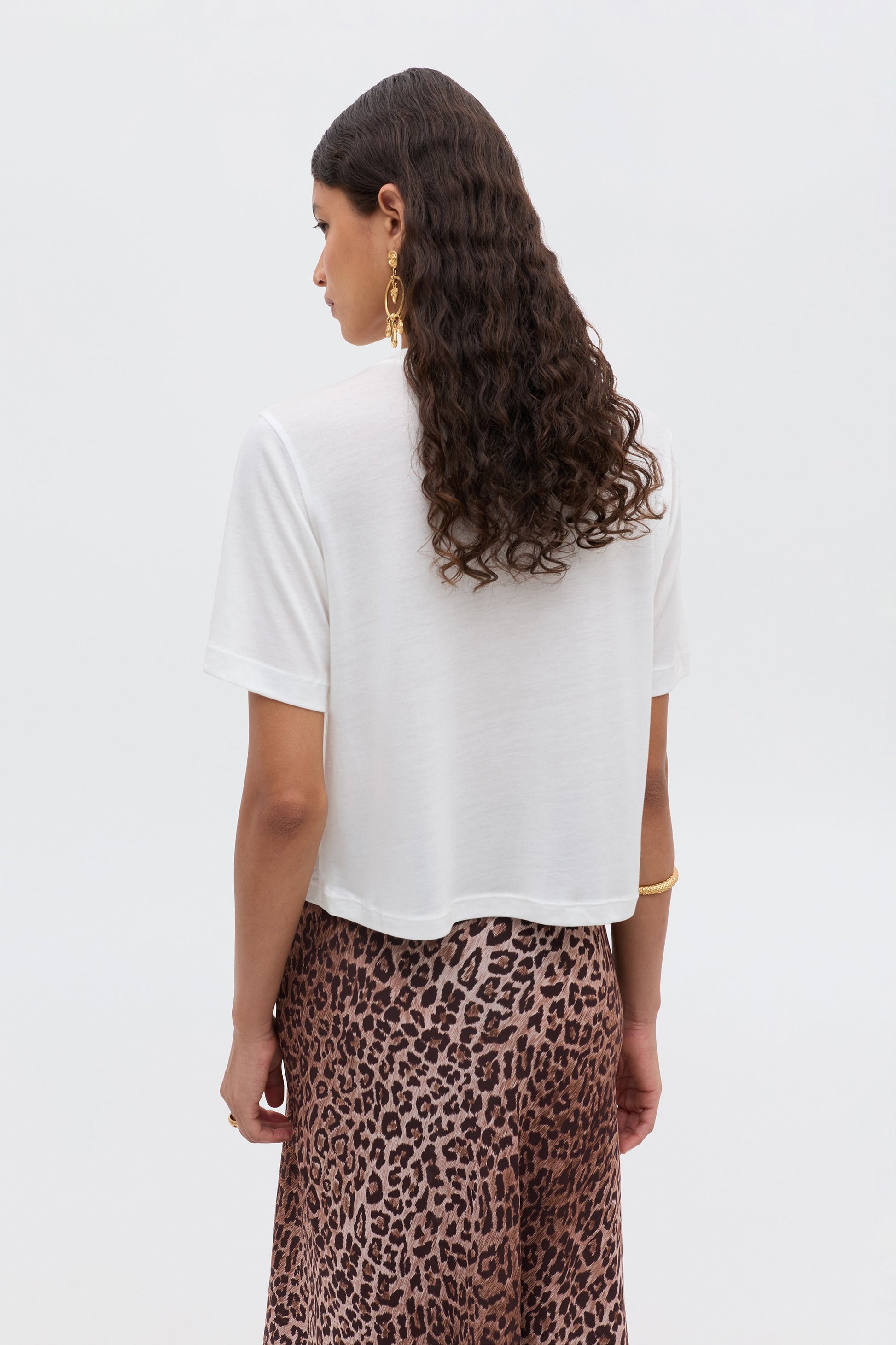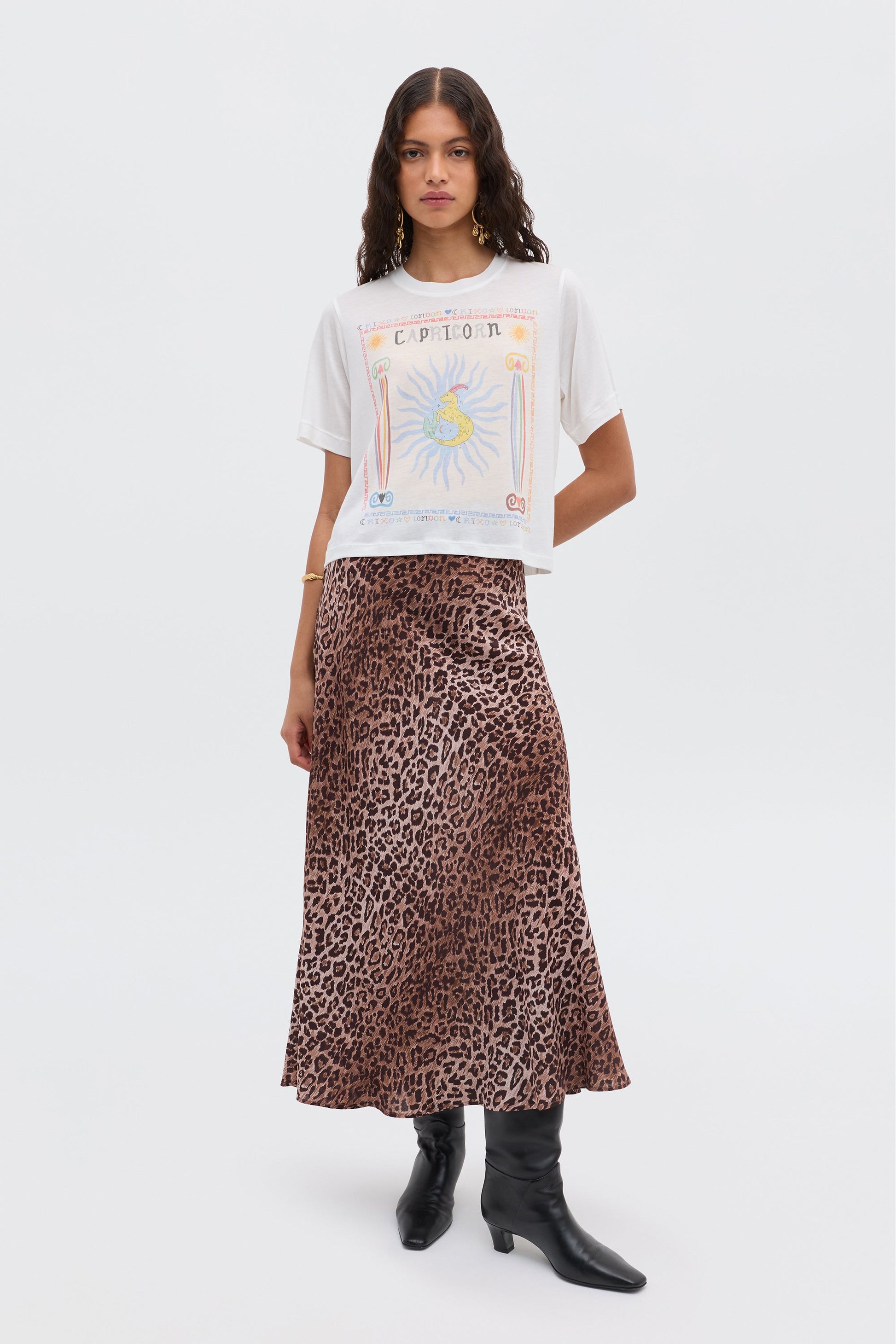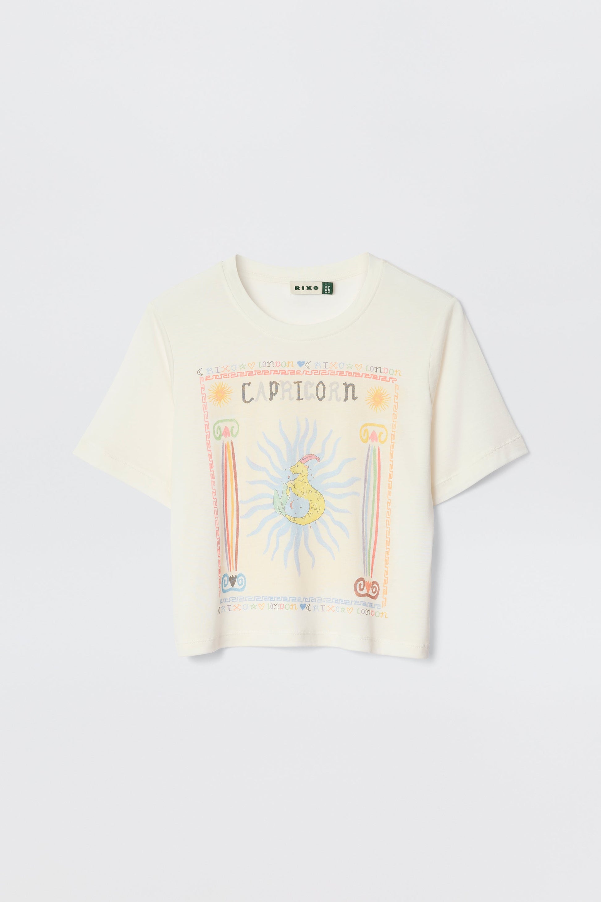 Our Co-founder, Orlagh, sketched this Capricorn illustration by hand so each Ria T-shirt is unique. It's made from slightly sheer jersey with a cropped hem that's easy to tuck into your favourite RIXO skirts.