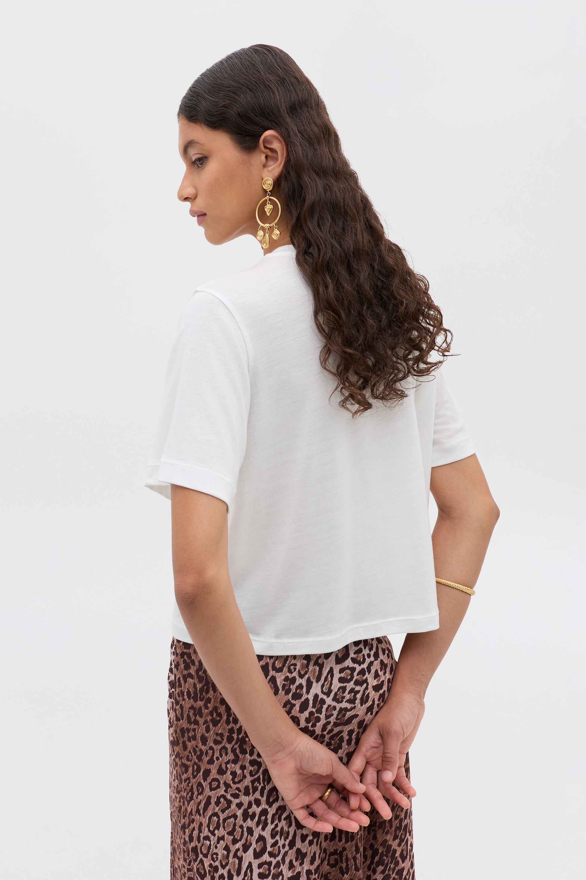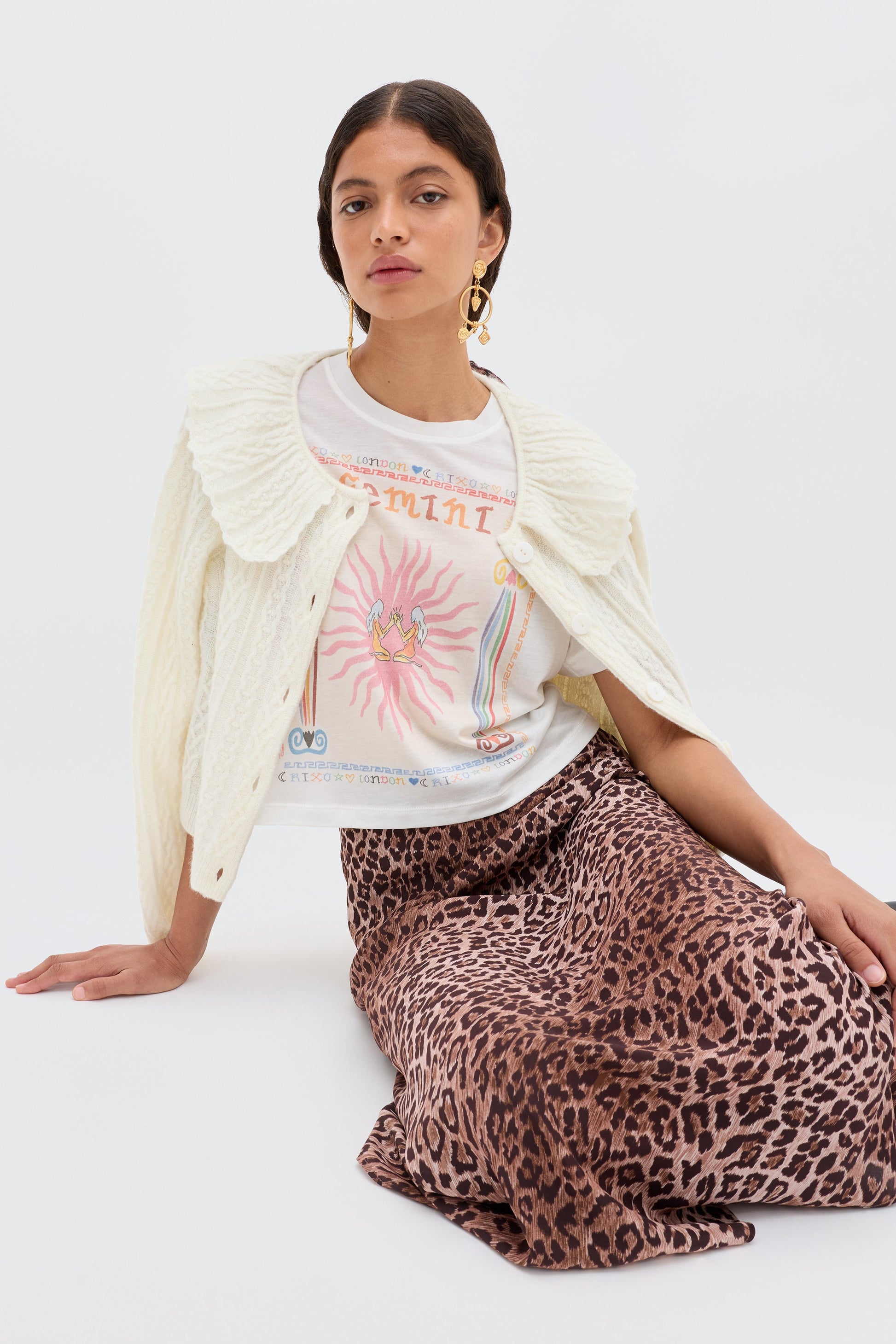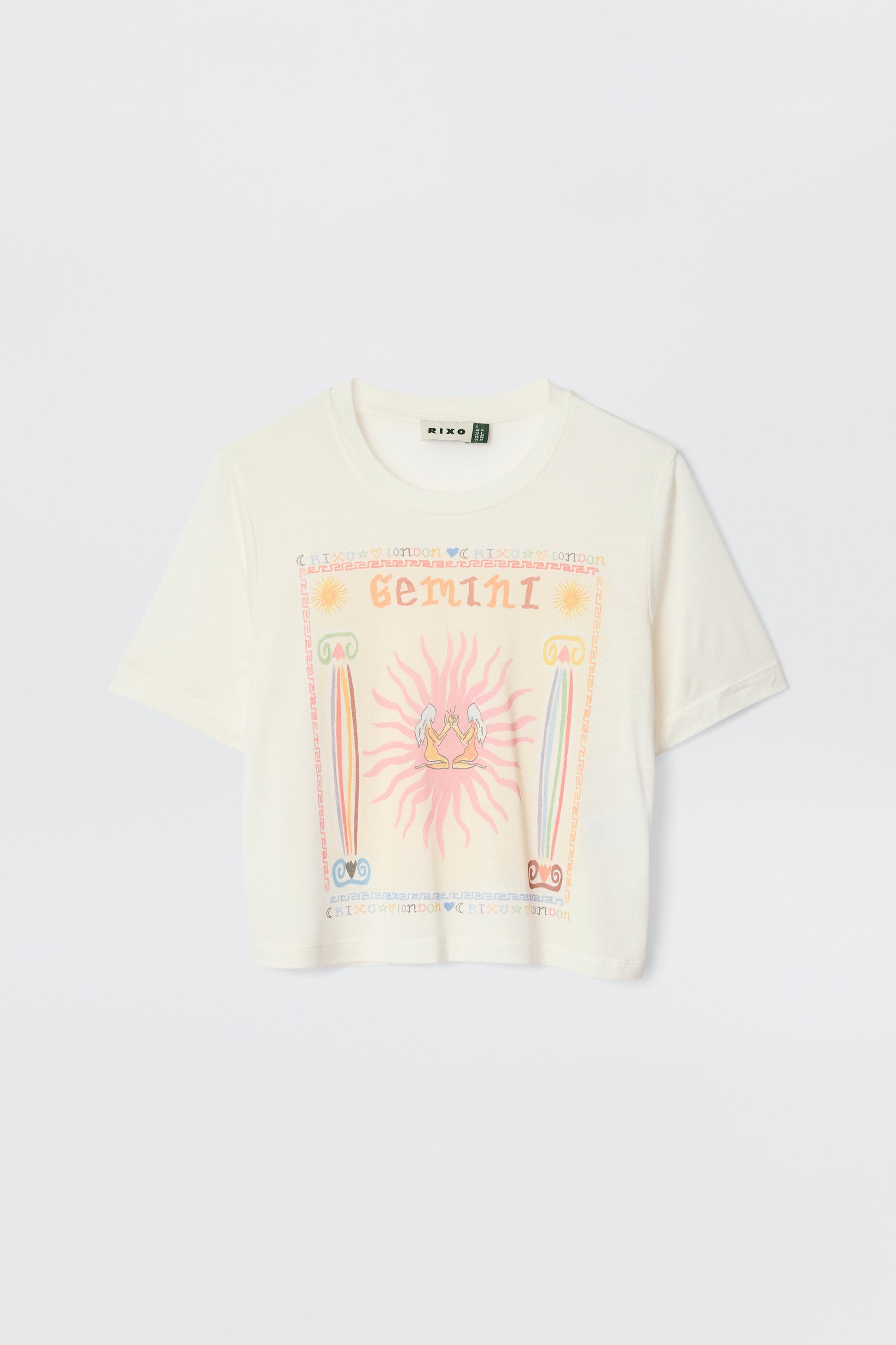 Our Co-founder, Orlagh, sketched this Gemini illustration by hand so each Ria T-shirt is unique. It's made from slightly sheer jersey with a cropped hem that's easy to tuck into your favourite RIXO skirts.
