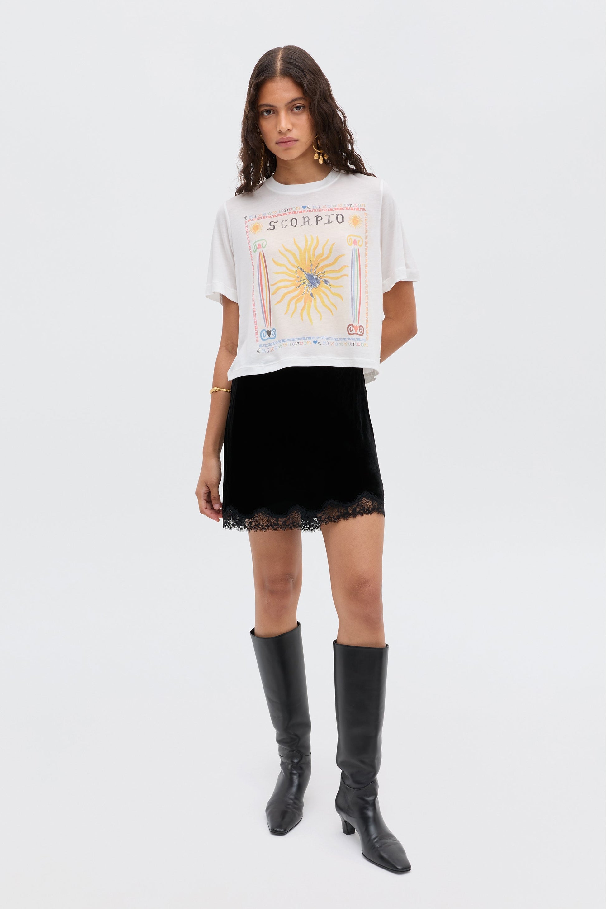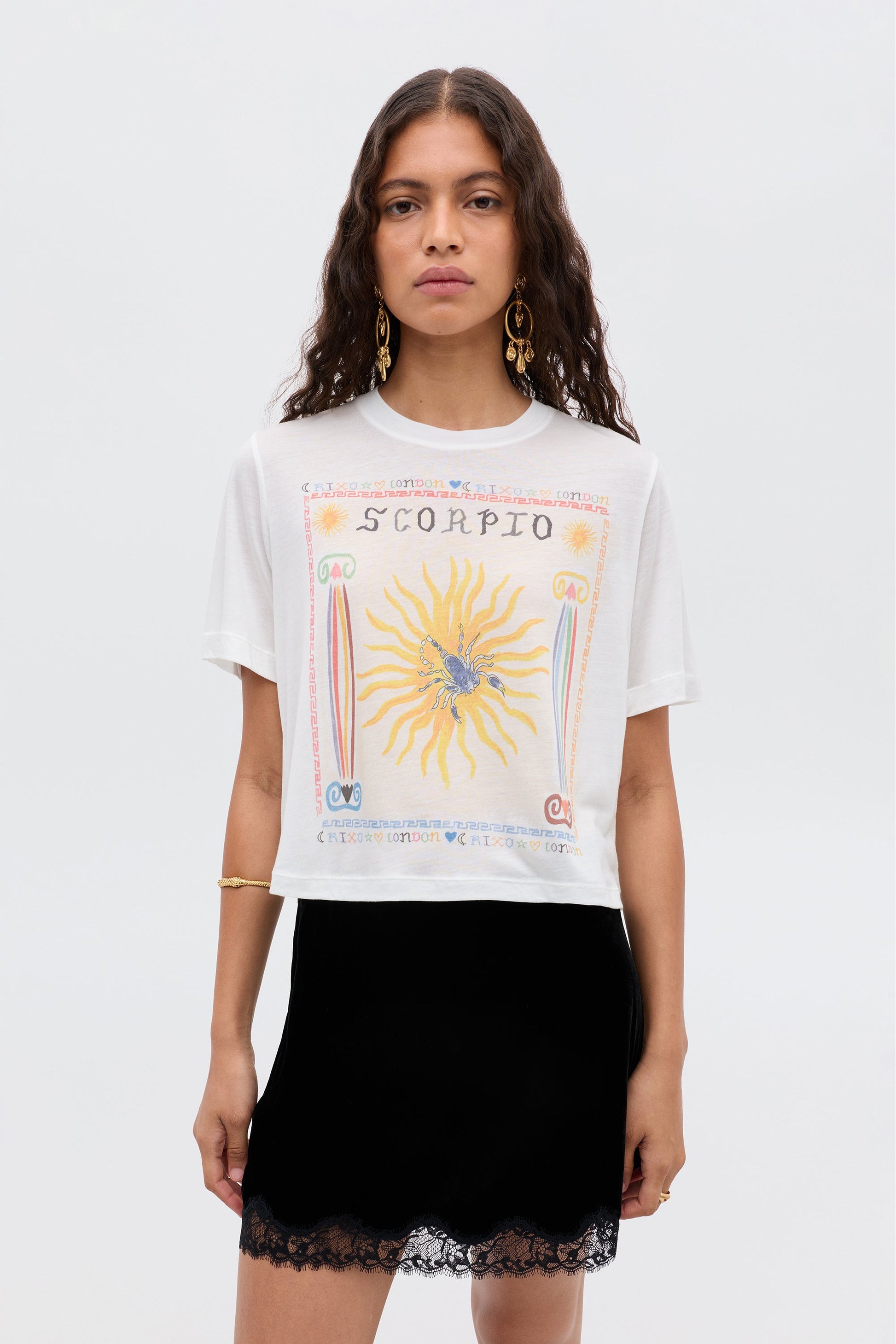Our Co-founder, Orlagh, sketched this Scorpio illustration by hand so each Ria T-shirt is unique. It's made from slightly sheer jersey with a cropped hem that's easy to tuck into your favourite RIXO skirts.