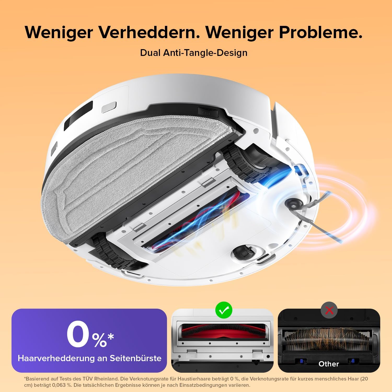 - Dual Anti-Verwirrungs-Design: Ausgestattet mit einer JawScrapers Comb Anti-Tangle-Hauptbürste und einer Anti-Tangle-Seitenbürste, sorgt dieses fortschrittliche System für einen reibungsloseren Betrieb und weniger Wartungsaufwand.