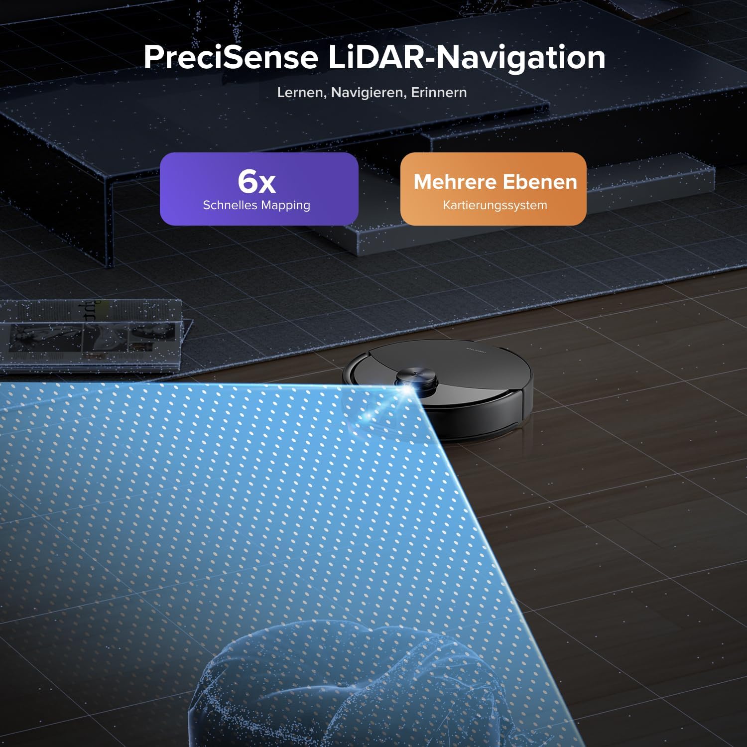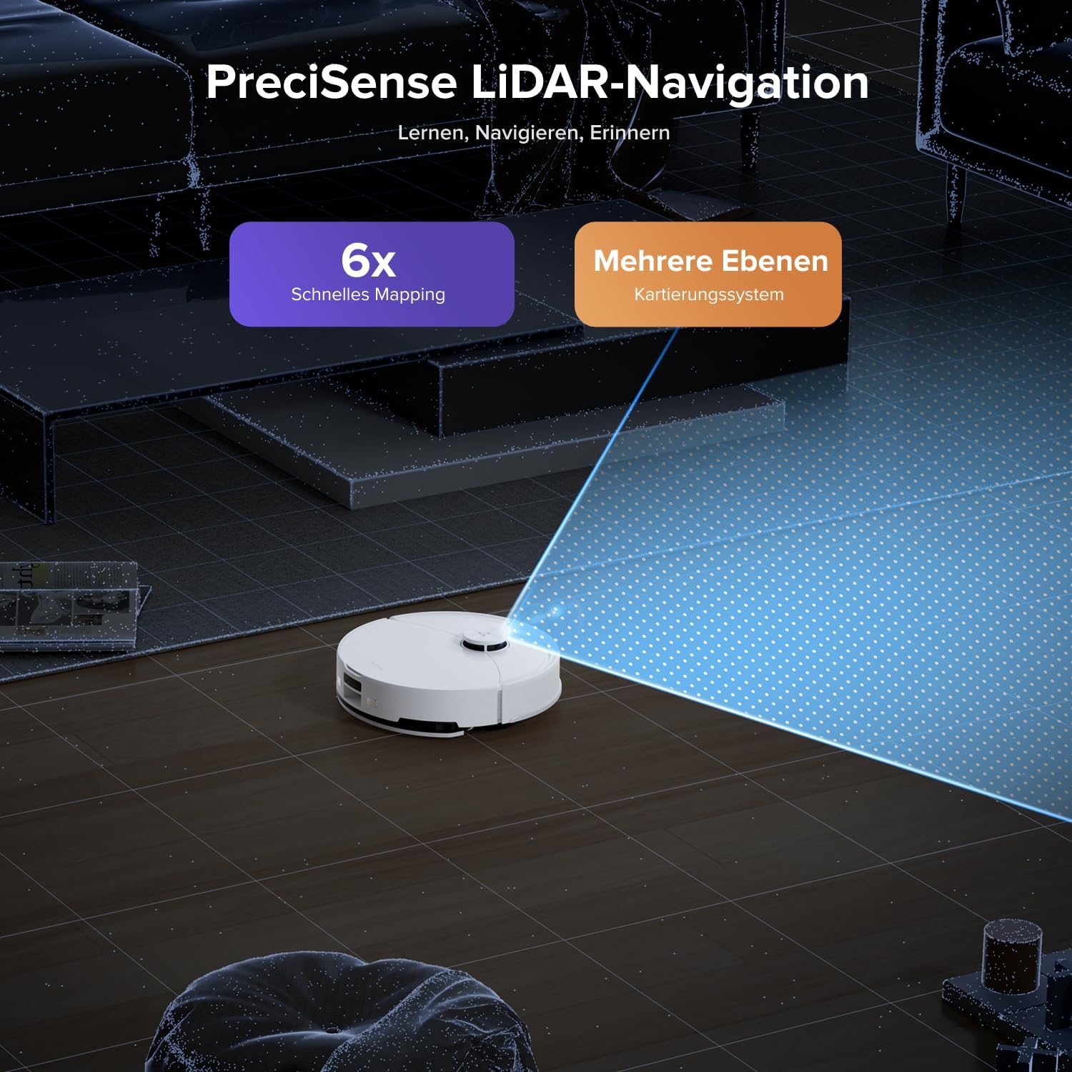 - Intelligente Teppichpflege mit Ultraschall-Erkennung: Erkennt Teppiche auf intelligente Weise und hebt die Wischmodule an, um Nässe zu vermeiden, während die Saugleistung für eine tiefere Reinigung automatisch erhöht wird. Dies sorgt für eine effektive Schmutzentfernung und ein sauberes Zuhause, ohne empfindliche Oberflächen zu beeinträchtigen.