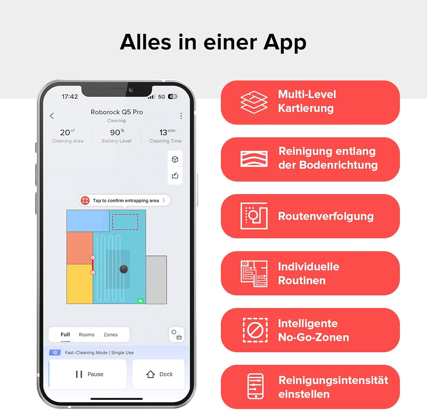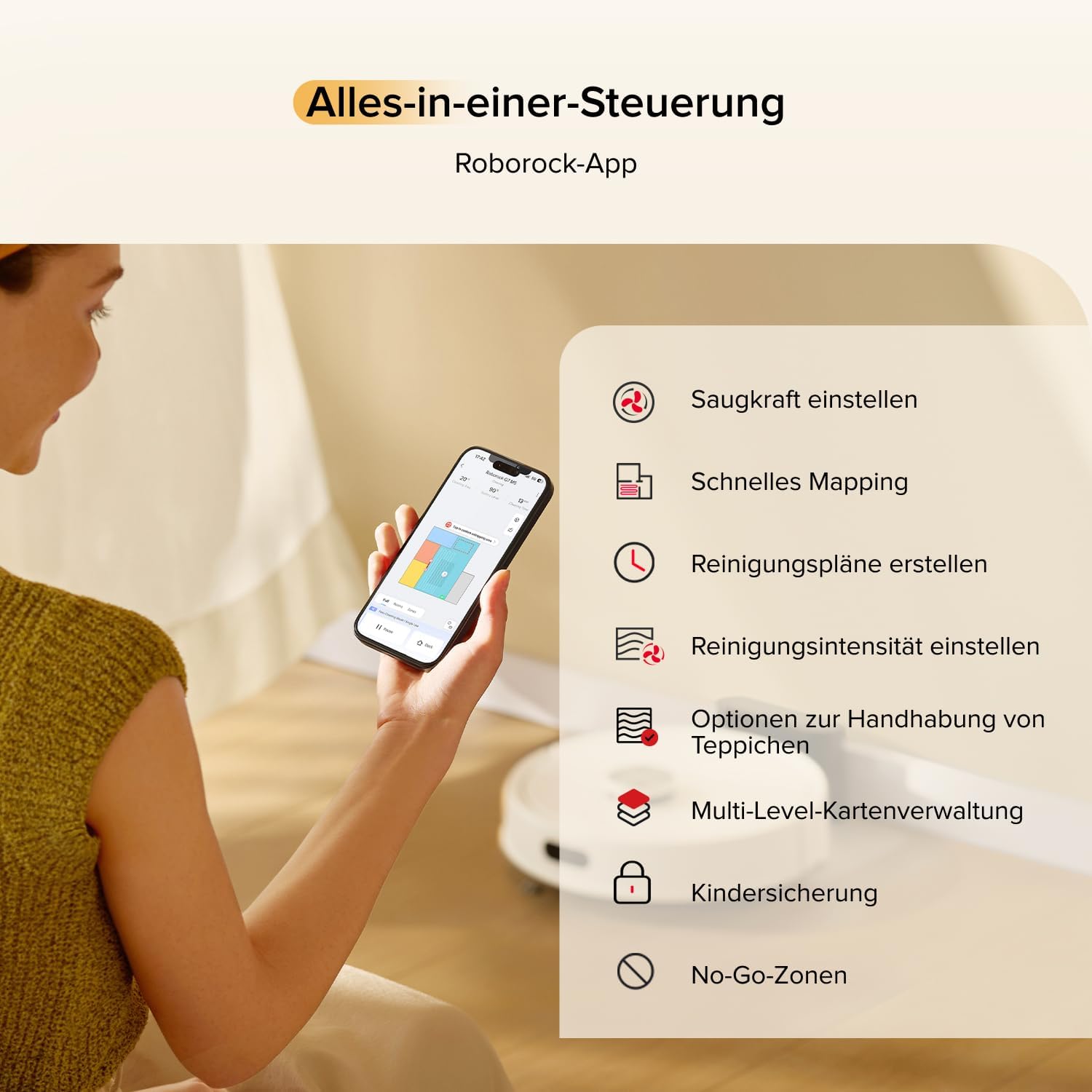 - App-gesteuerte Wischfunktion: Der elektronisch gesteuerte Wassertank bietet drei einstellbare Wasserflussstufen, um die Wischintensität an den Bodenbelag anzupassen: niedrig für Holz, mittel für Fliesen und hoch für hartnäckige Küchenflecken.