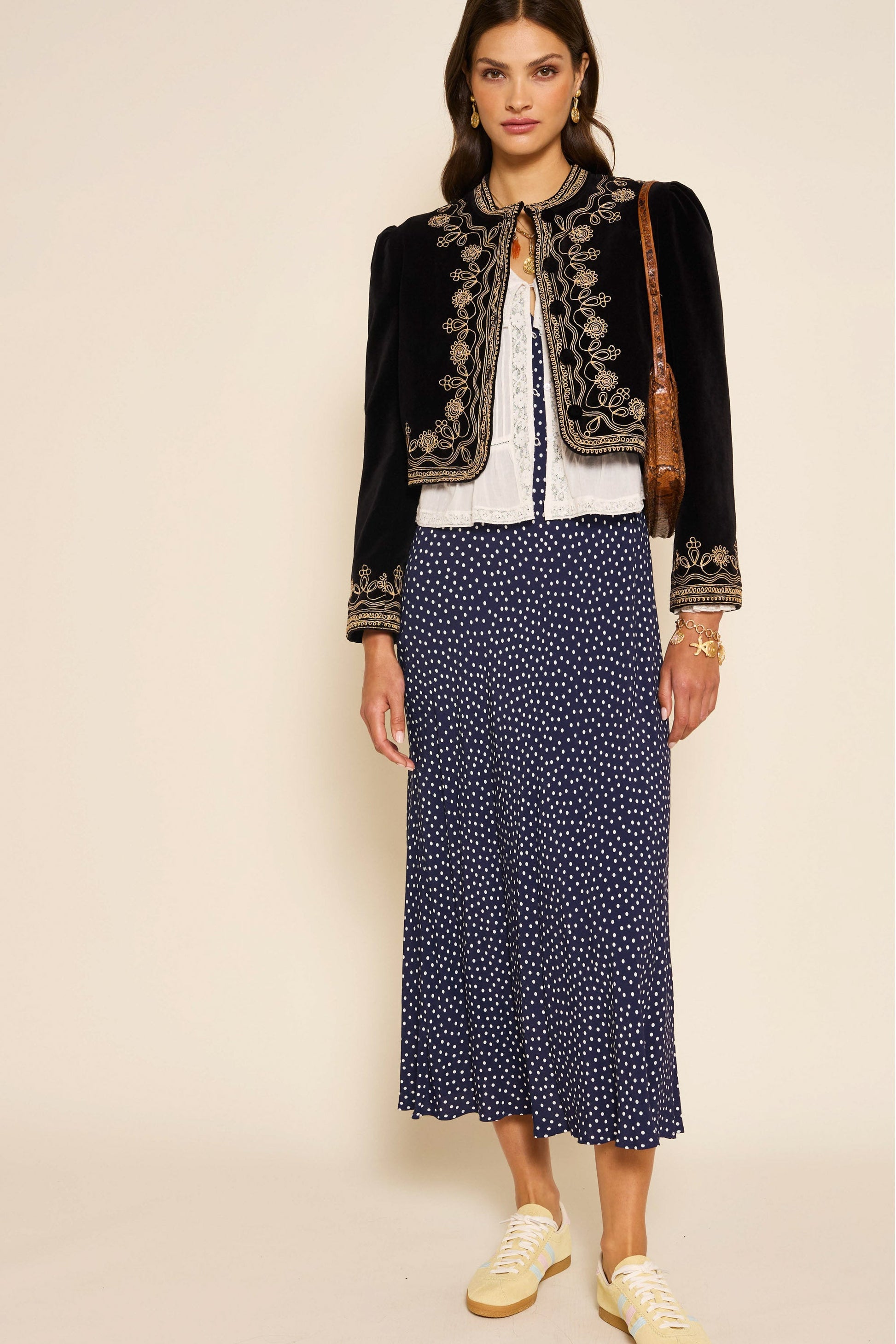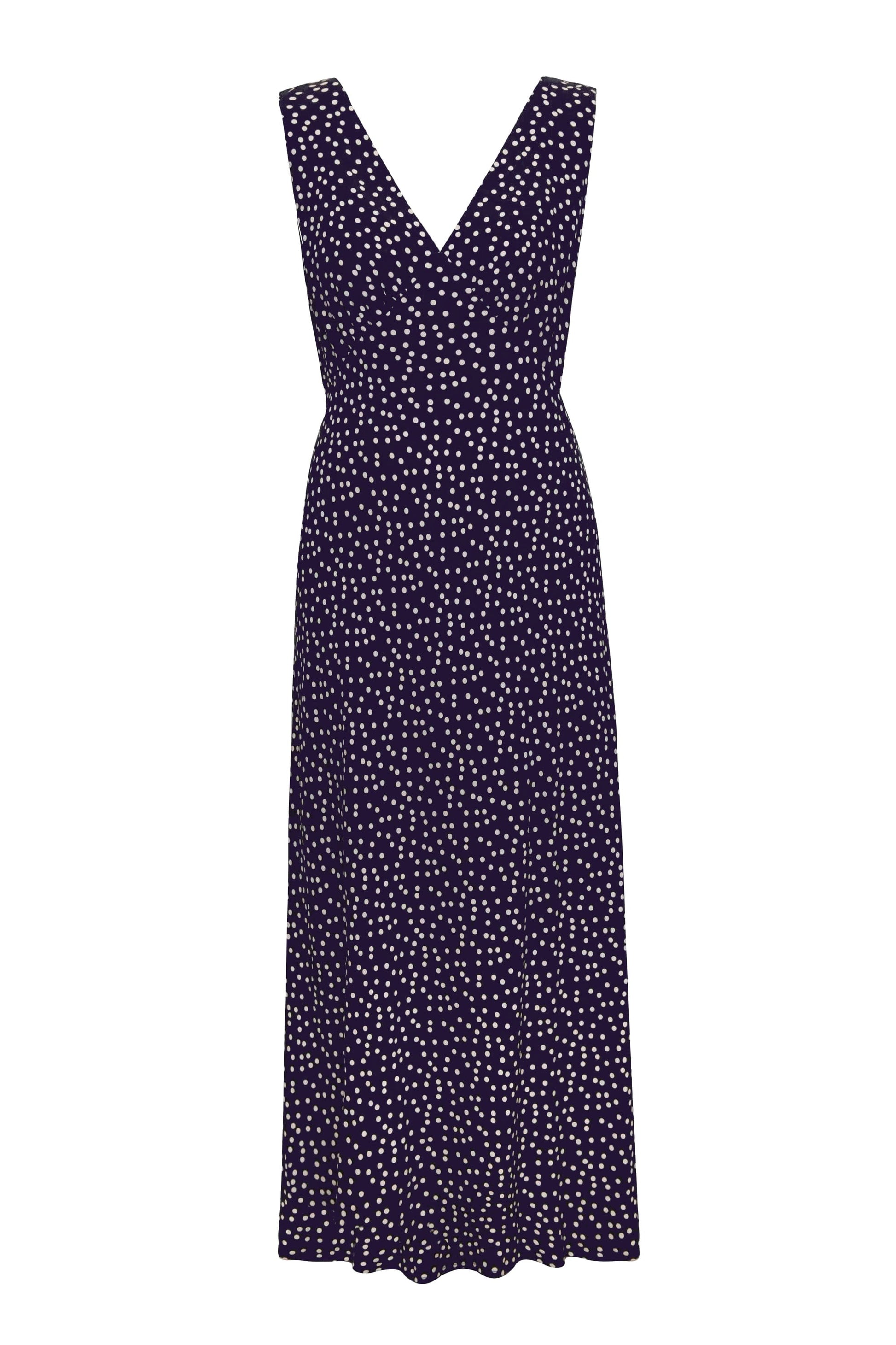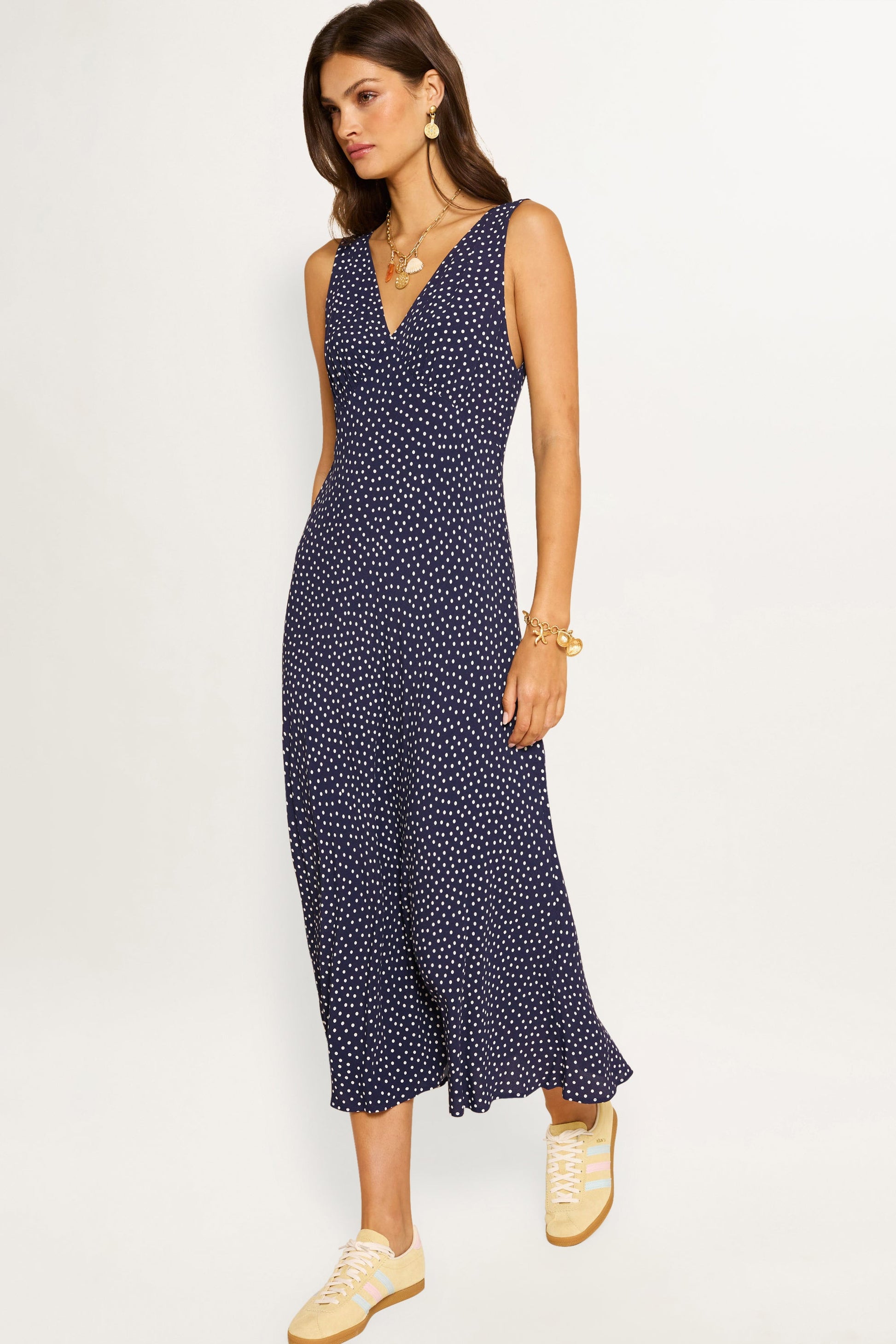 The Sandrine is an iconic RIXO style, a Thirties-inspired bias-cut slip with V-neck and V-back and a figure-lengthening empire waist. Her polka-dot print is also classic RIXO and inspired by vintage.