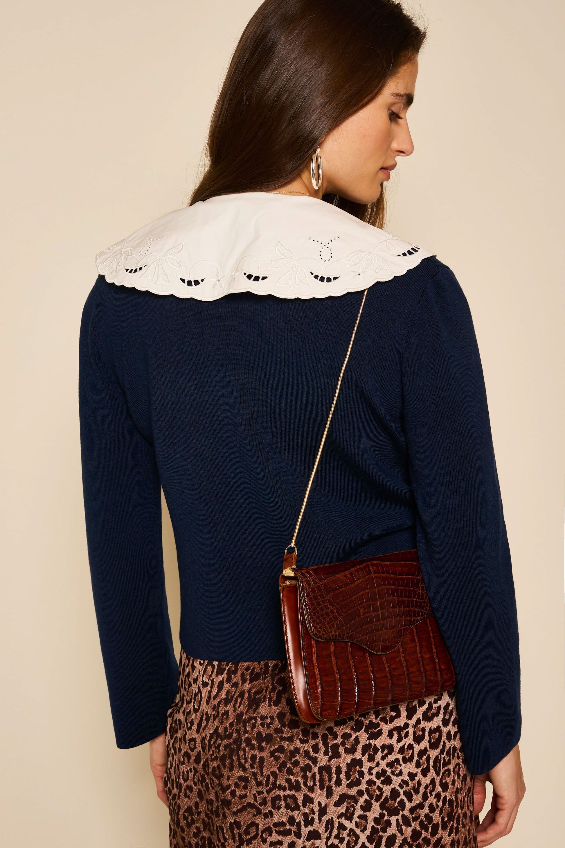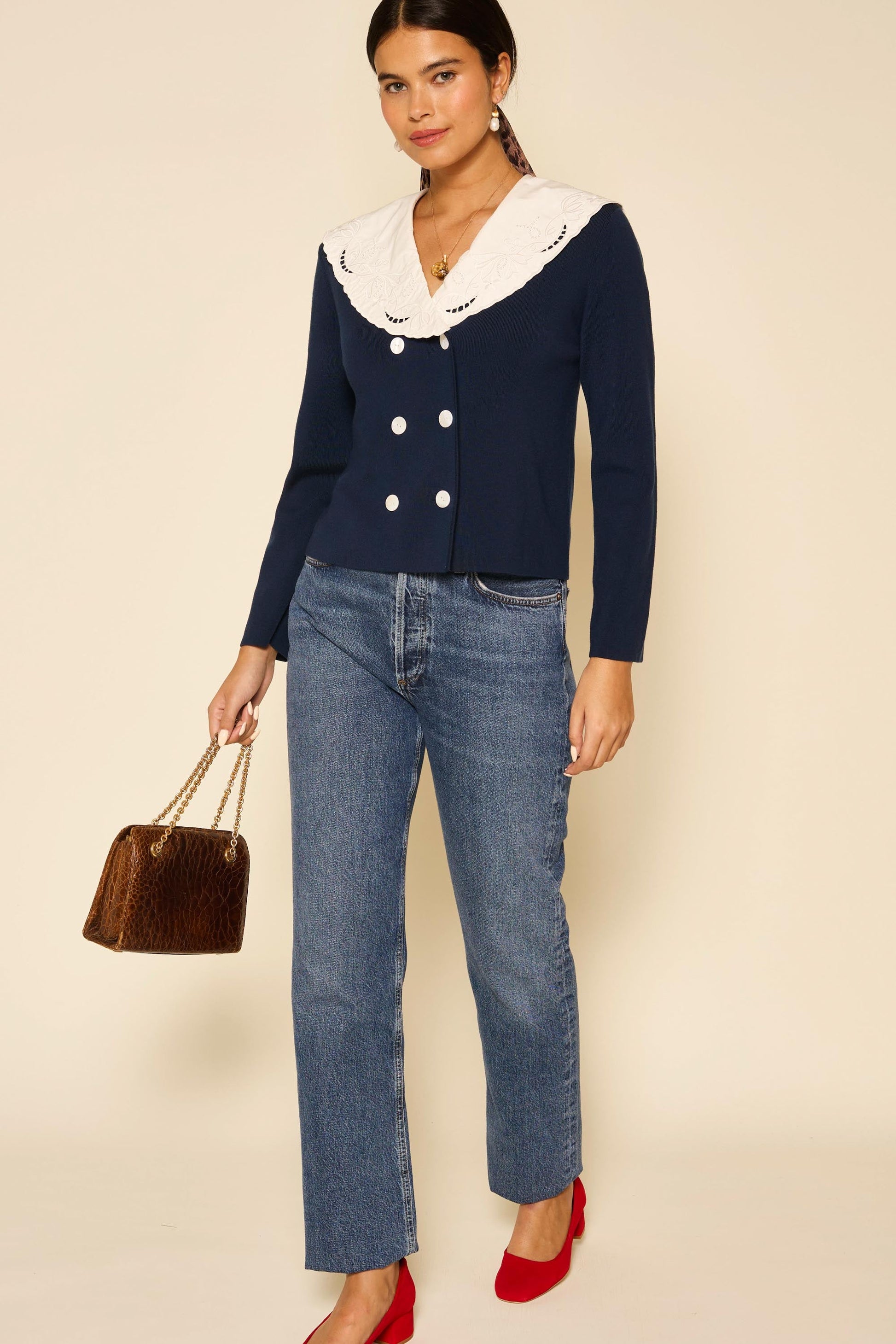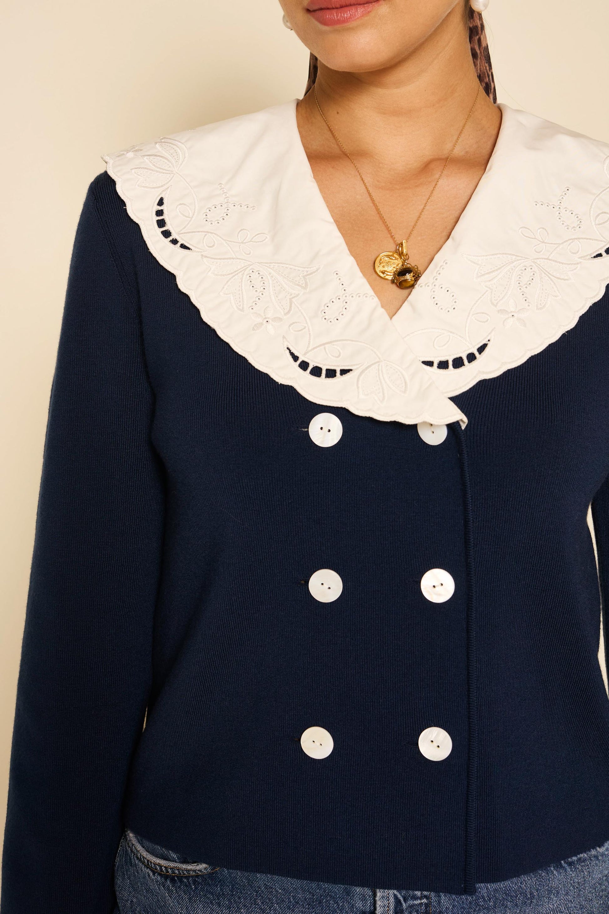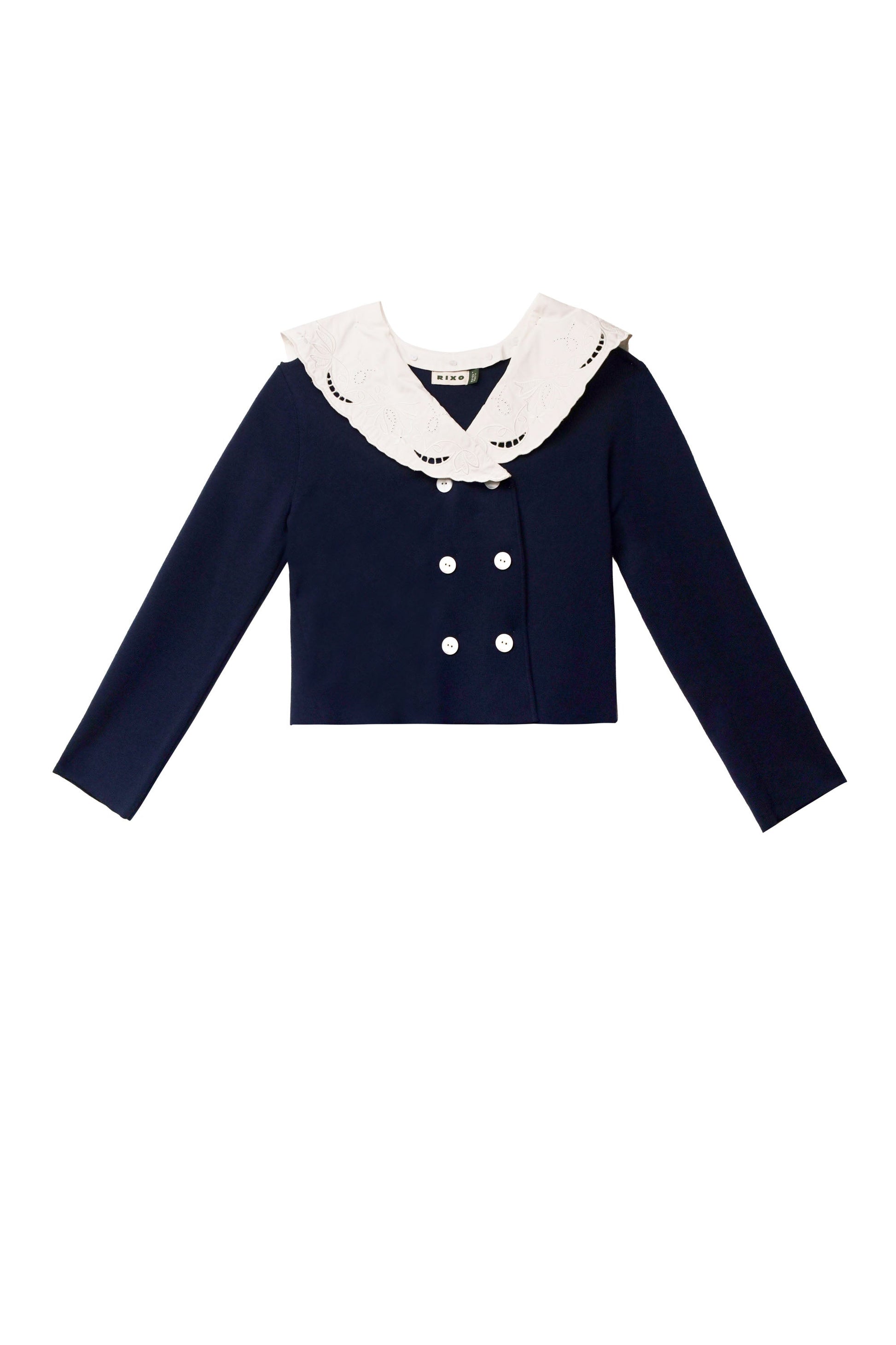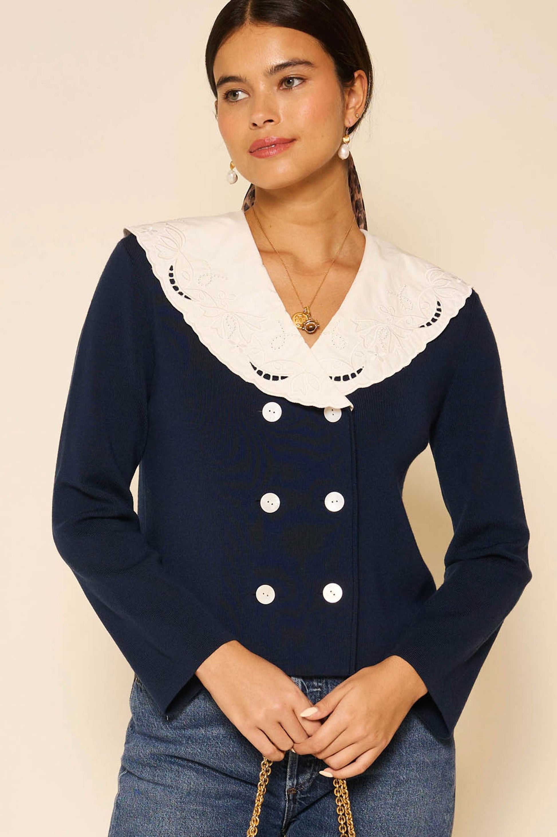 Sephoria is based on our Elettrice top, but it's knitted for warmth. The embroidered collar and double-fronted buttons lend a nautical, vintage-inspired feel.