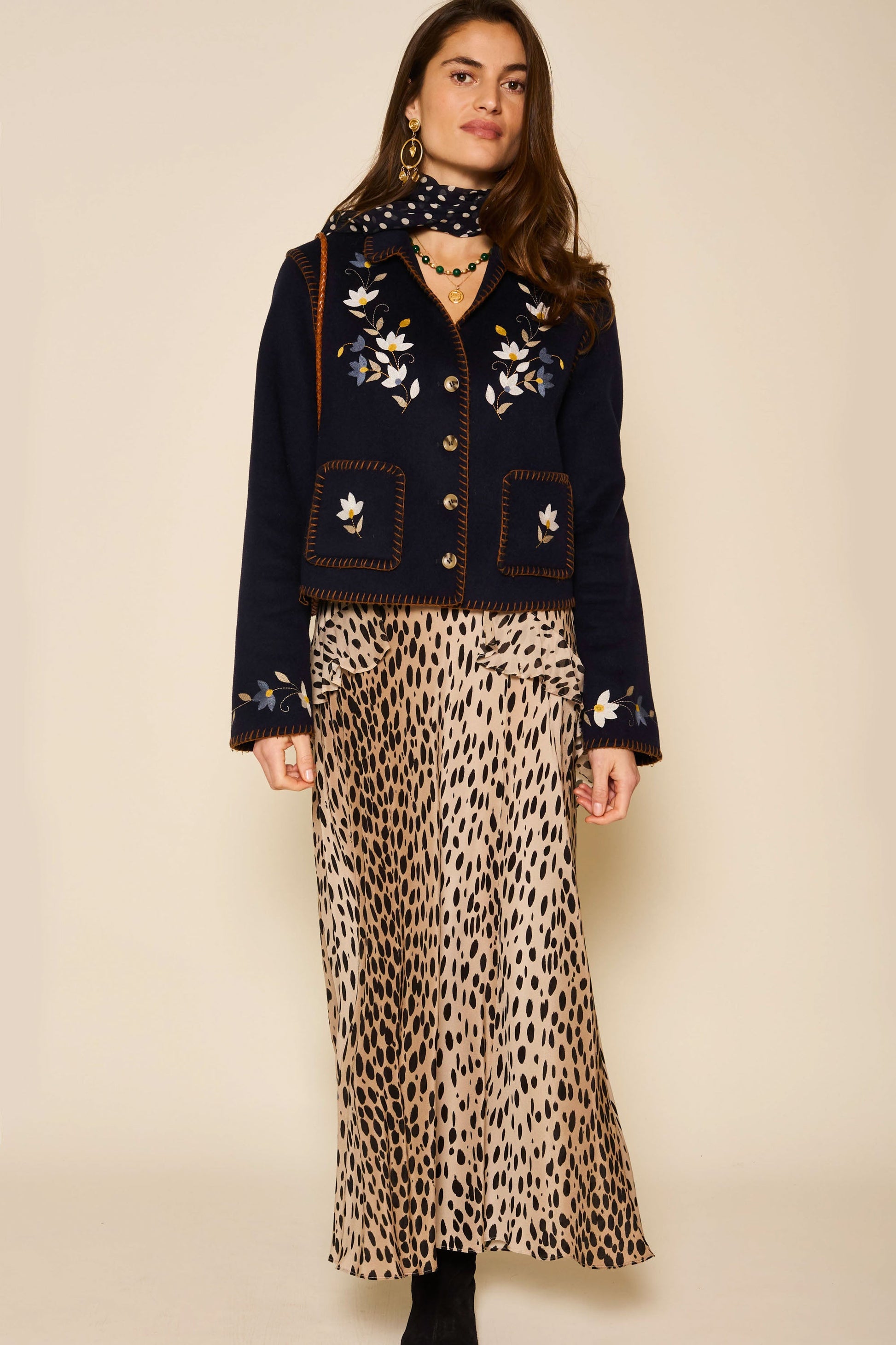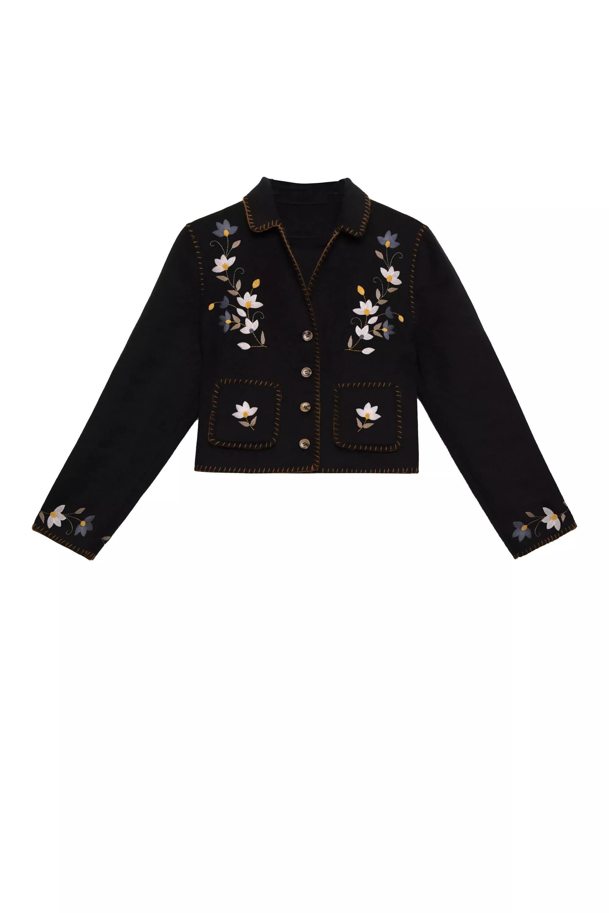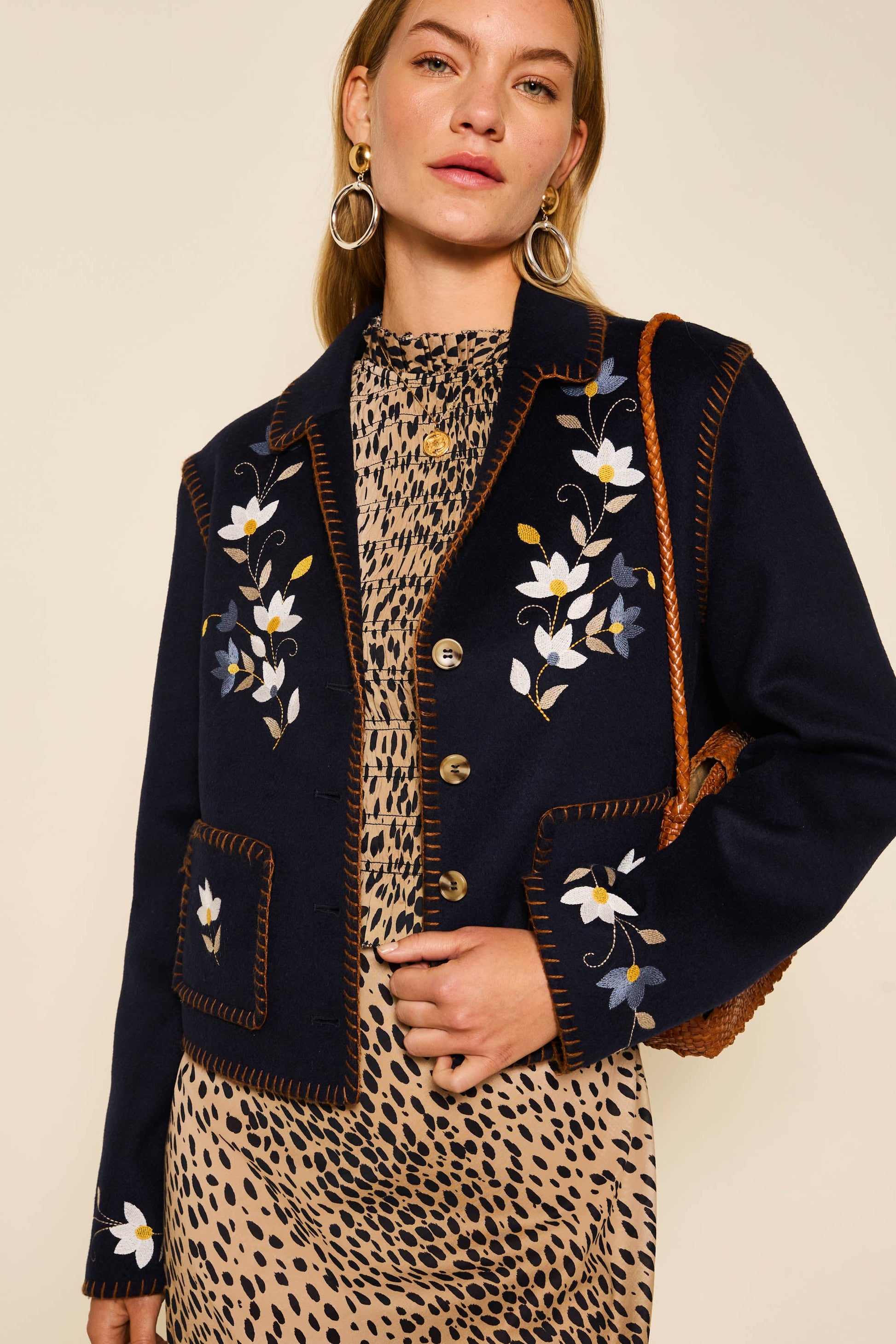 The Sunday jacket is a luxurious floral embroidered navy wool blend you can wear year-round.